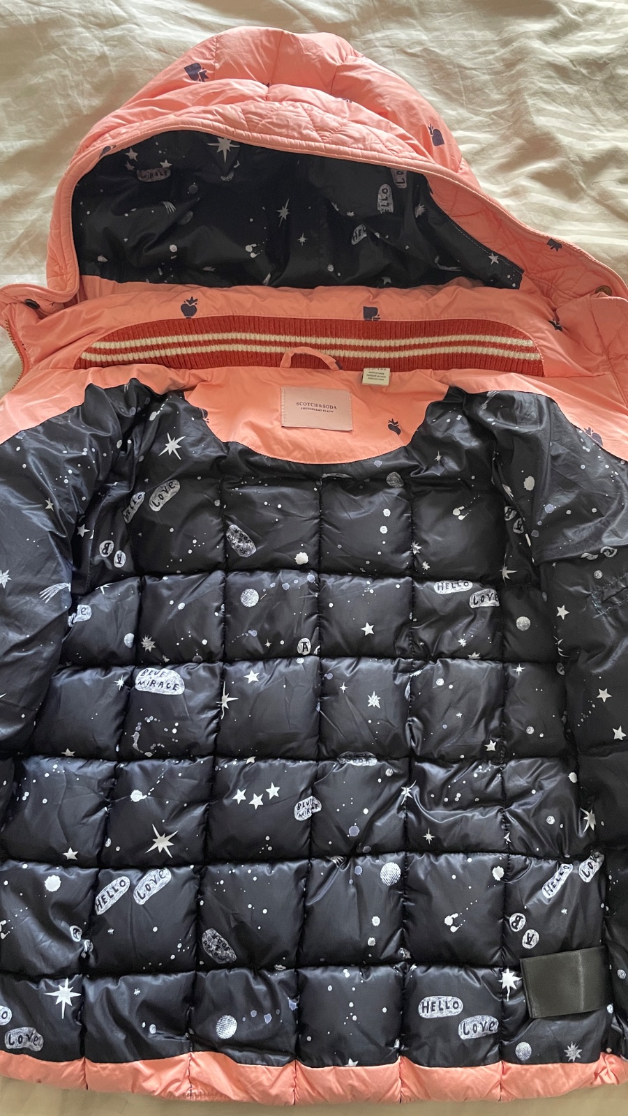 Prešívaná vetrovka, stredné hrubá, s kapucňou, s trblietavými lemami, v dobrom stave, bez poškodenia.