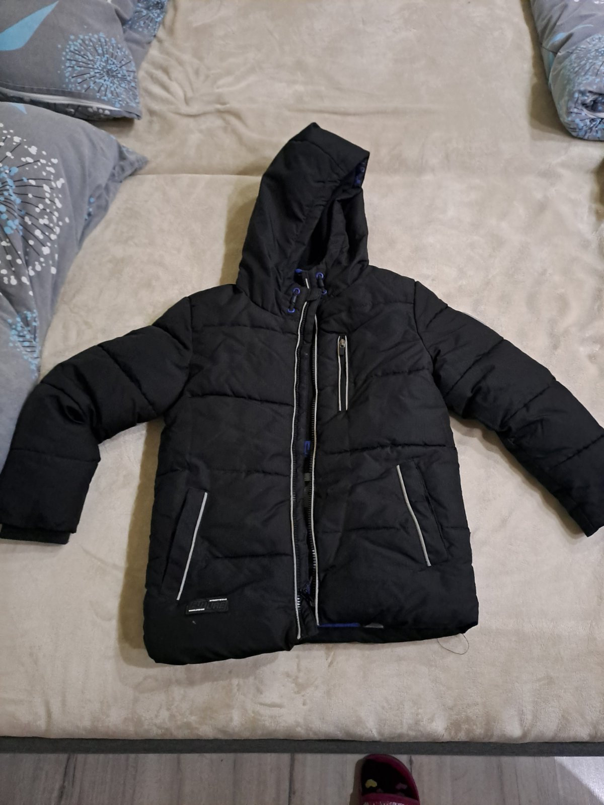 Zachovalá zimná bunda veľkosť 6-7 rokov, dĺžka zadná časť 54 cm, šírka 43 cm.