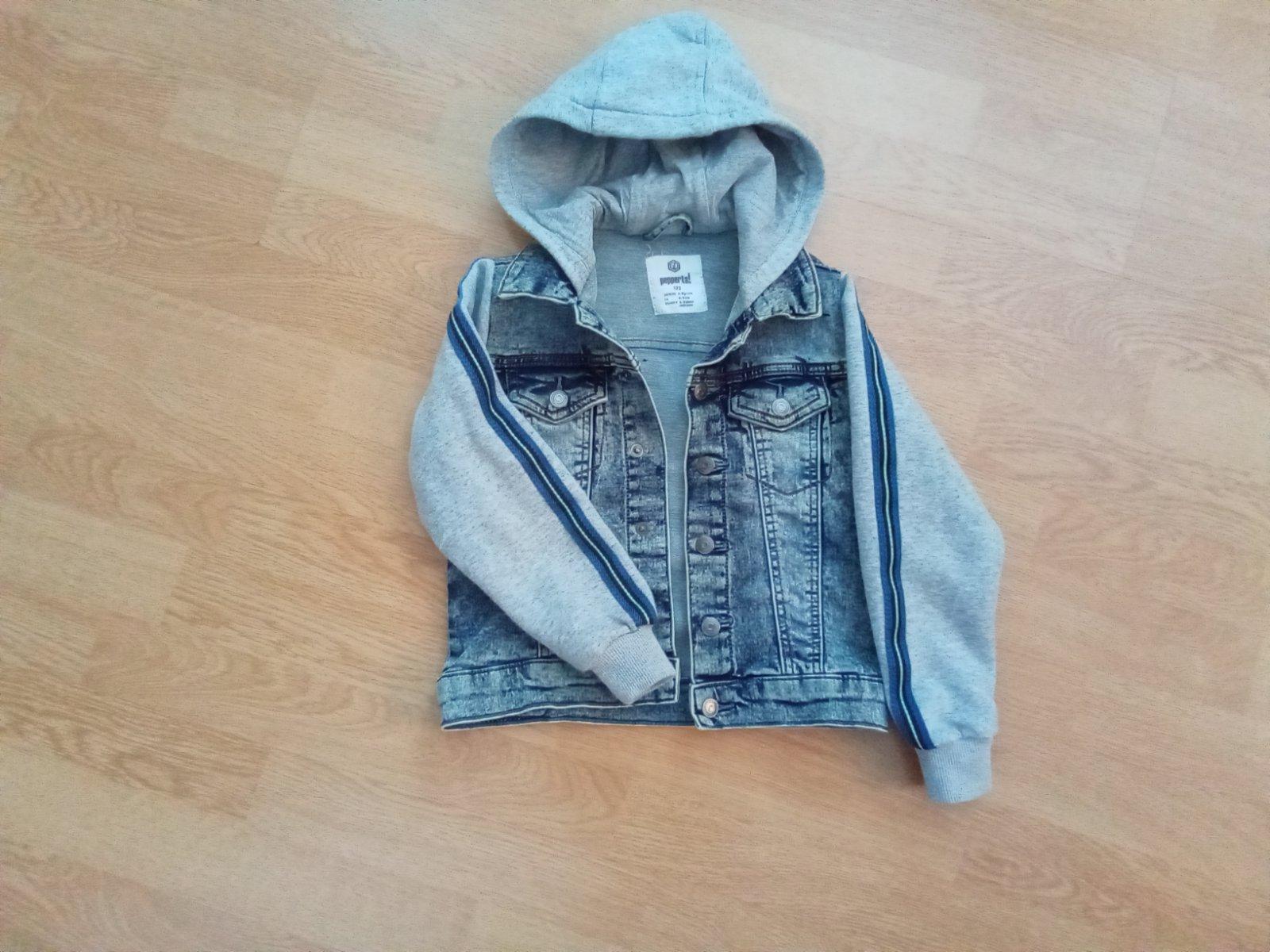 Riflová bunda s teplákovými rukávmi a kapucňou, kapucňa je odnímateľná. Veľkosť 110, top stav, asi dvakrát oblečená.
