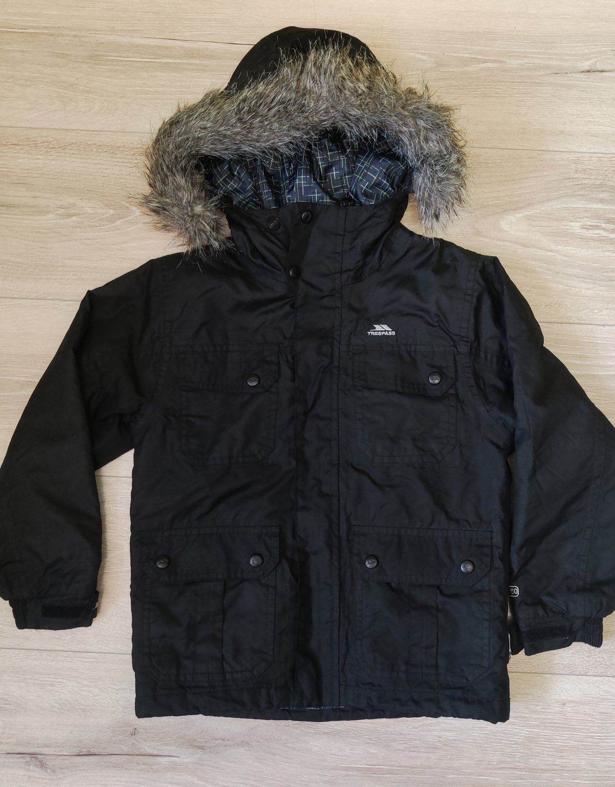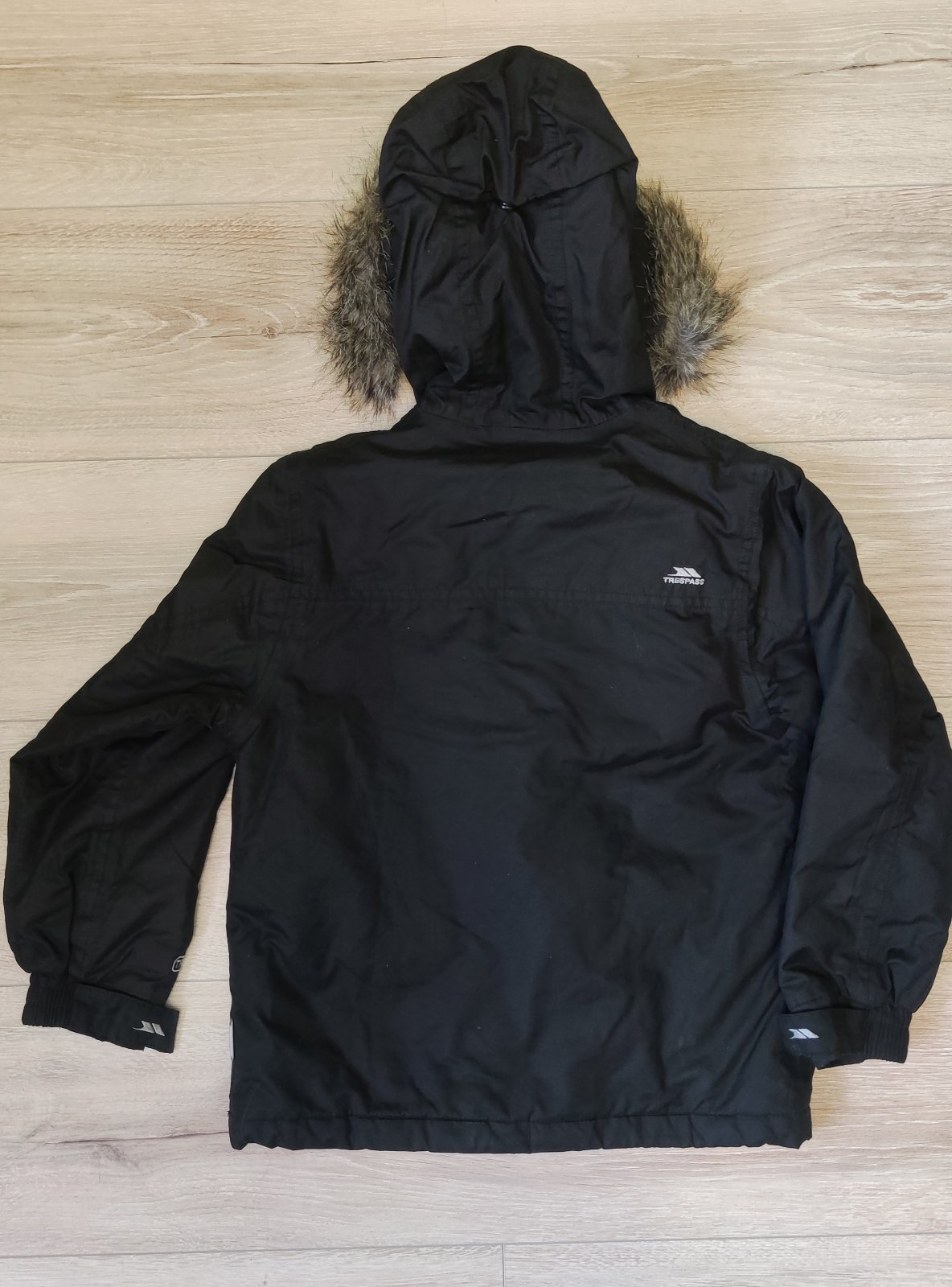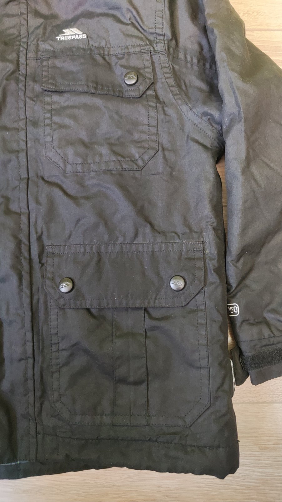 Veľmi zachovalá bundička na 5-6 rokov, vode a vetruodolná. Pekná čierna farba (fotky skresľujú). Miery: šírka 42 cm, dĺžka rukáva od ramena 47 cm, celková dĺžka 56 cm.
