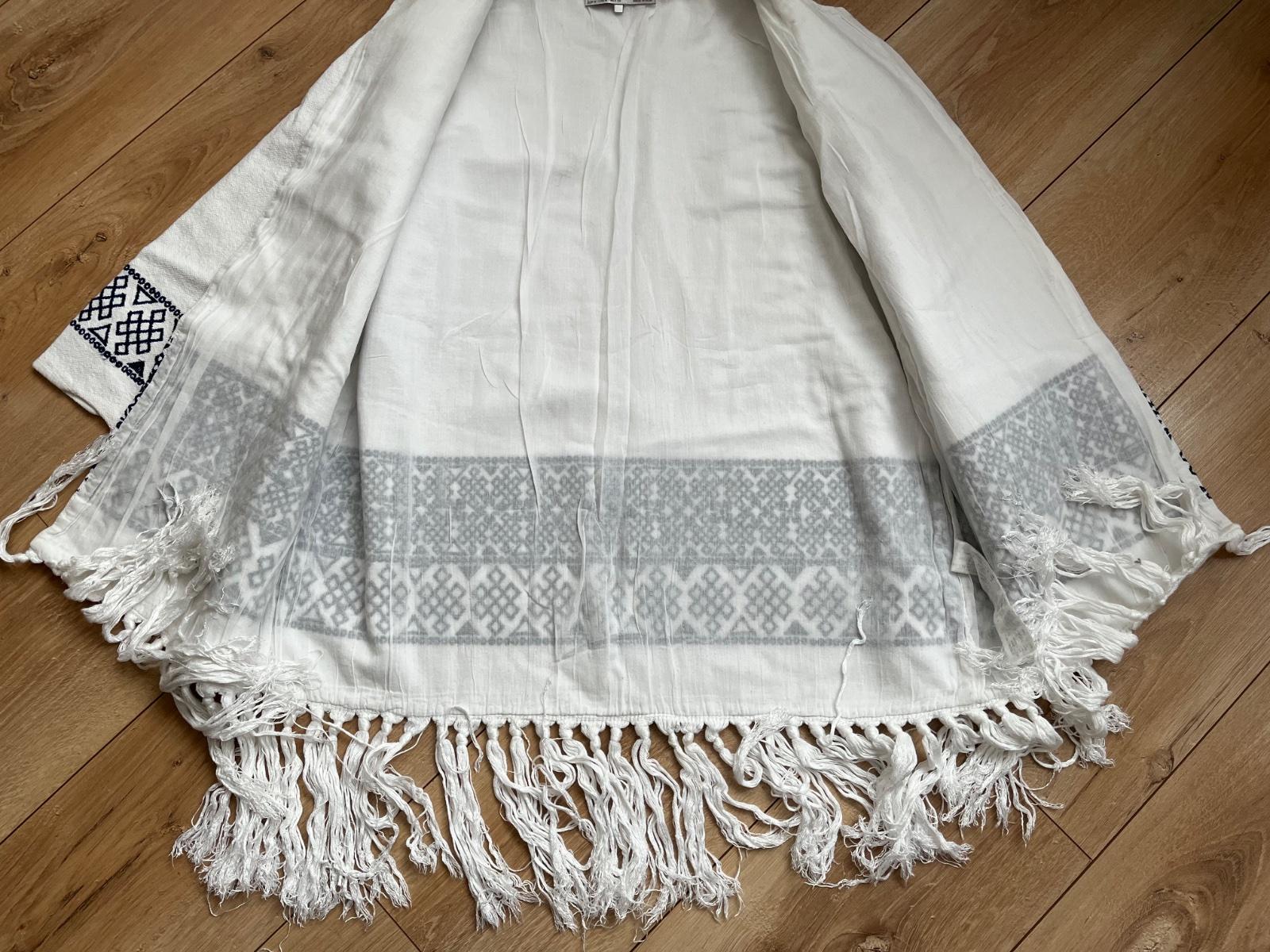 Je pekné biele, má veľký golier, je tenké, nie je podšité, vo vnútry sa zapína na viazačku a z vonku na 1 veľký cvočik, nie je elastické. Málo nosené!