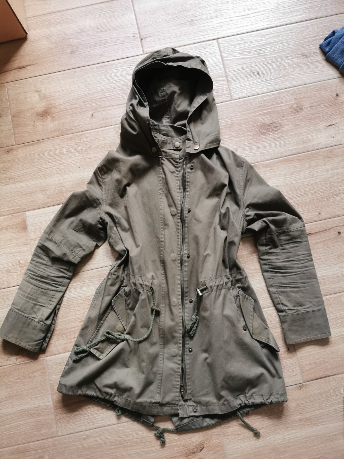 Nosený ale v peknom stave. Farbu kaki som nevedela zachytiť. V páse šnúra, rukávy sa dajú pripnúť vyššie a kapucňa dat dole
