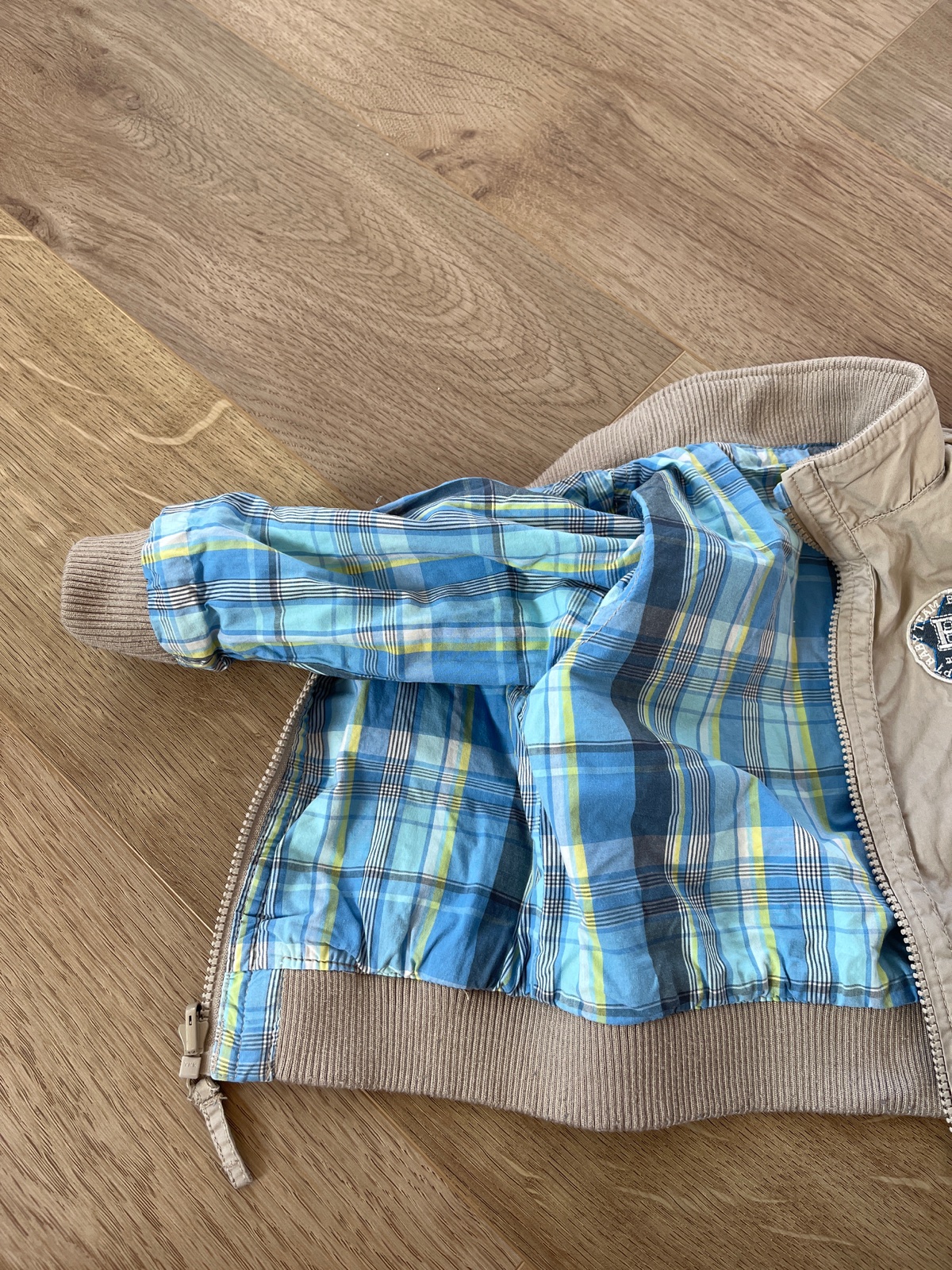 Chlapcenska prechodna obojstranna bundicka zn.H&M velkost 86. Rozmery: Dlzka 32 cm Sirka: 32 cm Rukav - od krku 35 cm - pod pazuchou 23 cm