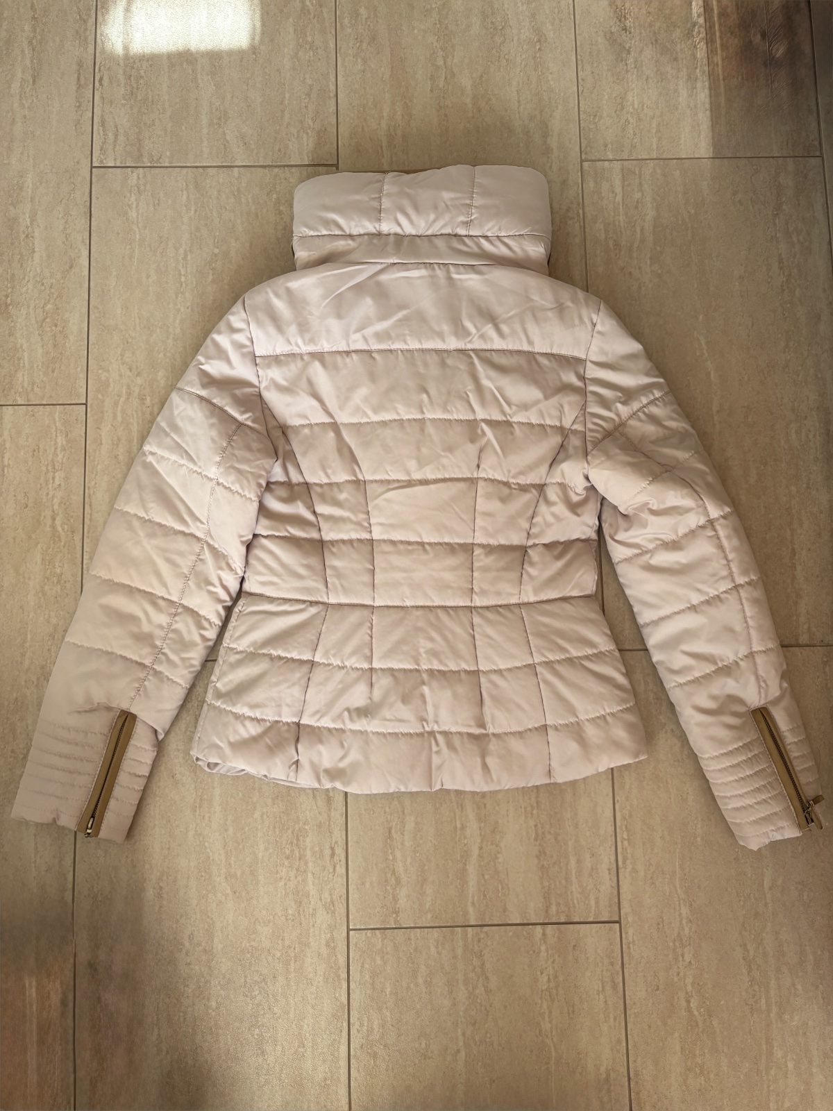 Tenká dámska bunda veľkosti S, ale sedí na postavu M. Menšie chyby (slabý fľak pri vačku, z vnútornej strany dve malinké dierky na podšívke).