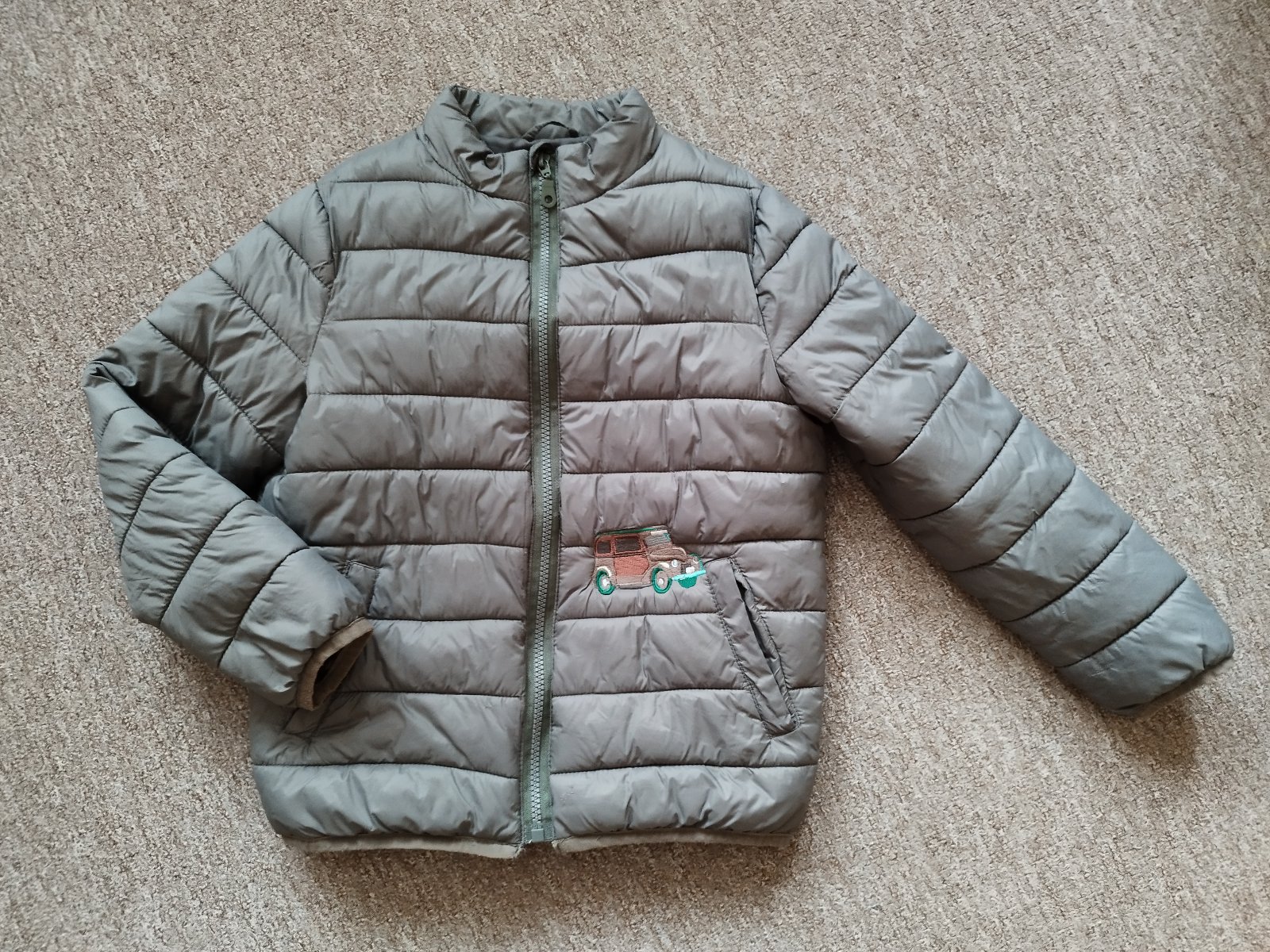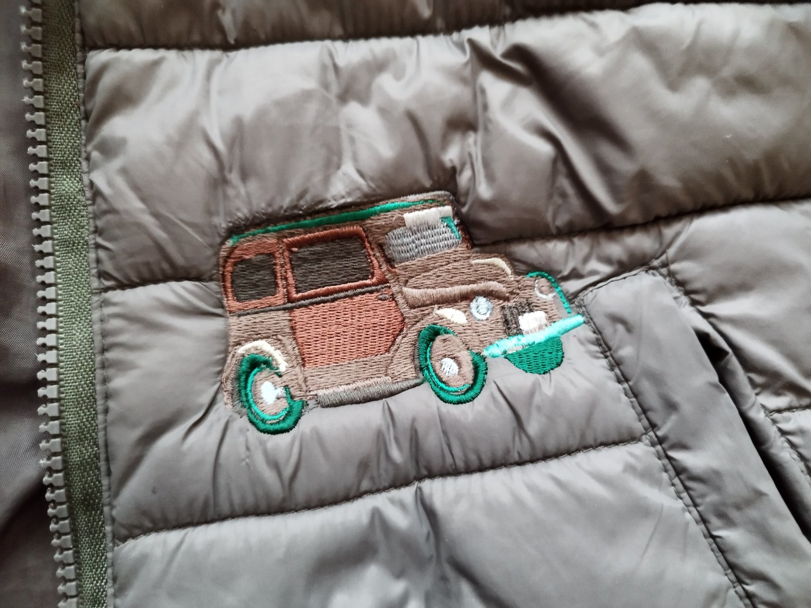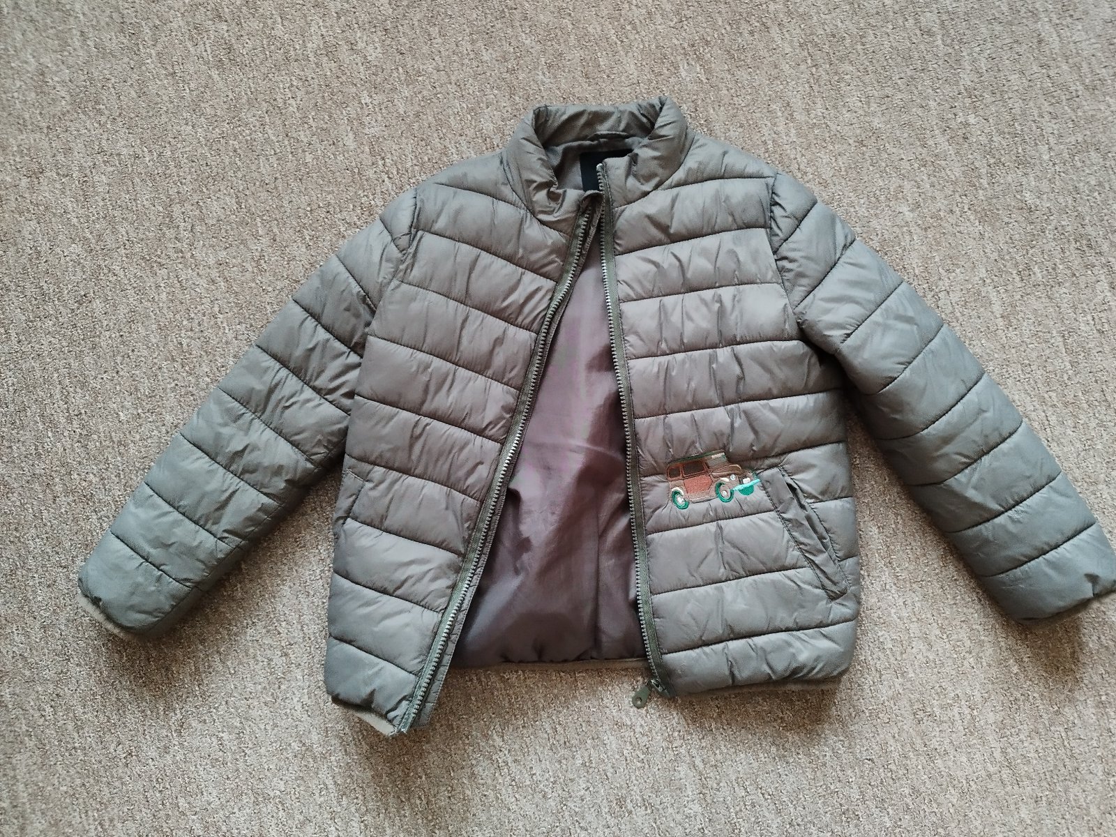 Je vhodná na zimné obdobie trocha tenšia, ale teplá. Na chladnejšiu jar/ jeseň sa tiež dá. Má takú sivozelenú farbu, ja to volám plastelinová, pretože to nie je ani sivé ani hnedé ani zelené, niečo medzitým. Na ľavom boku je výšivka autíčko. Veľkosť na visačke bola 7-8rokov, ale syn je chudší a nosil to aj keď mal 9rokov.