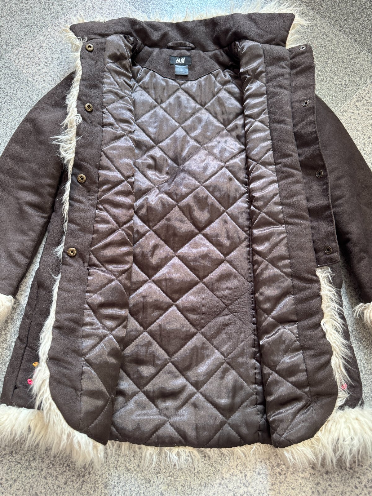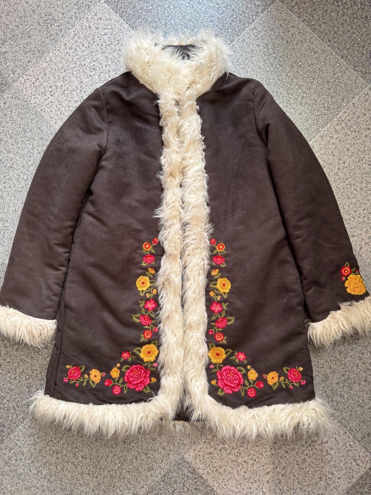 Nosený prechodný kabátik v imitácii tmavého velúru a kožušinky, s vyšívaním ruží. Kabátik je mierne zateplený. Má známky bežného používania, bez poškodení, dobrý stav. Vhodný od veľkosti 116 do 128, ktorá je uvedená na visačke.
