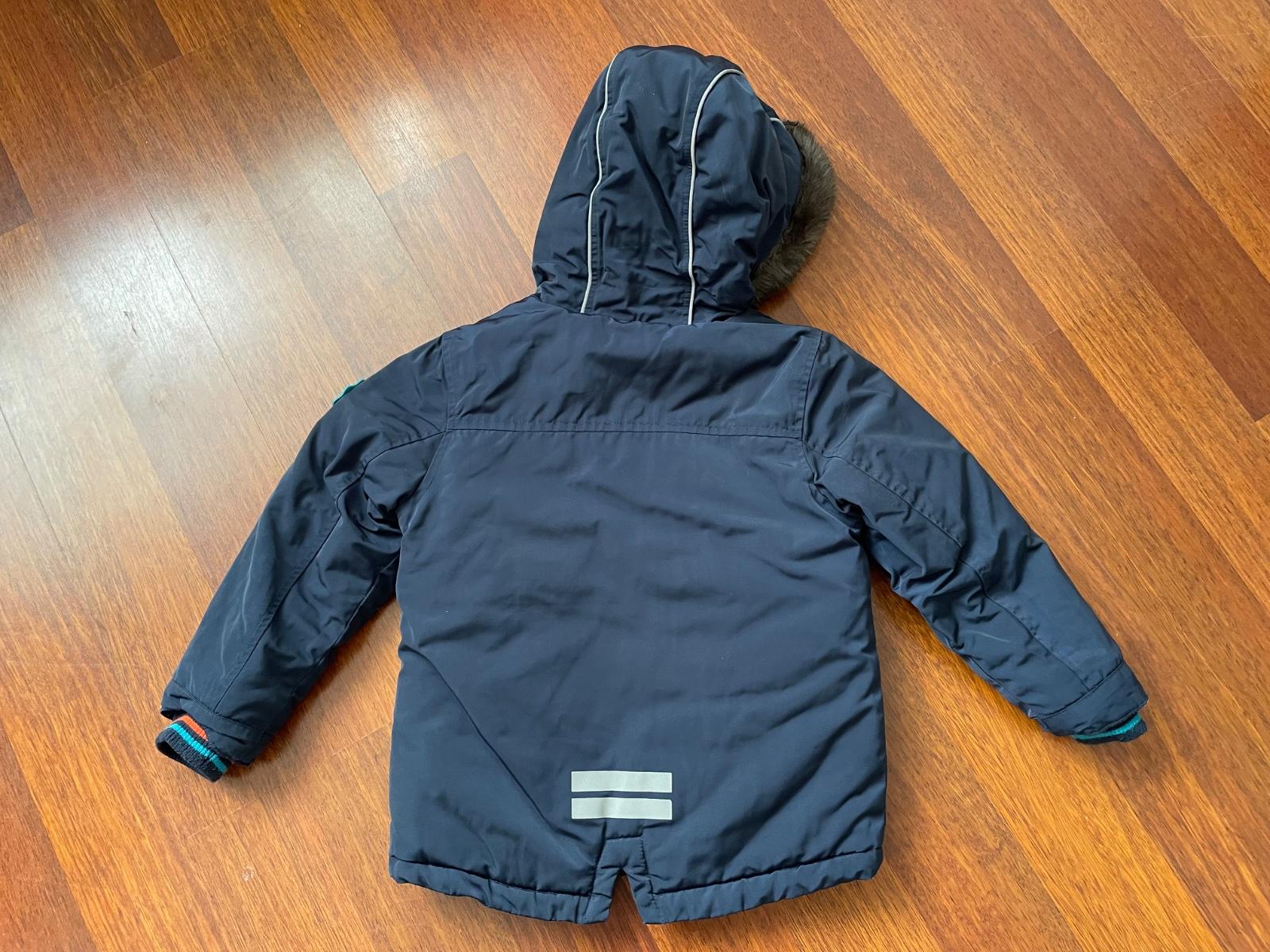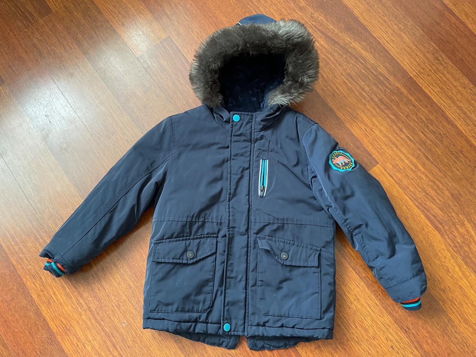Pekný noseny stav, vo vnútri ovečka. Kožušina na kapucni stále pekná. Veľkosť písaná 122 ale je menšia, treba sa riadiť rozmermi. Preto uvádzam 116. Verím že ešte niekomu poslúži a mne sa uvoľní ...