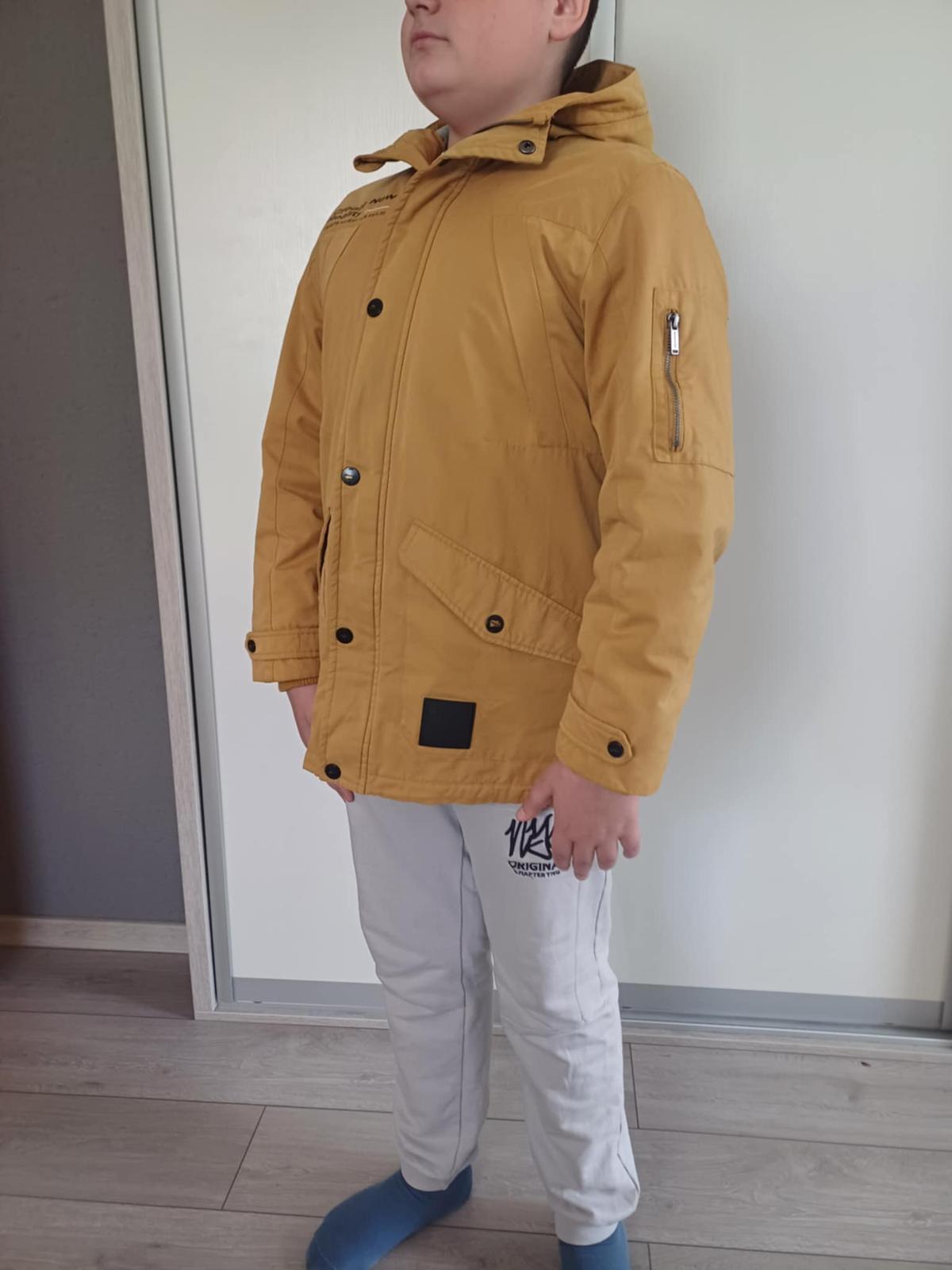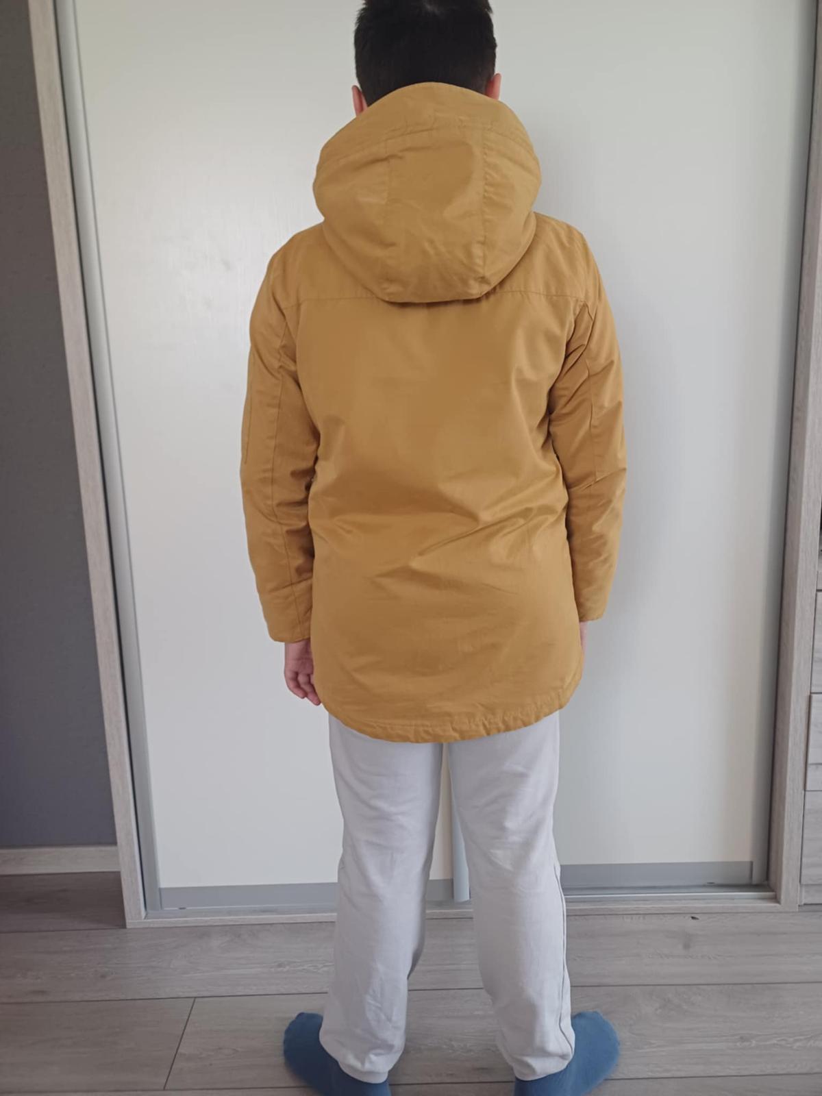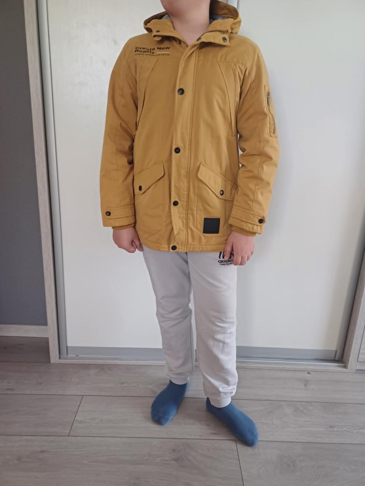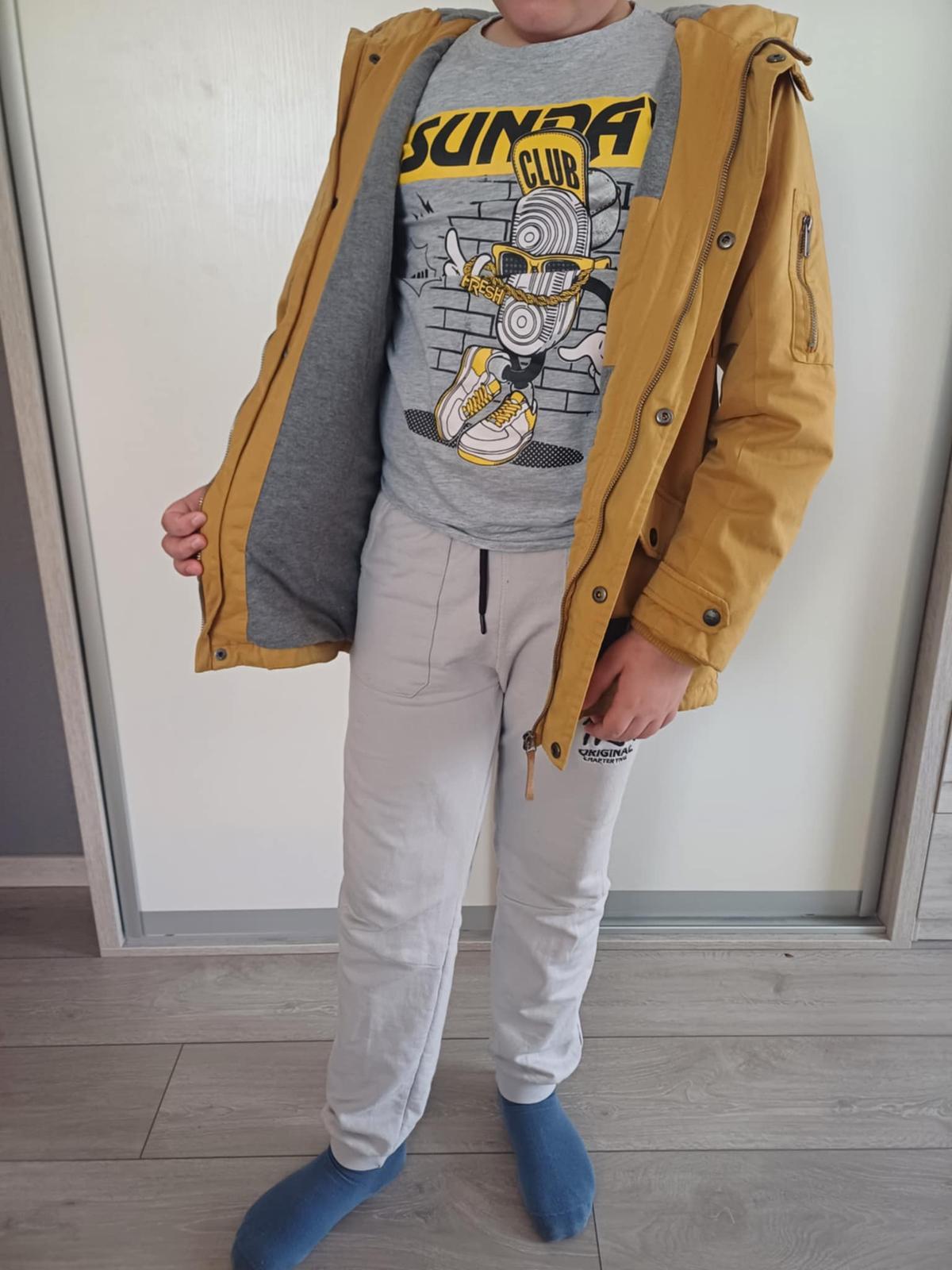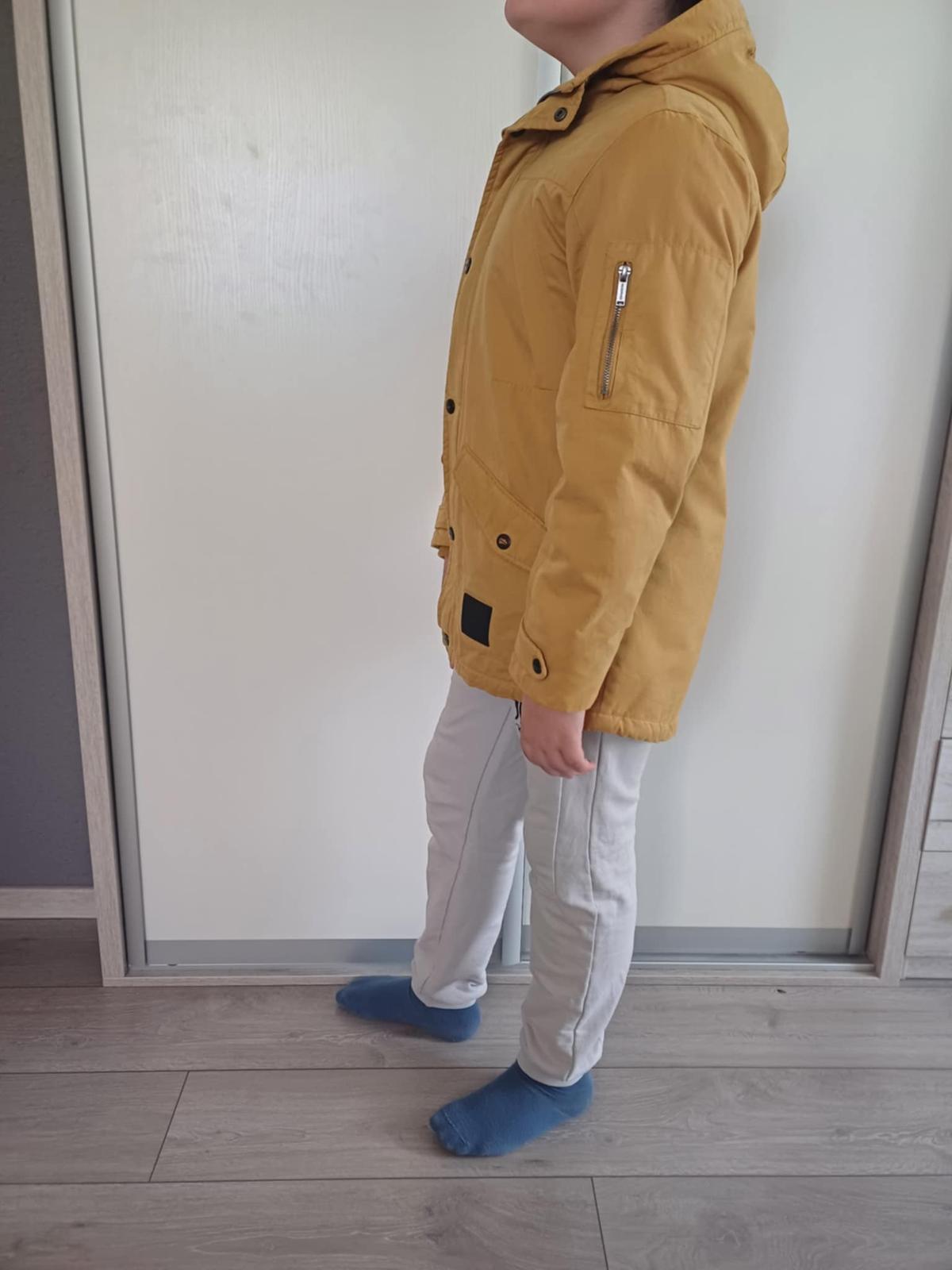 Zachovalá chlapčenská prechodná bunda, má tenkšie vatovanie a podšívka je z úpletu, takže je vhodná na prechod zima/ jar, alebo jeseň/zima. Veľkosť 158, napredu má nakladané vrecká,