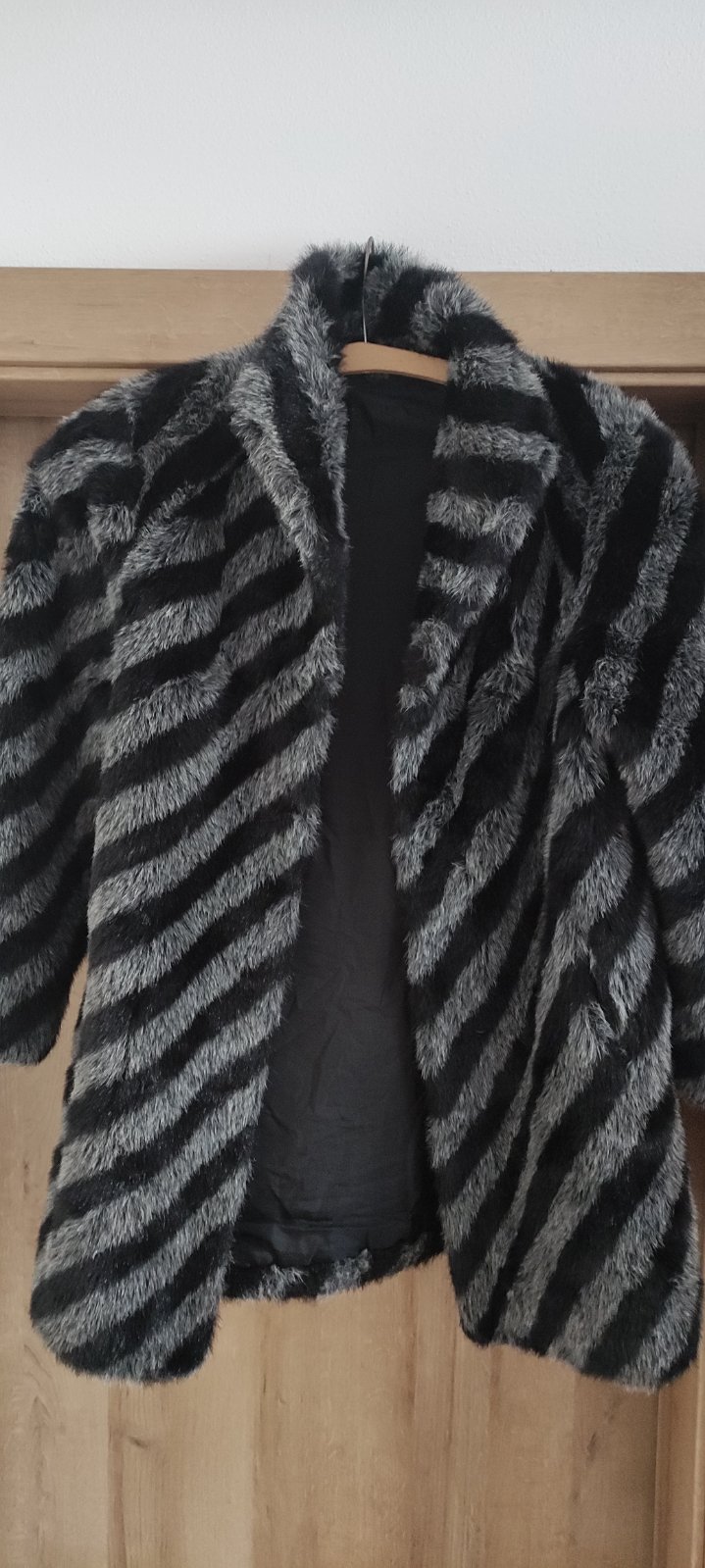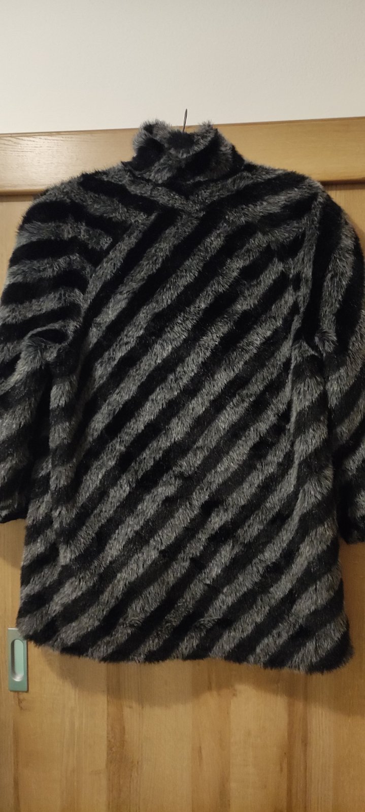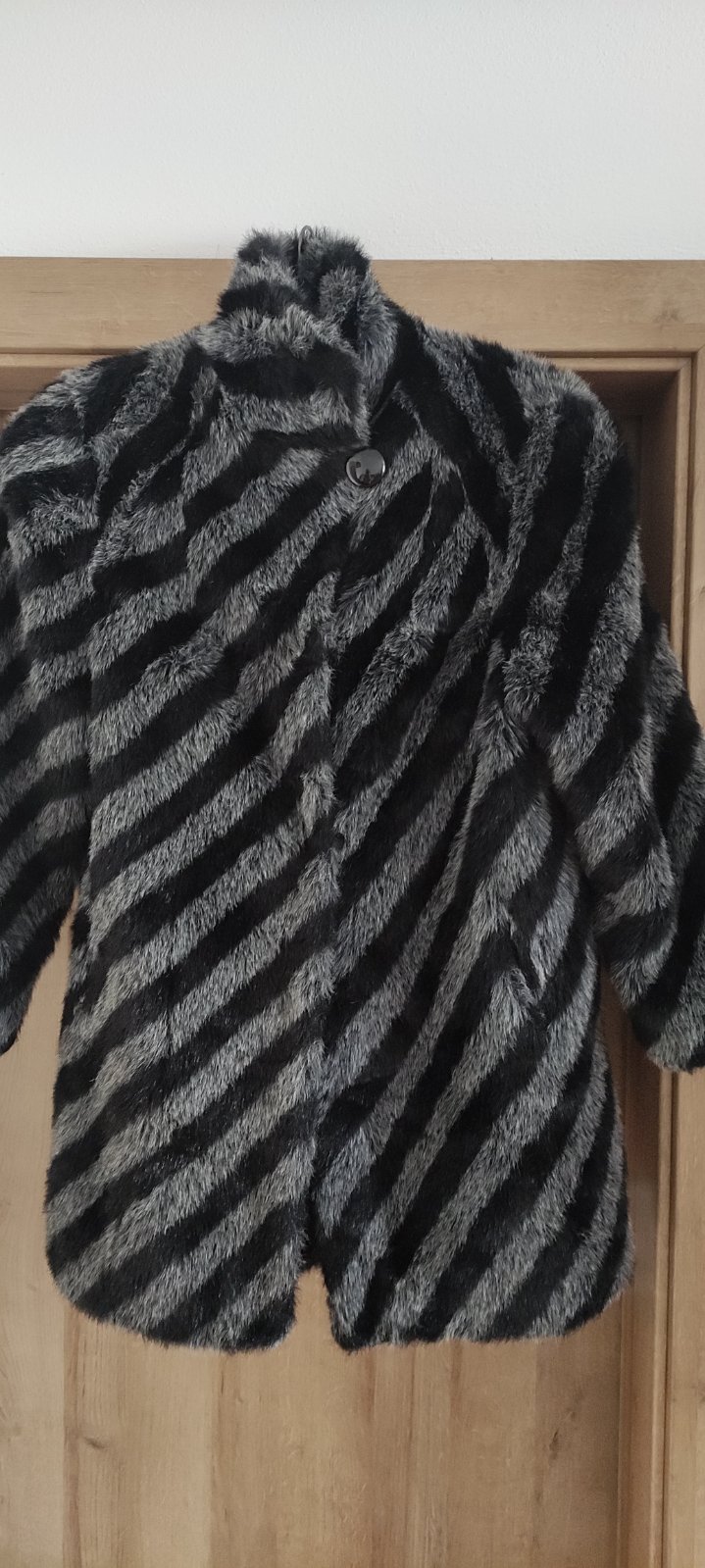 Umelý kožuch zn. Kara, veľkosť písaná 44, sedí od 38 po cca 42 . Šírka pod prsiami 55 cm, rukáv od ramena 57 cm, dĺžka 83 cm. Kabát je v bezchybnom stave, oblečený párkrát.