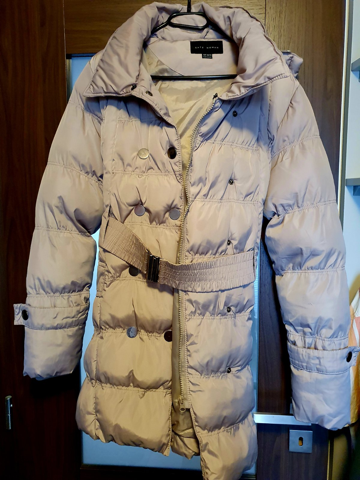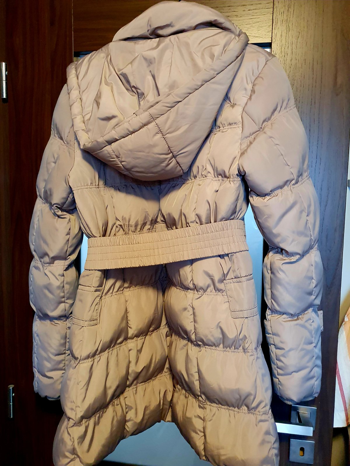Dlhší, teplý zimný kabát/bunda na zips s kapucňou, 2 vrecká vpredu, v páse snúrka na sťahovanie, nosená jednu zimu, v perfektnom stave. Miery: dĺžka 86 cm, zadný diel 89 cm, šírka 50 x 2 cm.