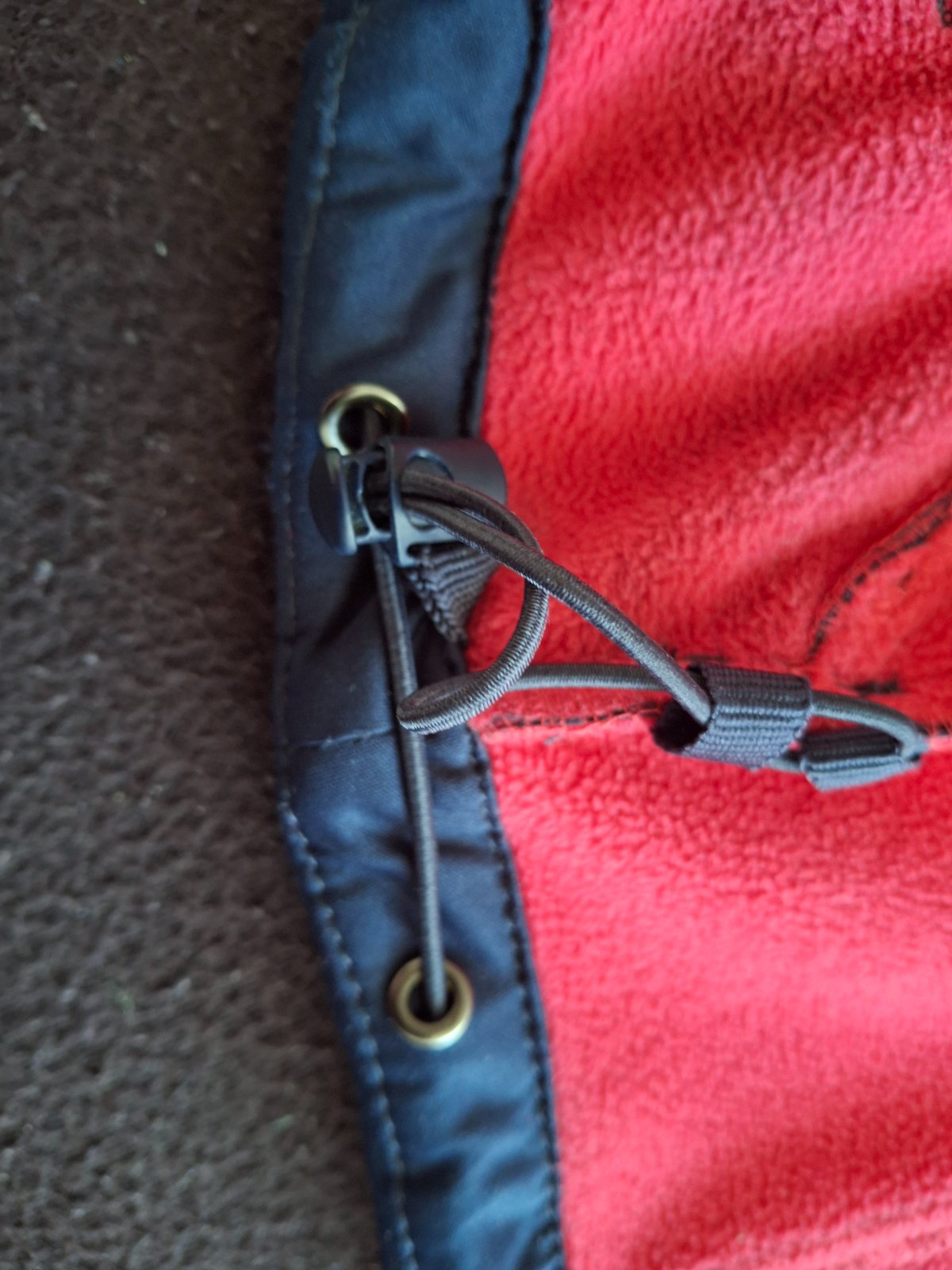 Vnútro sýtočervená farba, na bokoch stahovacia gumička, rukavy regulované na suchý zips.
