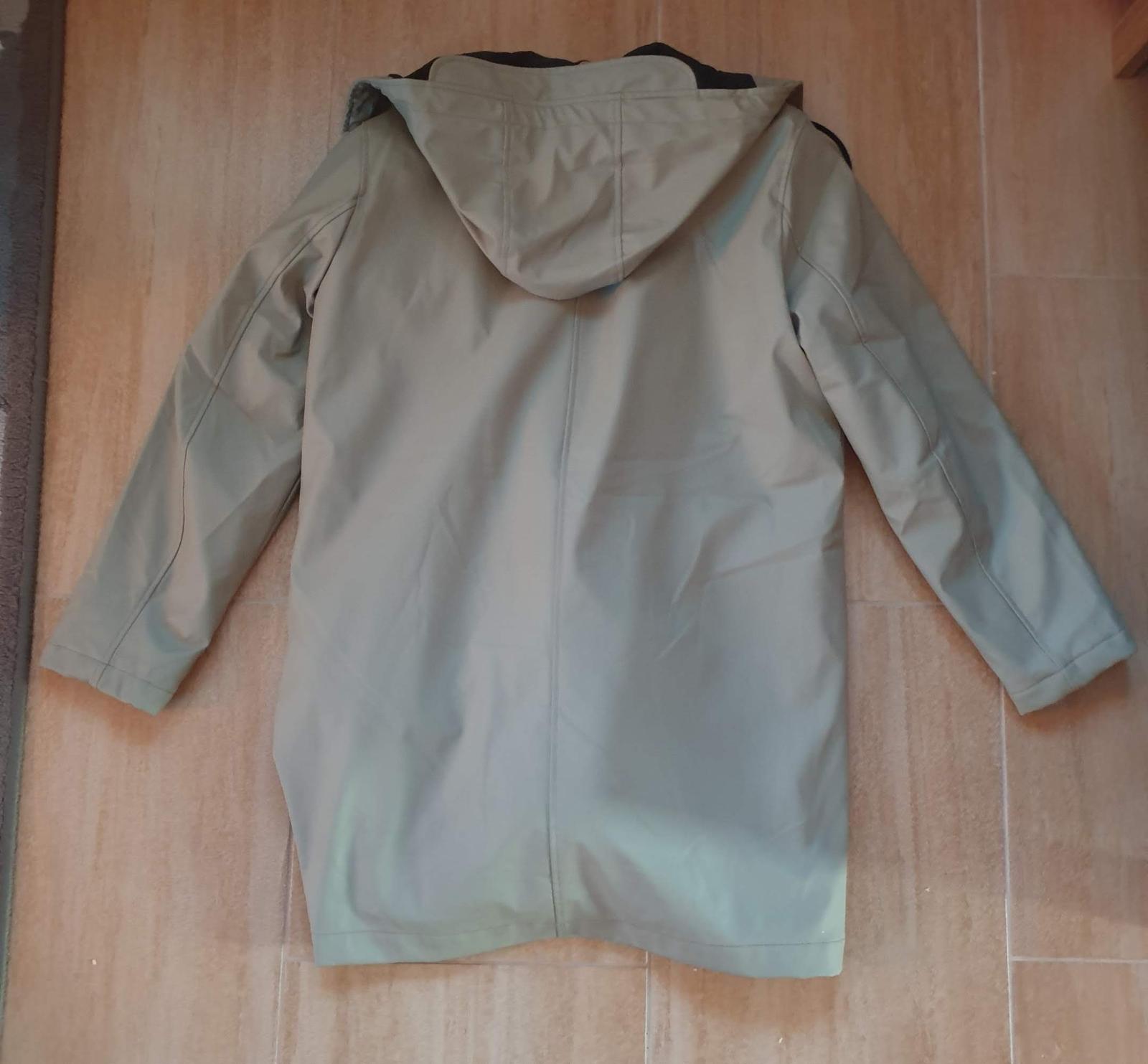 Je zateplený, vrecká na cvoky, pod jedným sú drobné, nevýrazné fliačky (viď foto), o tých som pri kúpe nevedela a teraz som ich neskúšala odstraňovať. Sadne na väčsie M, prípadne aj menšie L, rozmery na foto.