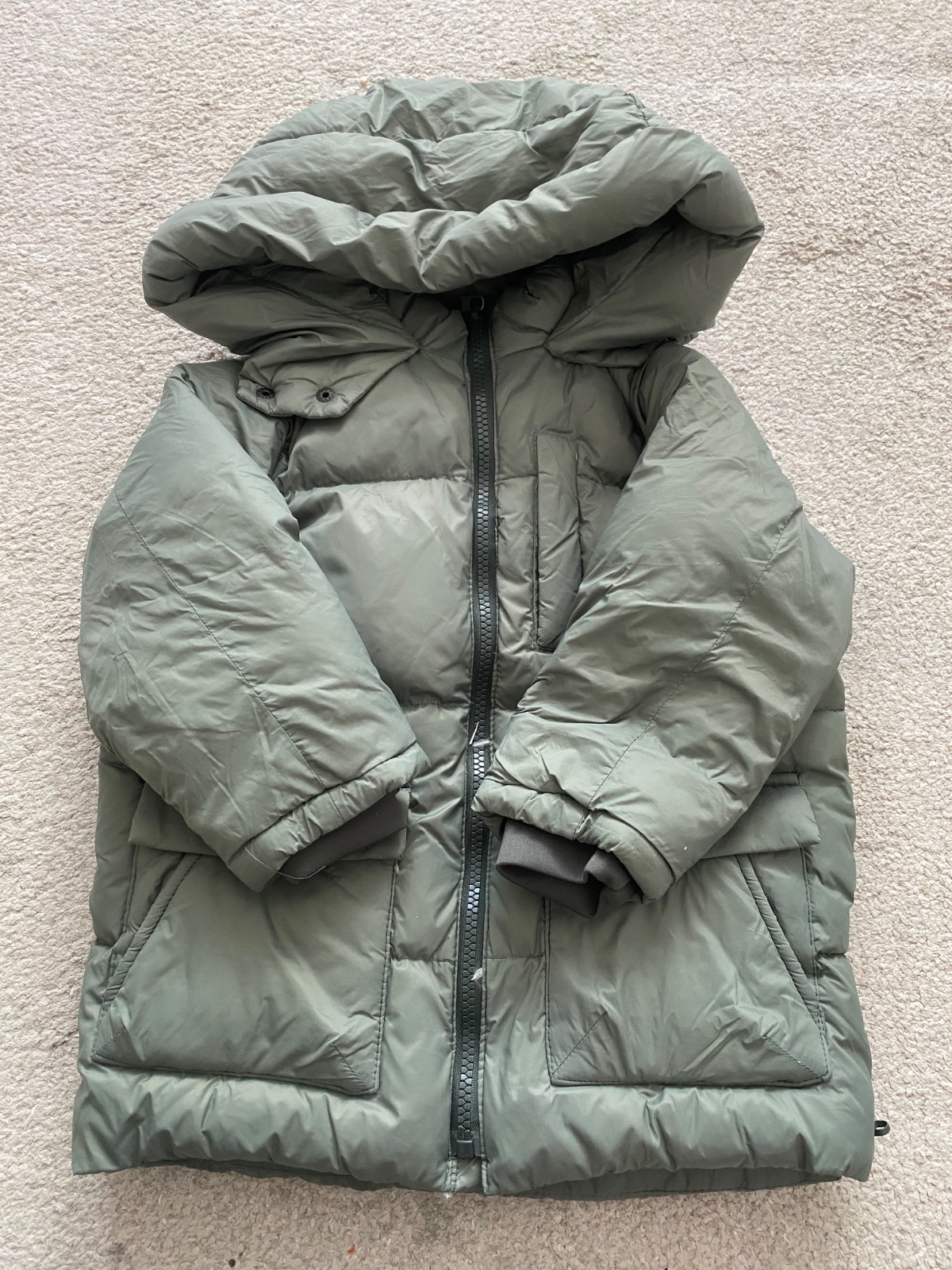 Nádherná páperová bunda ZARA vo farbe tmavá olivová/khaki, nosená zopárkrát, super top stav, takmer ako nová, perfektná teplá bunda v krásnej farbe, látka je jemne lesklá, farba najreálnejšia na úv...