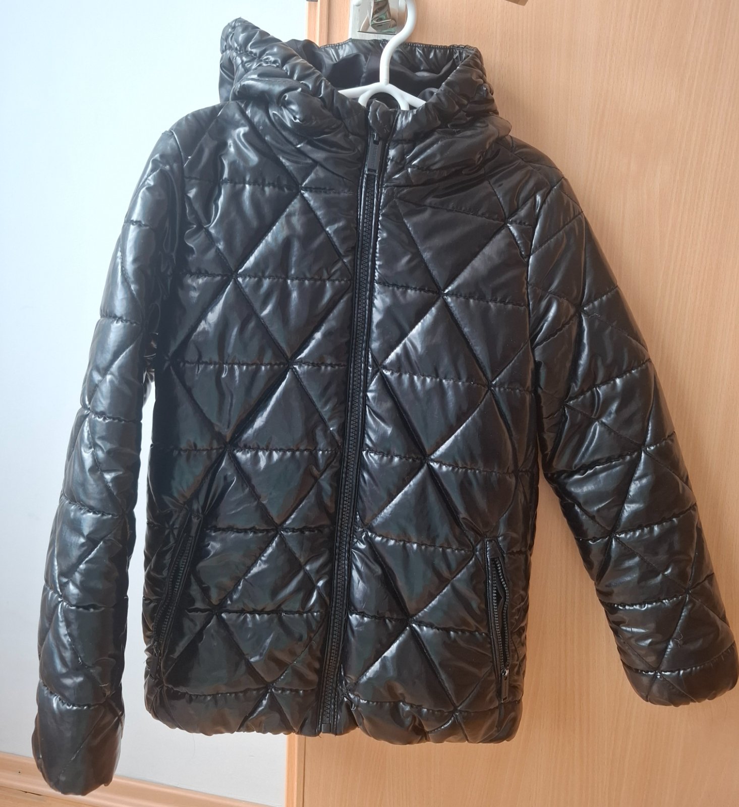 Bez poškodení, podšitá, zapínanie aj vrecká na zips, dĺžka 44 cm, šírka v podpazuší 39 cm, rukáv od krku 57,5 cm, od podpazušia 38 cm.