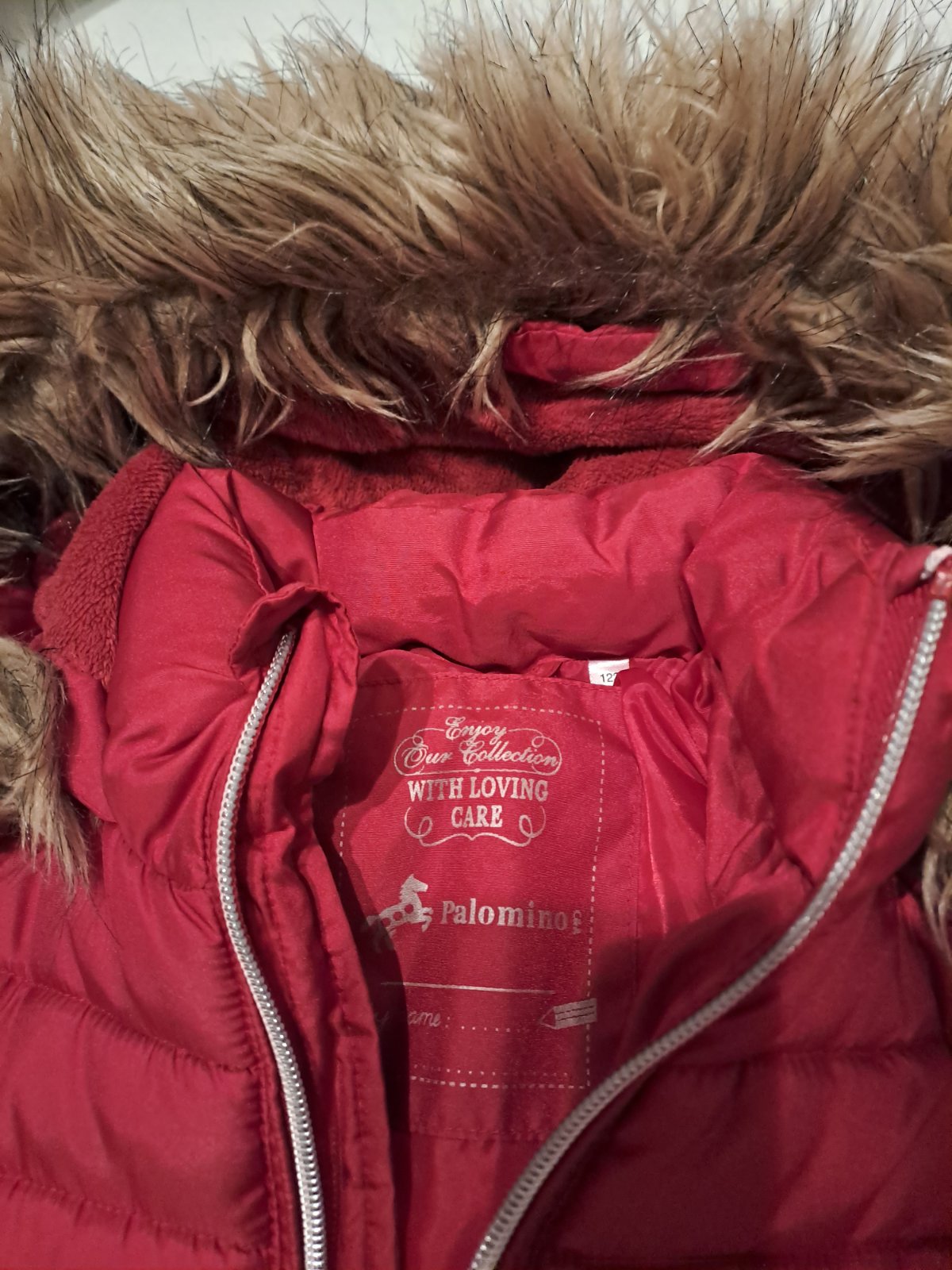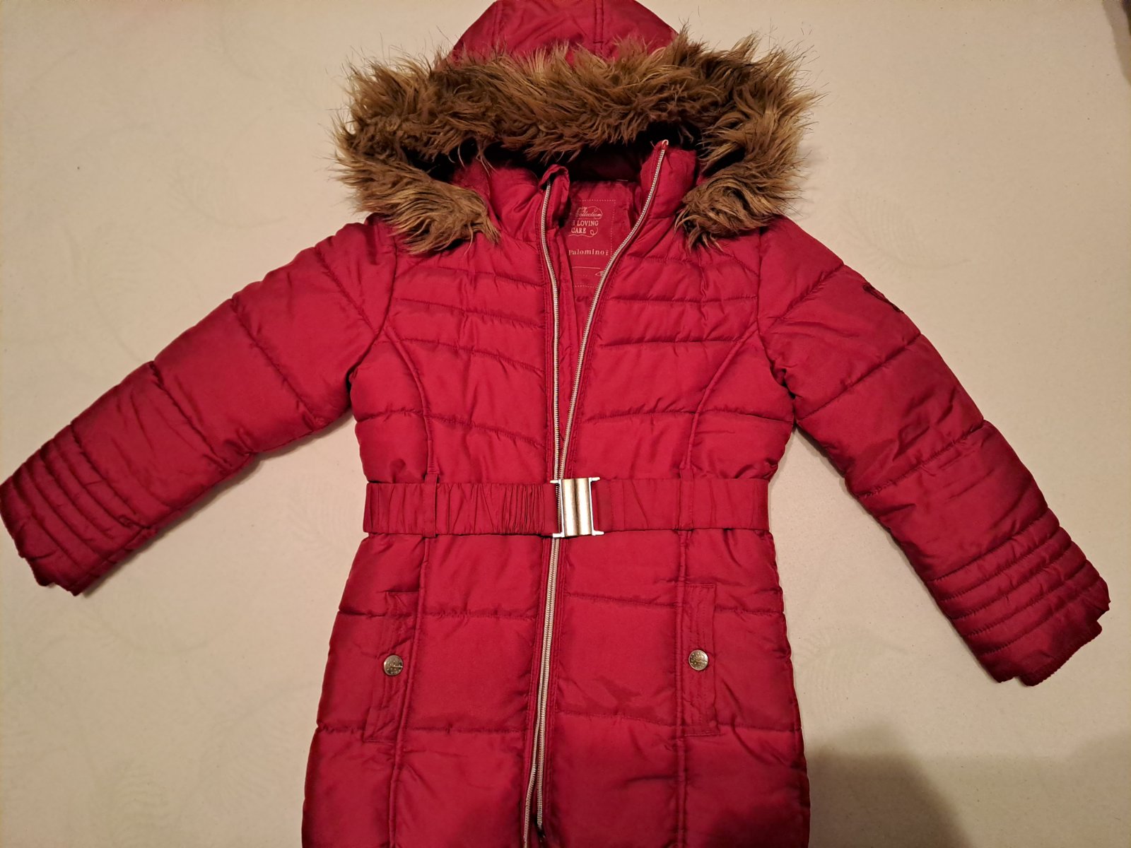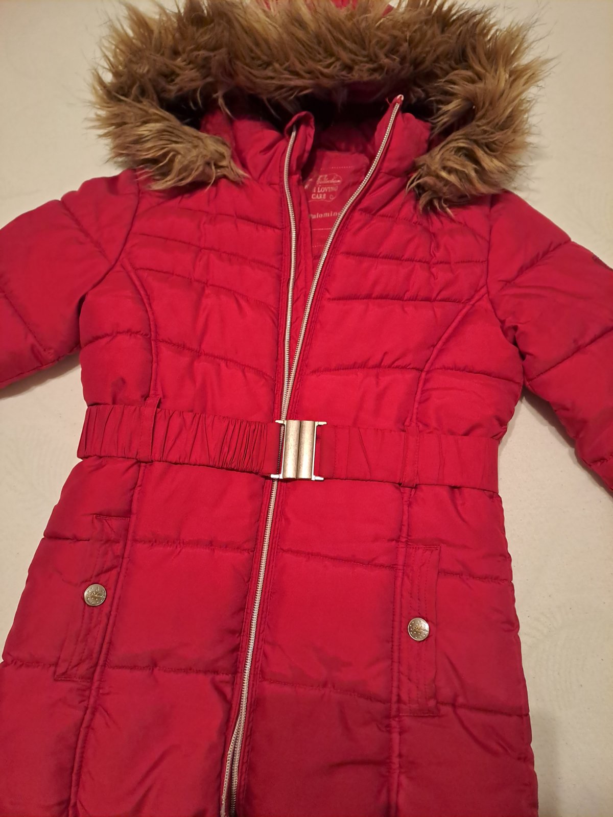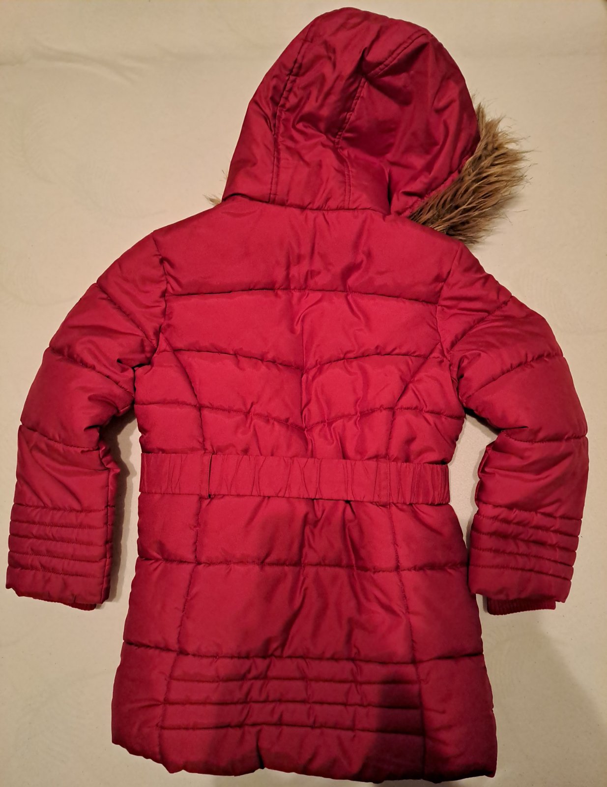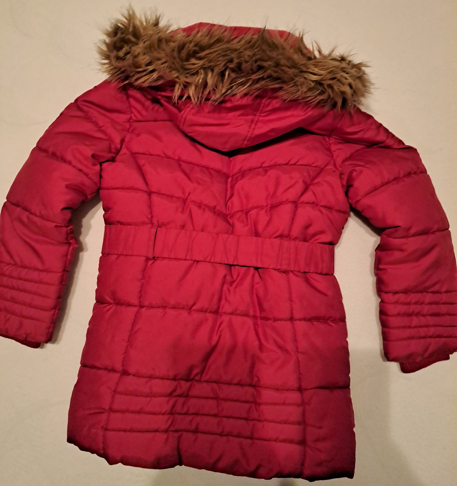 Krásna bunda pod zadok, kožušina aj opasok sa dajú dat dole. Ma pokazený zips, nejde mi ho zavrieť, ale šikovná mamina si poradí. Inak je v bezchybnom stave.