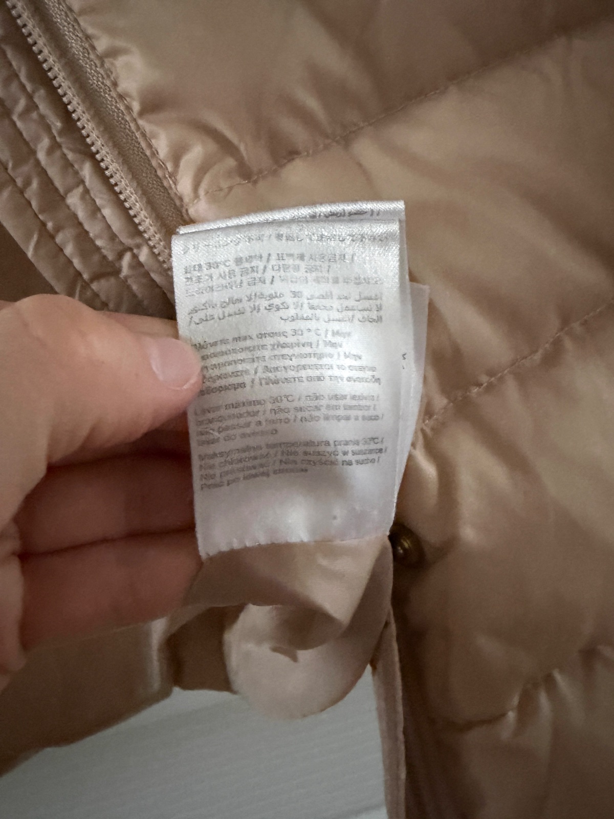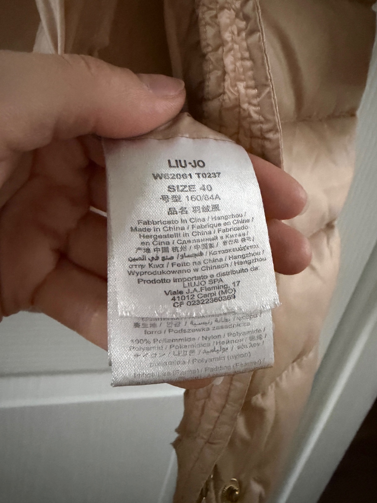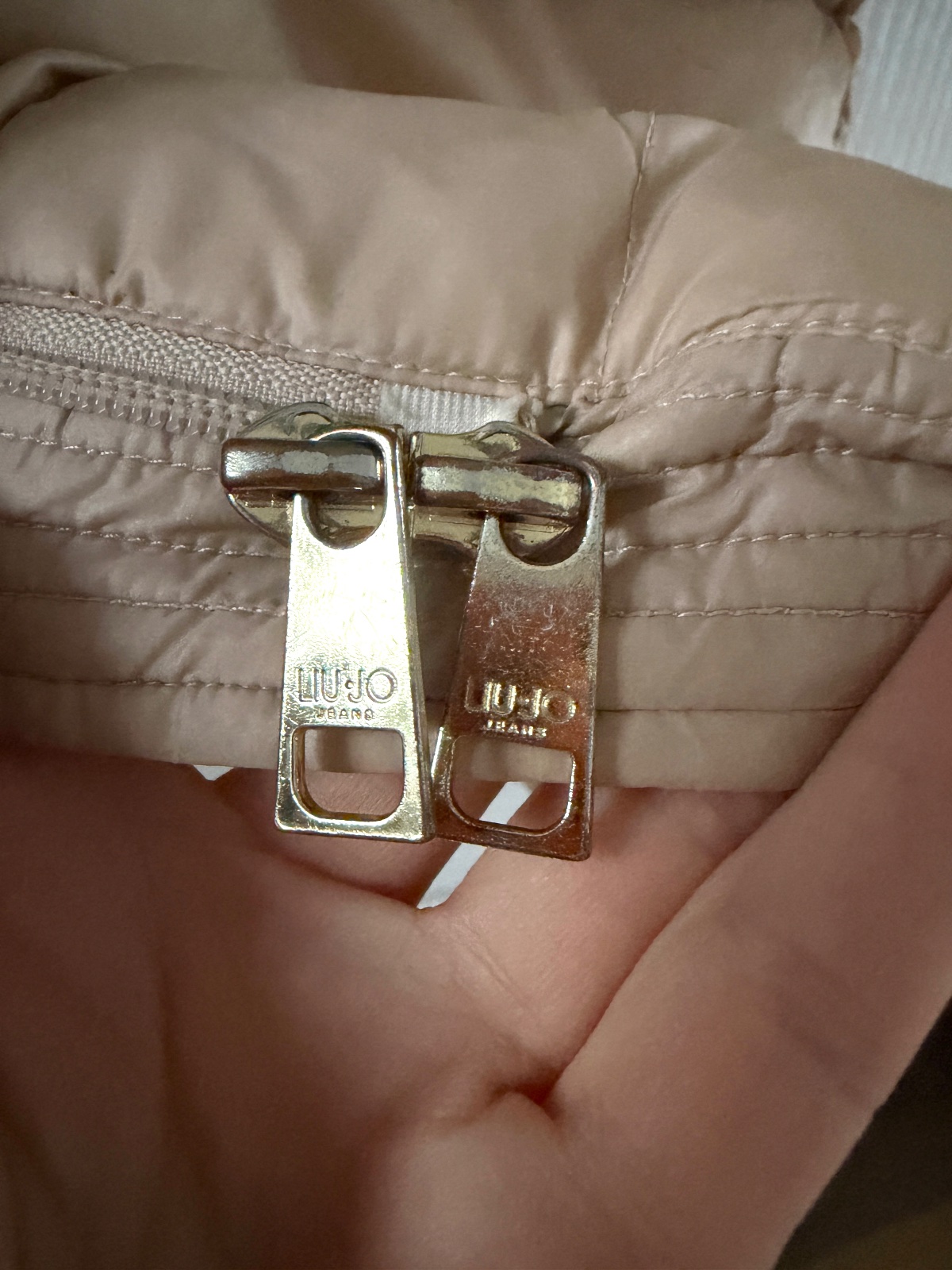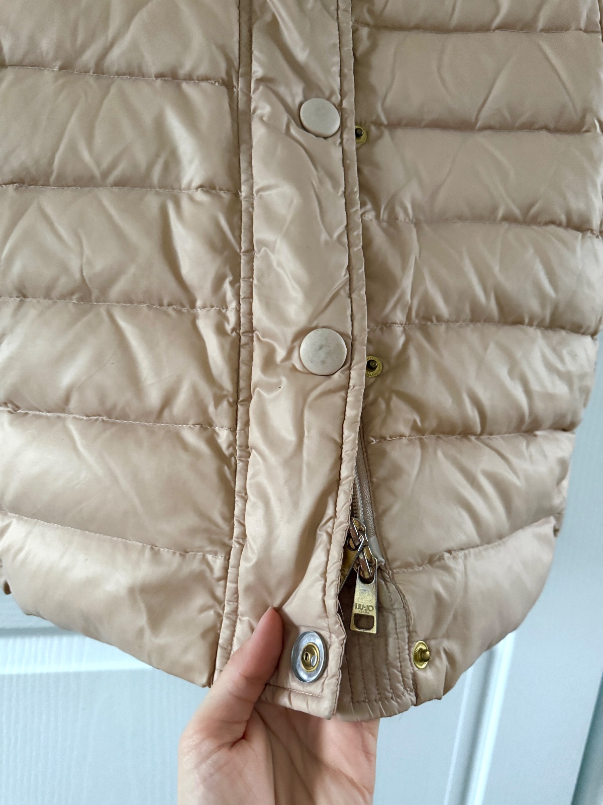 Páperová bunda Liu Jo v krásnej béžovej farbe. Bunda sa zapína na obojsmerný zips s logom značky a cvočkami. Cvoček v spodnej časti bundy je bohužiaľ rozbitý. Bunda siaha po kolená. Je mierne priliehavá a má vyšší golier, ktorý poskytuje vynikajúcu ochranu pred vetrom. Bočné vrecká sa zapínajú na skryté zipsy. Bunda je ľahká, ale veľmi teplá. Výplň tvorí 80 % páperie a 20 % perie. Veľkosť na štítku je 40, ale ide o talianske rozmery, takže ide o veľkosť S. Šírka pod pazuchami je približne 47 cm a dĺžka je približne 84 cm.
