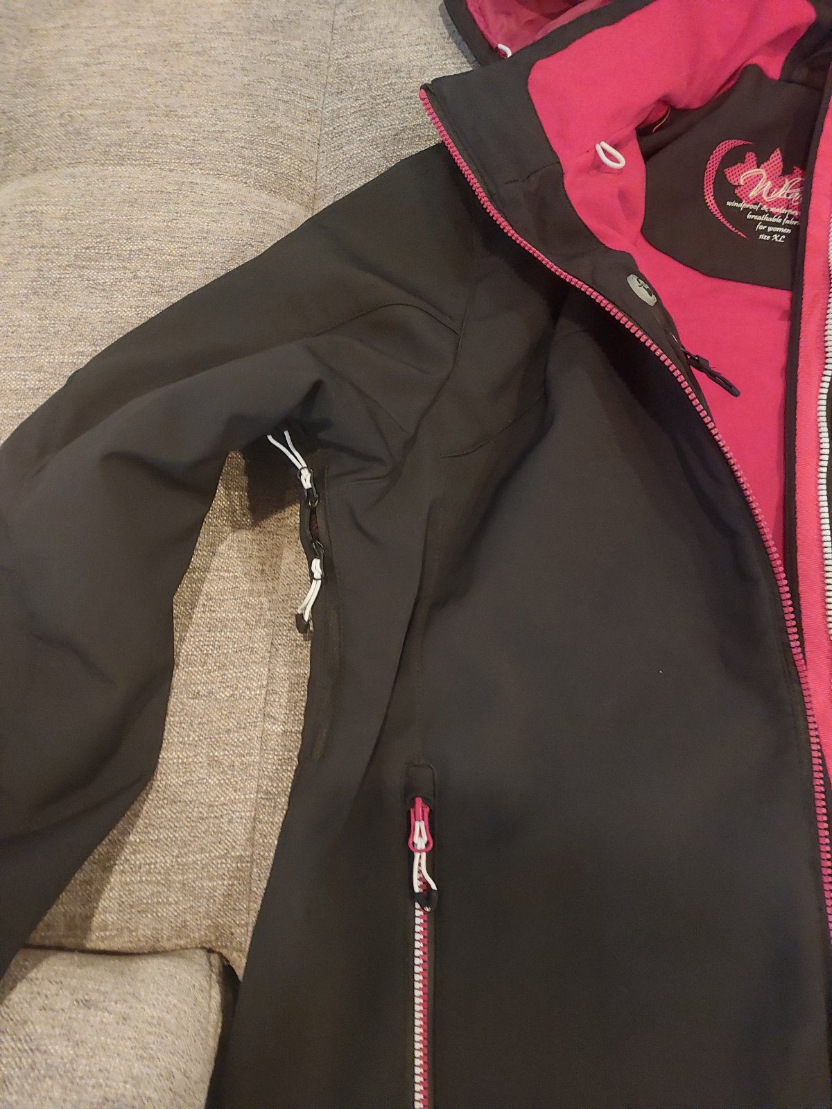 Vnutri lyziarske zapinanie, zipsy pod pazuchami, zips na ruke, vnutorne vrecka zo sietky a tiez jedno vnutorne na zips. Kapuca odnimatelna.
