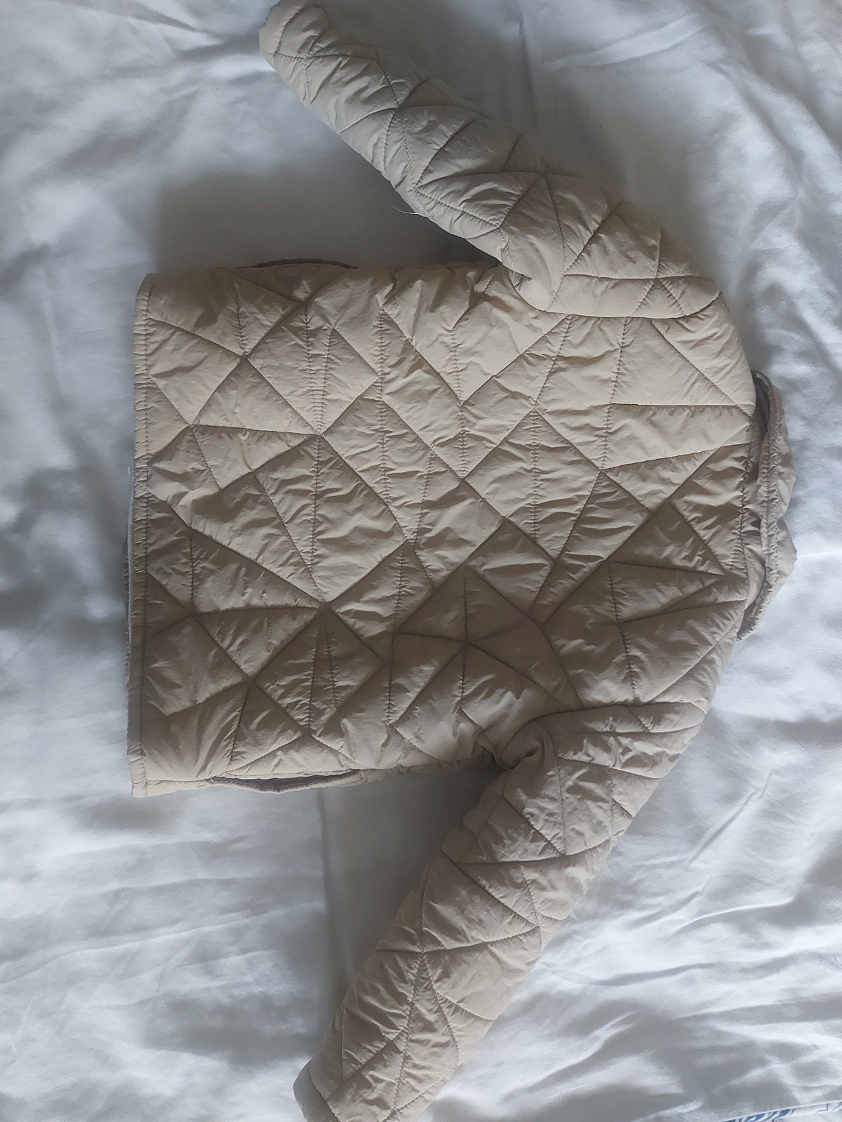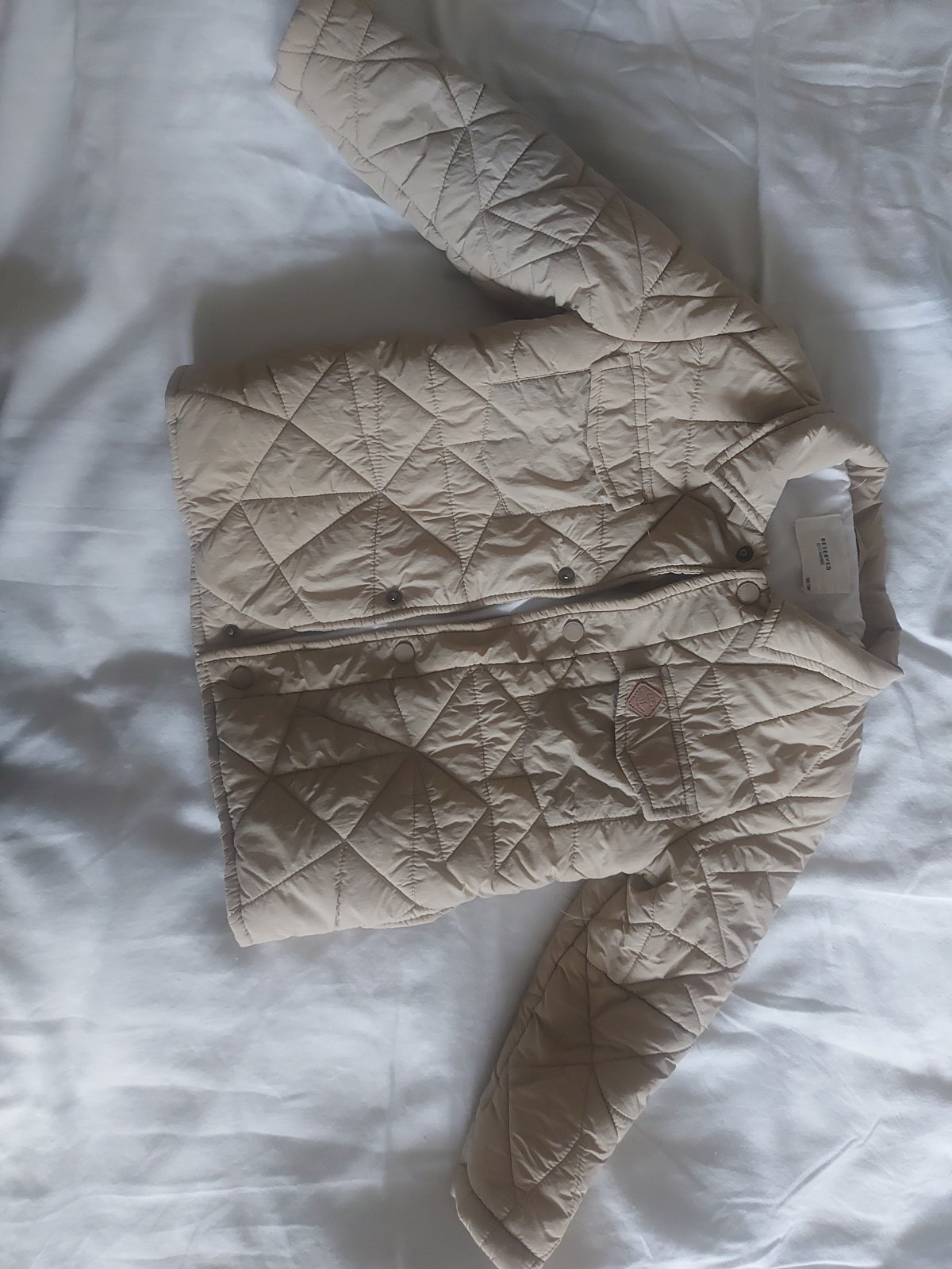 Štýlová chlapčenská bunda vo výbornom nosenom stave (bez dierok, fliačikov a žmolkov; sem-tam trčiaca nitka). Bunda má klasický strih, prešívanú podšívku, veľkú neodnímateľnú kapucňu a zapínanie na...
