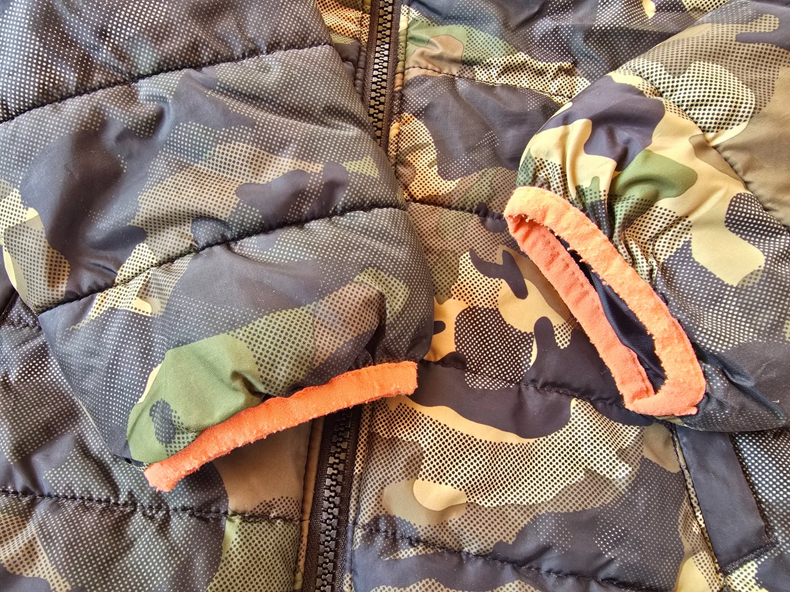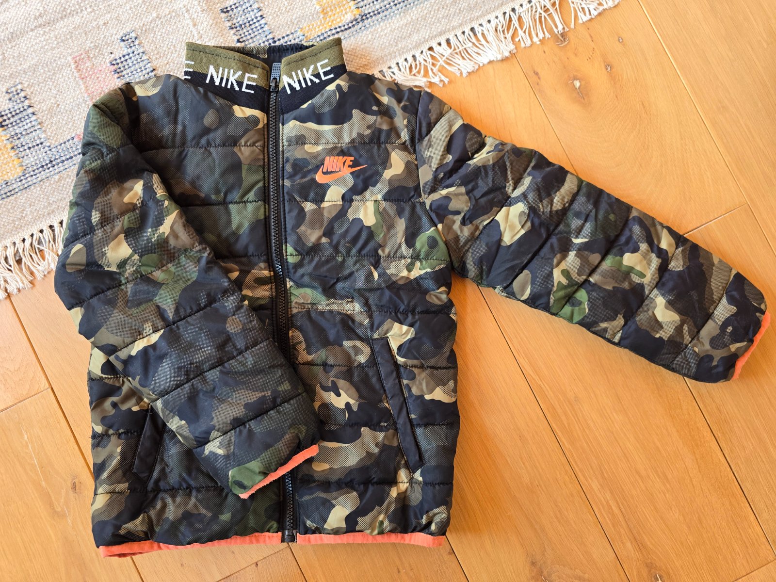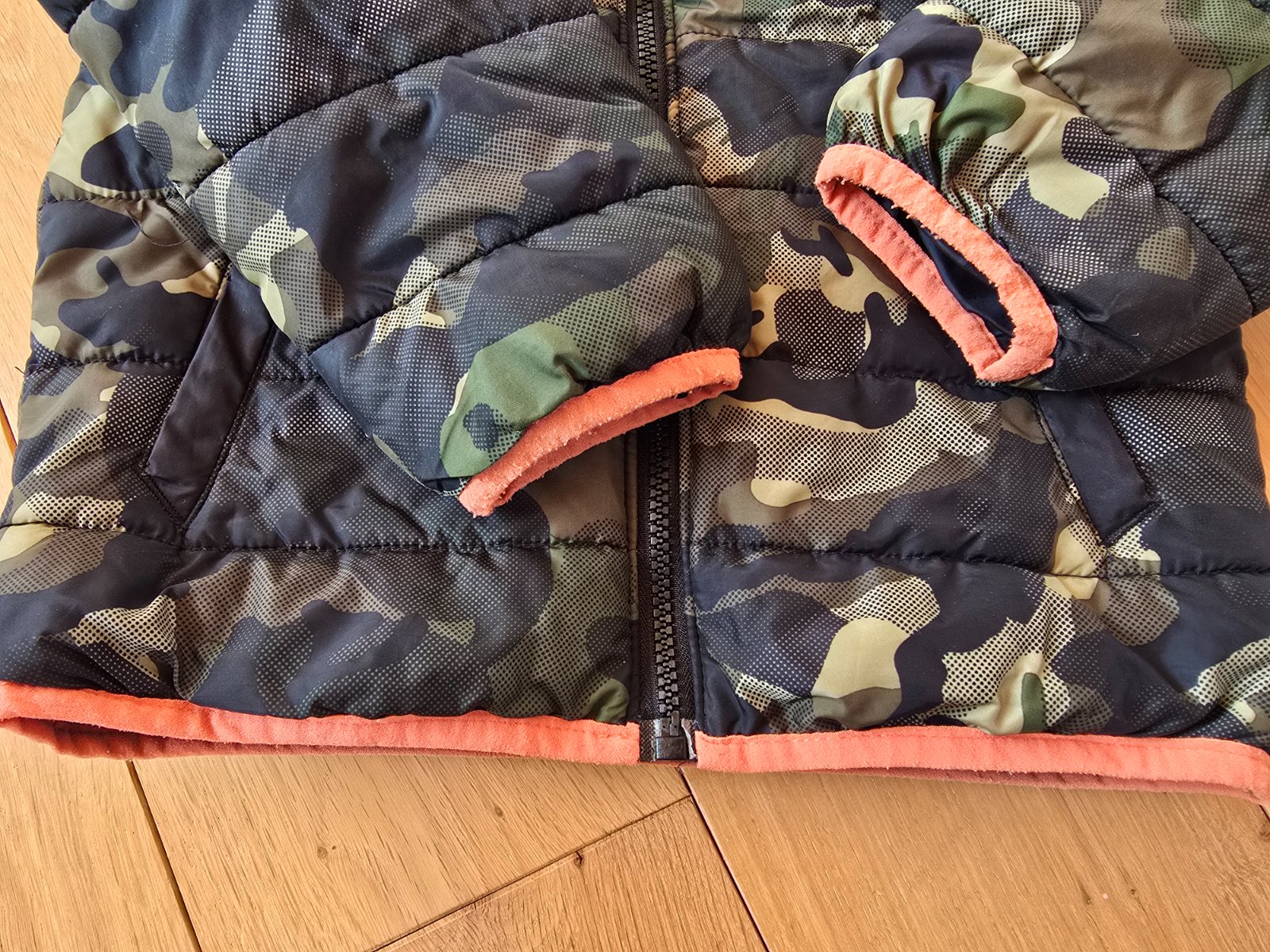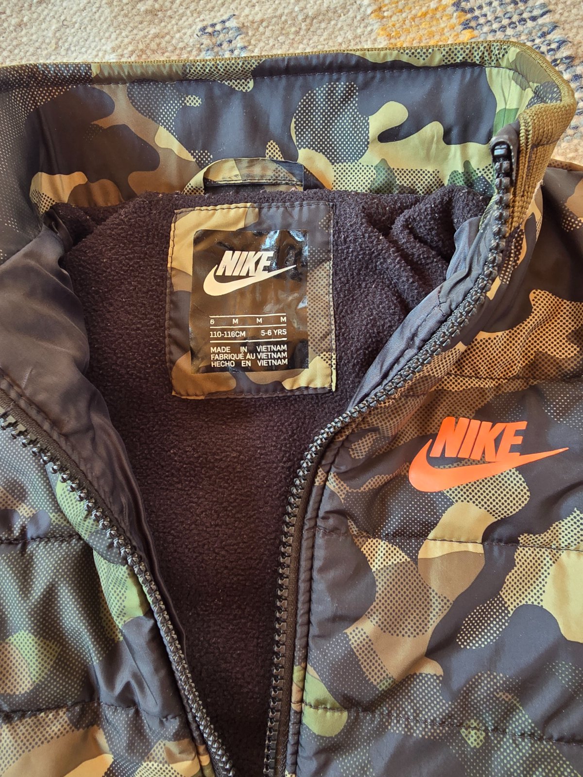 Velmi pekny stav. Esteticke nedostatky- zmolky na oranz.latke a mierne zosuchany zips, inac vo velmi dobrom stave. Velkost pisana M - 110/116, 5-6 rokov. Ukaze super na postave. Vhodna teraz na jesen alebo aj na teplejsiu zimu :)