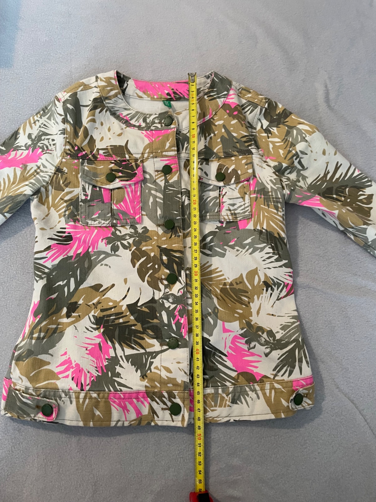 Denimová bunda so vzormi listov vo farbách ružová, zelená, zlatá. Zapína sa na gombíky.