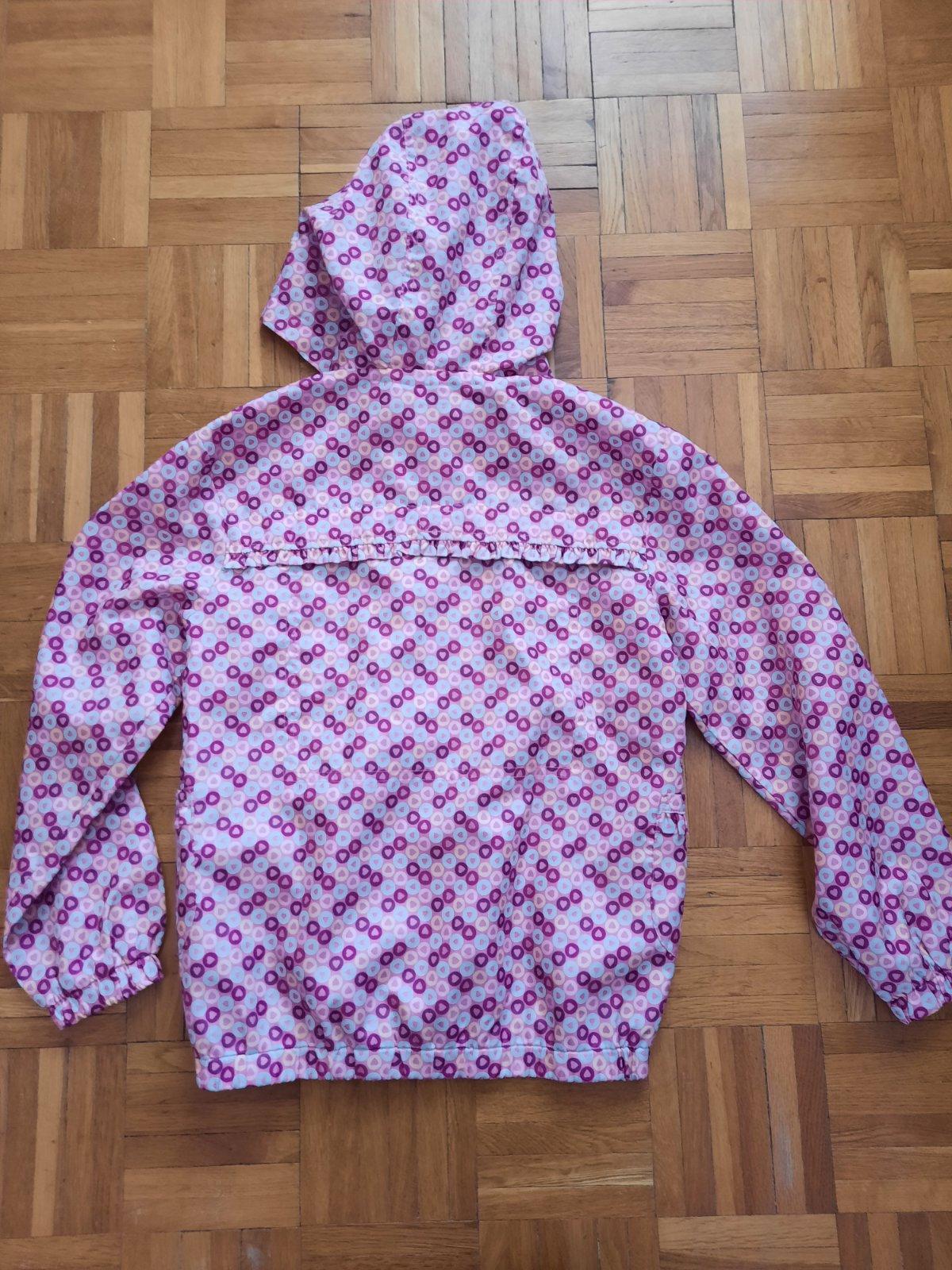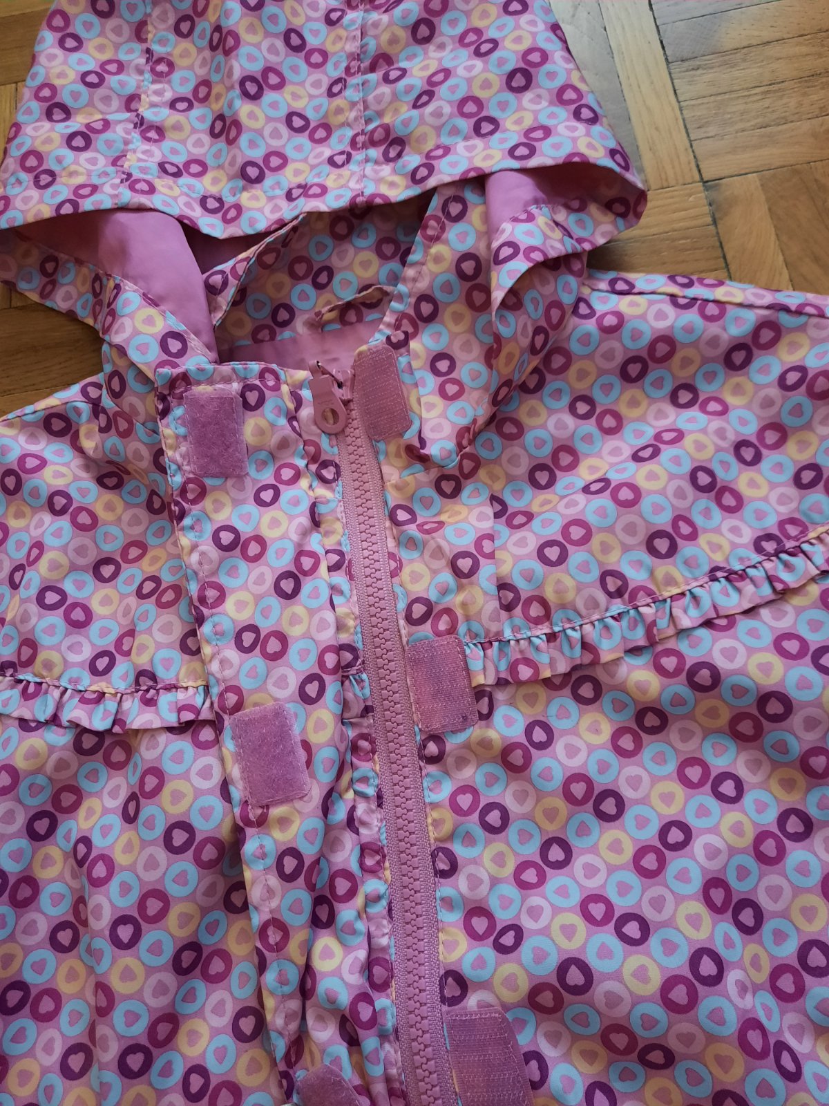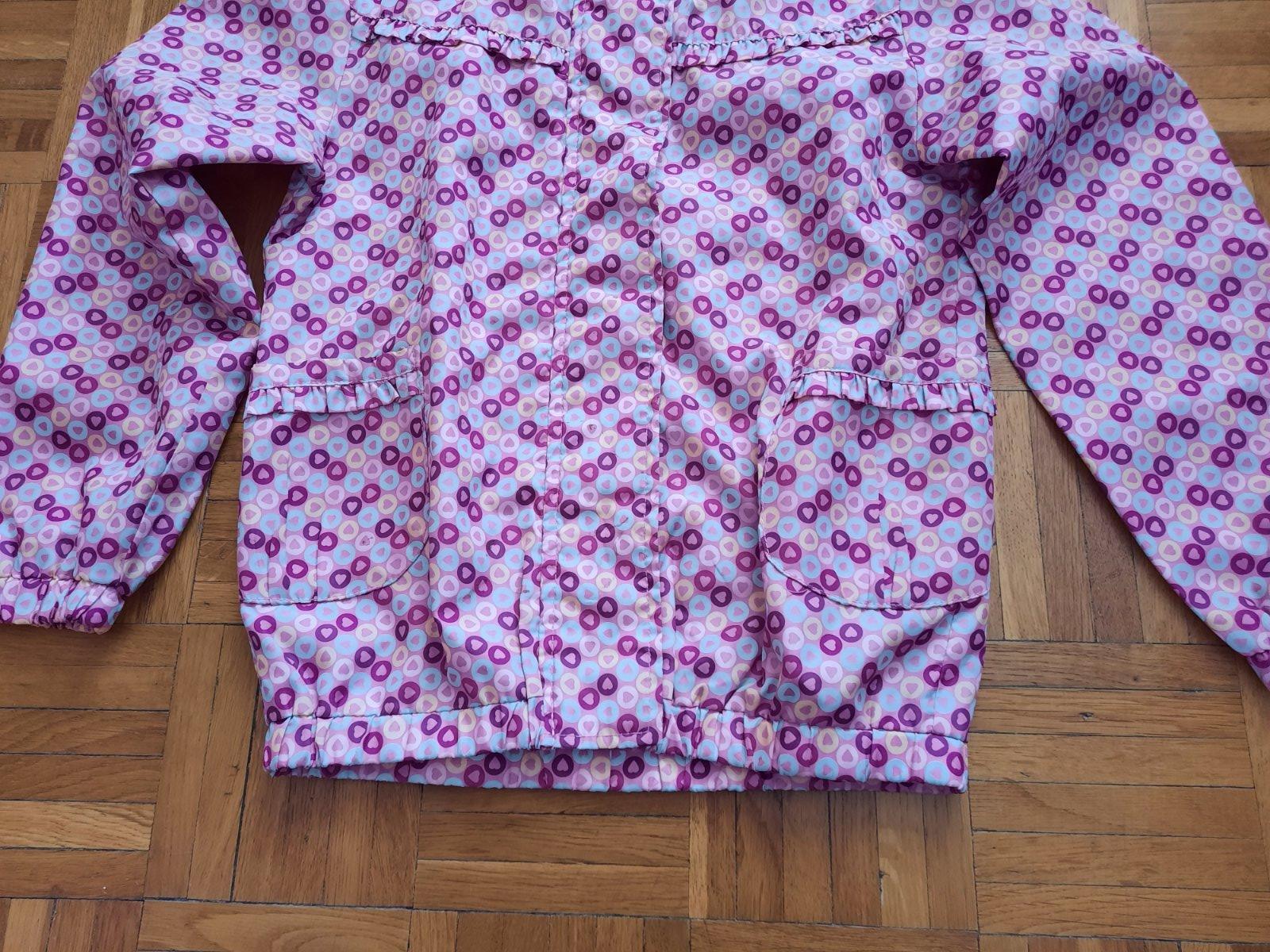 Krásna dievčenská prechodná, podšitá bunda na zips+suchý zips. Kapucňa je napevno. Vpredu sú vačky, okraje sú ozdobné. Rukávy aj spodok sú na gumu. Je v top stave.