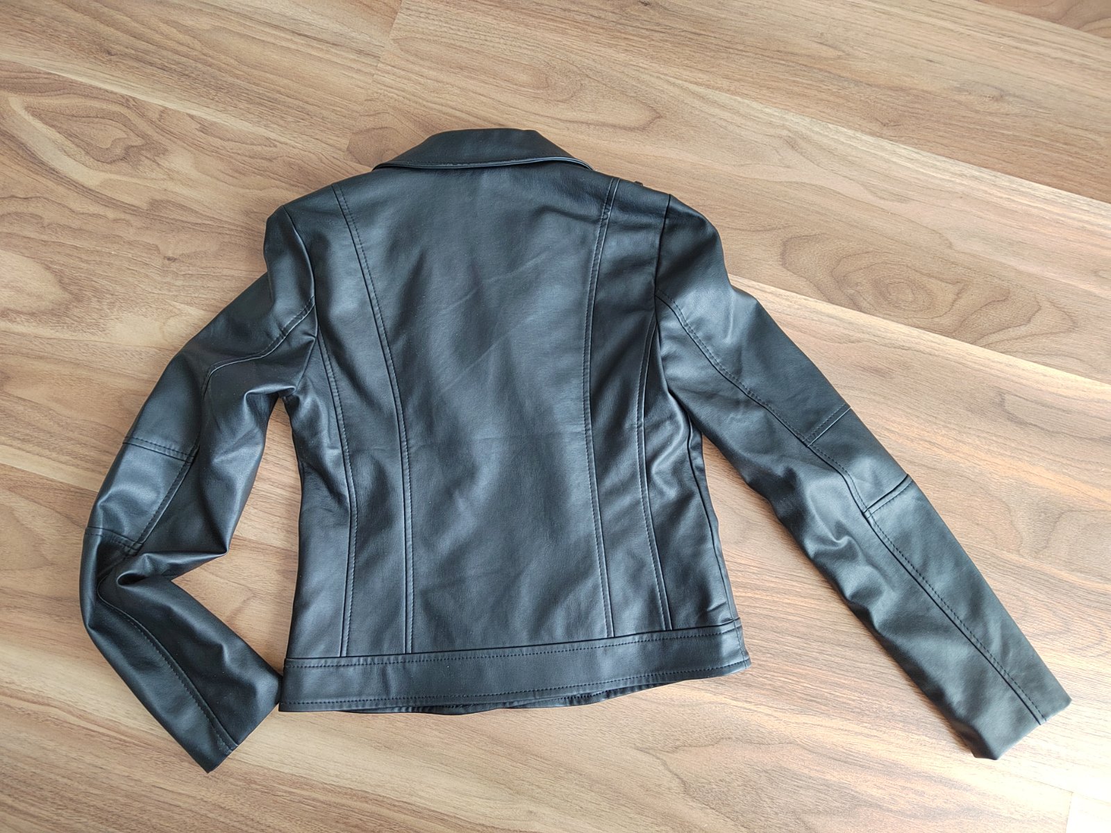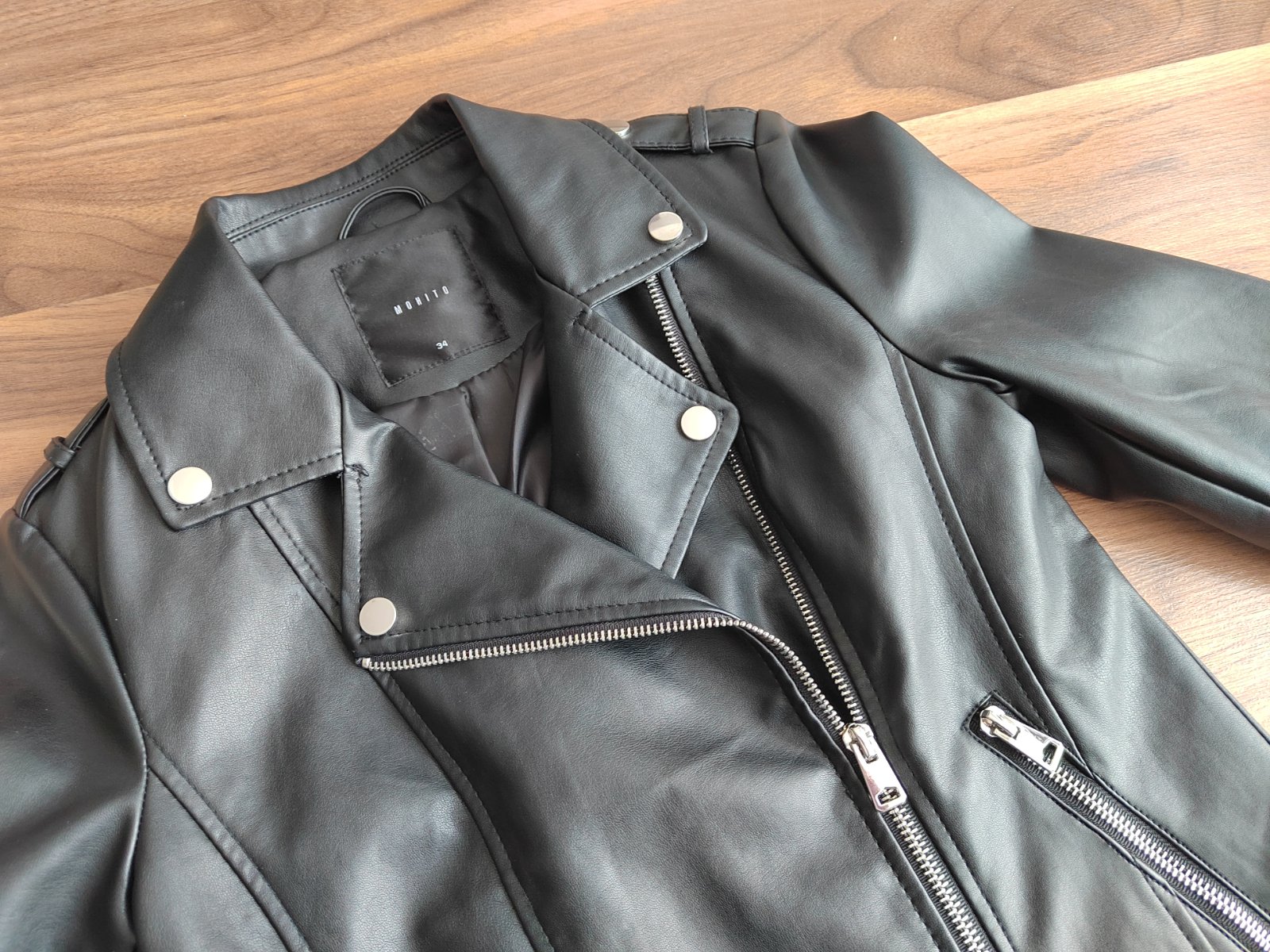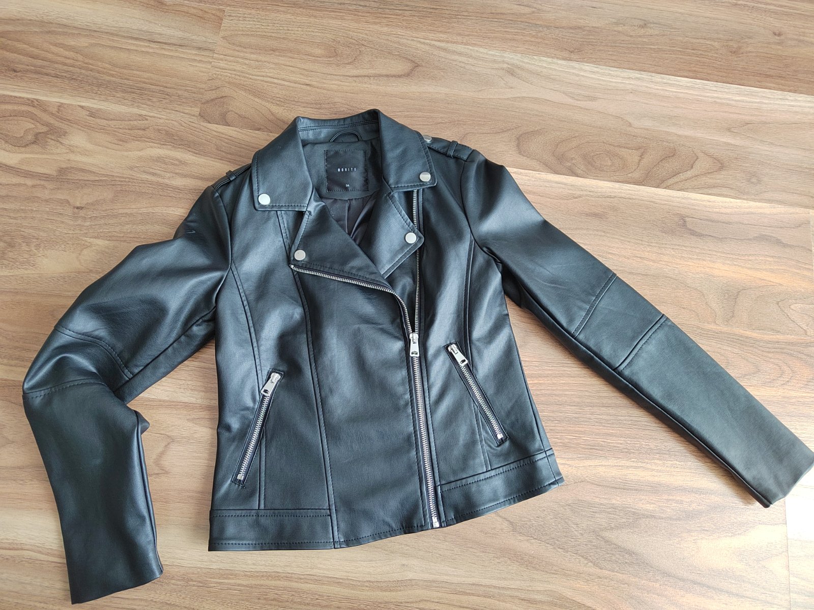 Predám dievčenskú motorkársku bundu z umelej kože, značka MOHITO, veľkosť č. 34, farba čierna, zapínanie na zips, 2 vrecká na zips, hladká podšívka.