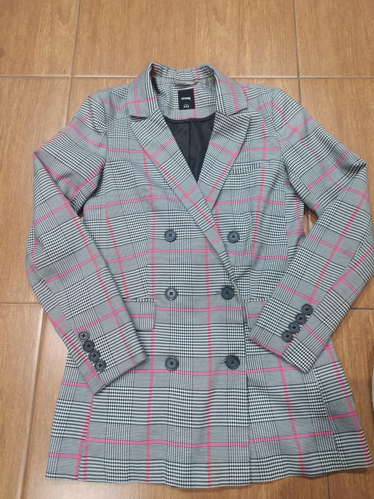 Krásne karované sako , nosené pár krát,je v super stave bez poškodenia.Vel uvedená XXS,nosili sme ako 158