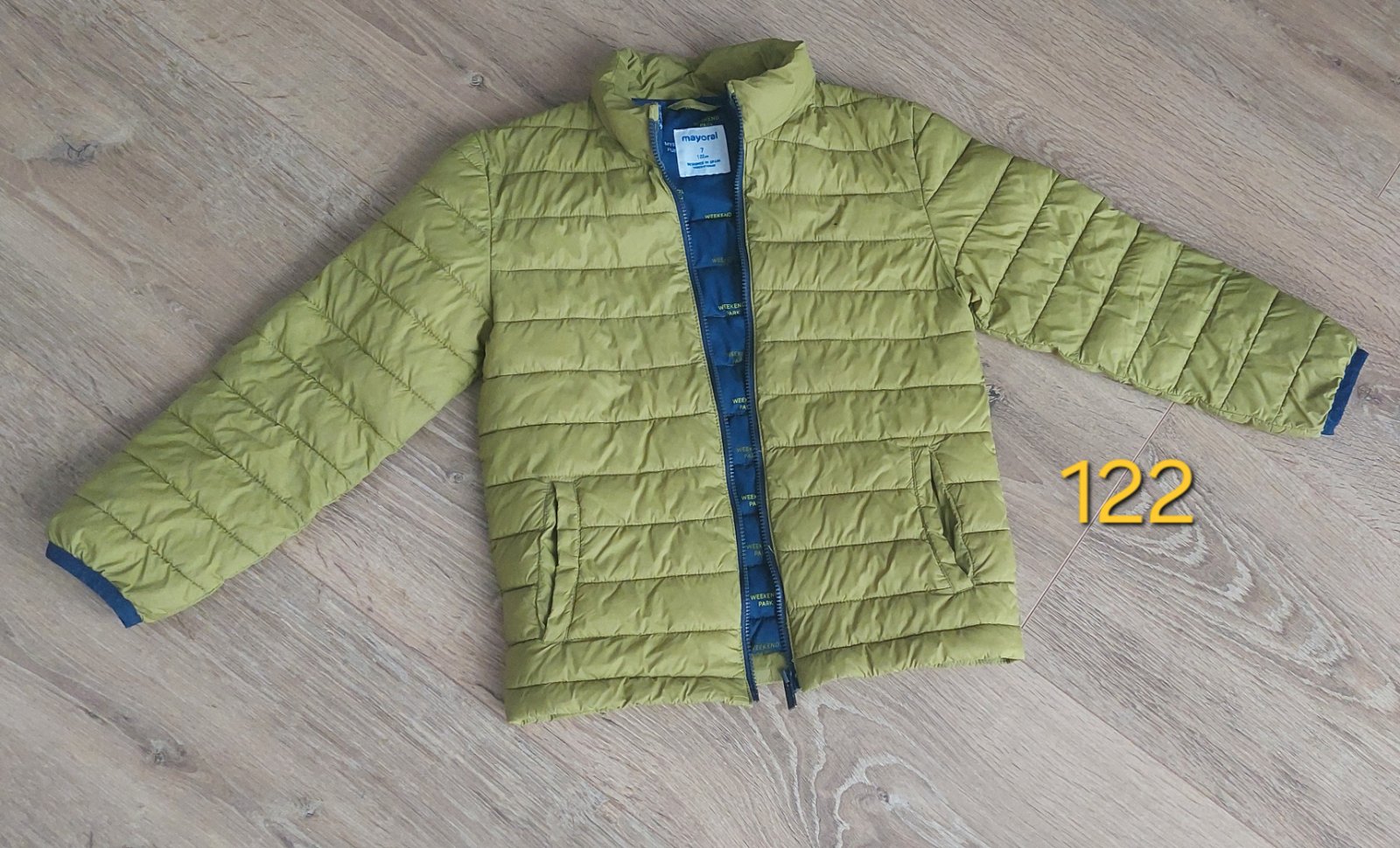 Pistáciovo zelená bunda s tmavomodrým zipsom. Nositeľná aj ako 128.