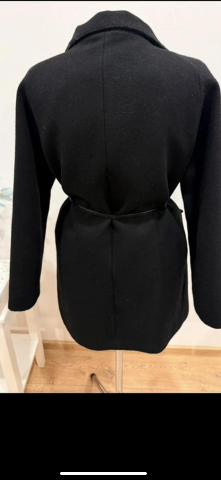 Kabát je veľmi pekný, málo nosený, bez viditeľných známok opotrebenia. Materiál je stále pevný, farba čierna a pôsibí nadčasovo. 63%vlna
