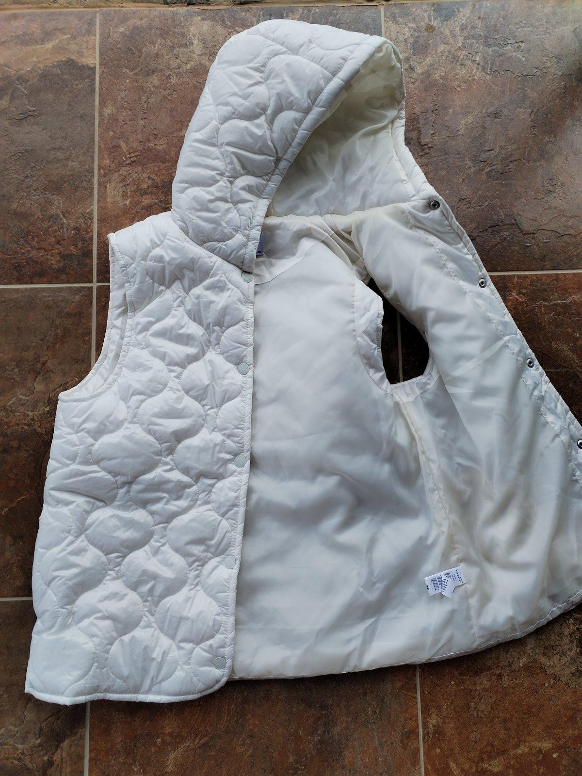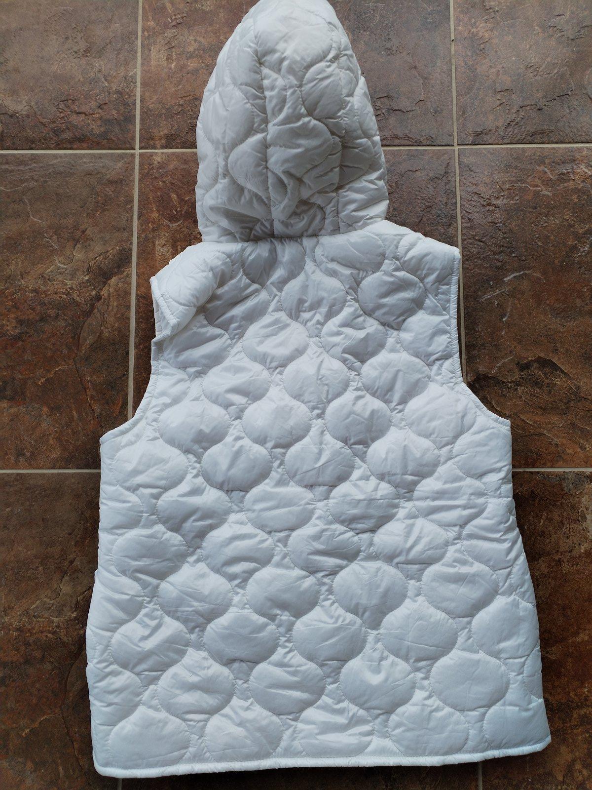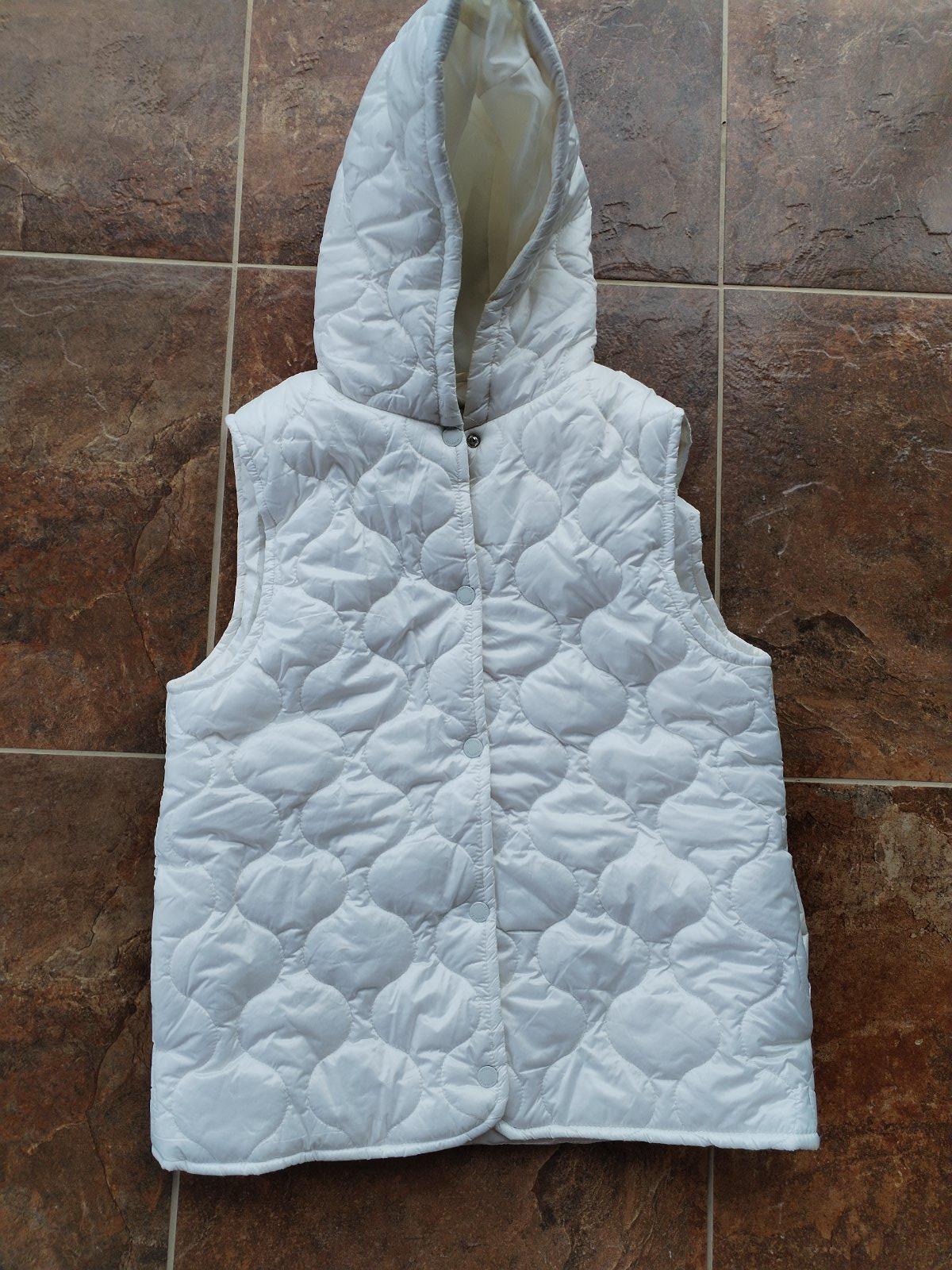 Smotanová vesta, jemne vatovaná, zapínanie na cvoky, kapucňa napevno, dĺžka 60 cm, v podpazuší 2x49 cm, vynikajúci stav