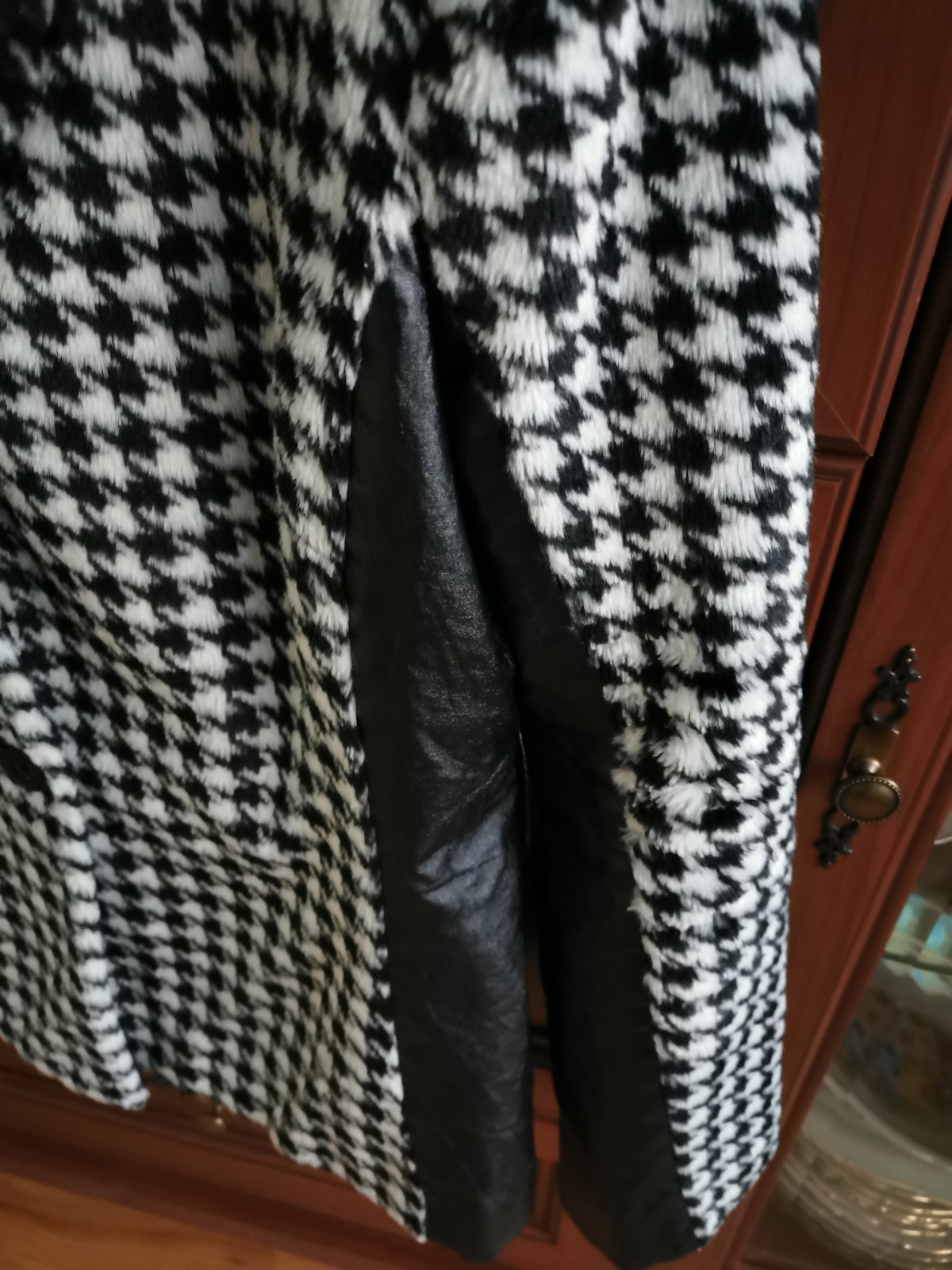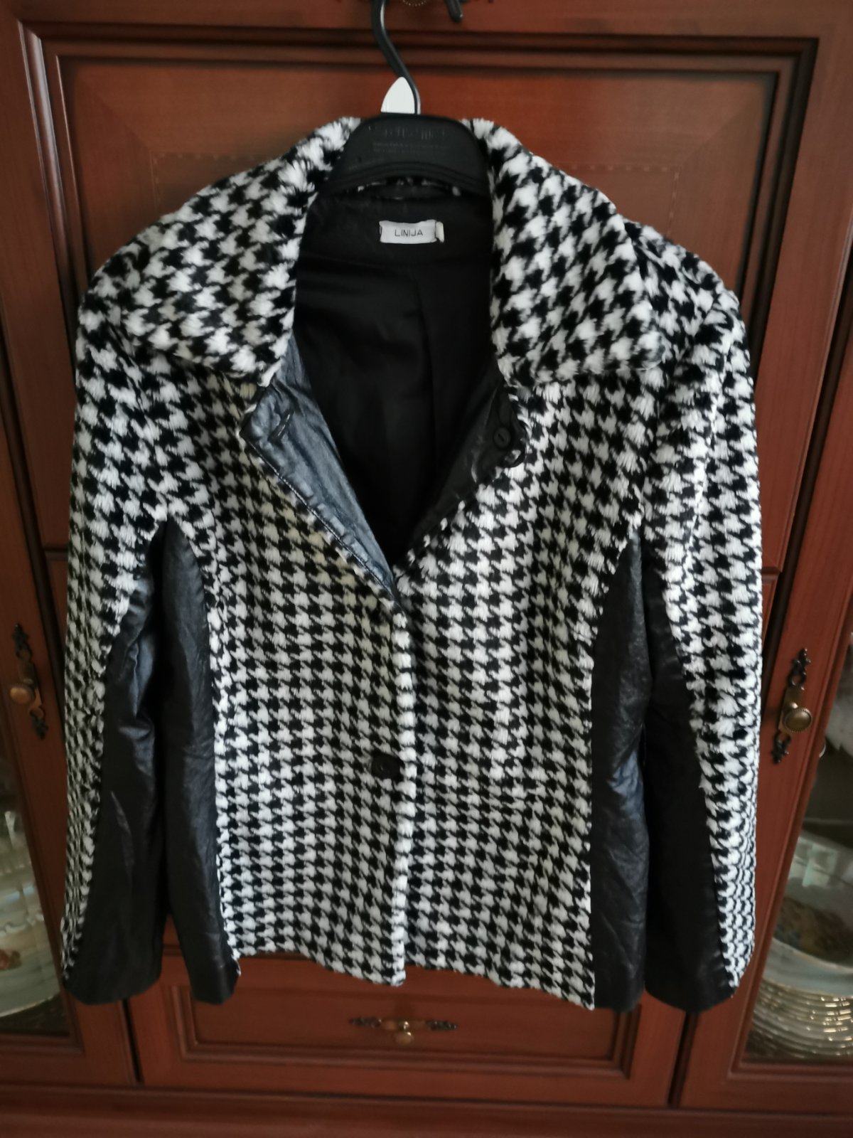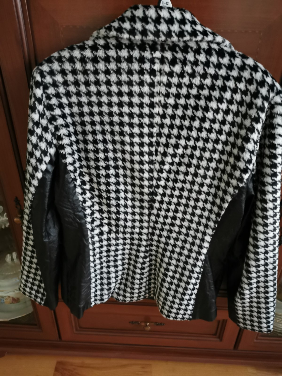 čierne káro na svetlom podklade, podšité čiernou podšívkovinou, veľmi dobrý stav, uv. veľ. 40 dl. 71cm, rukáv od krku 71cm spodný rukáv 39cm šírka pod pazuchami v kľude 46x2