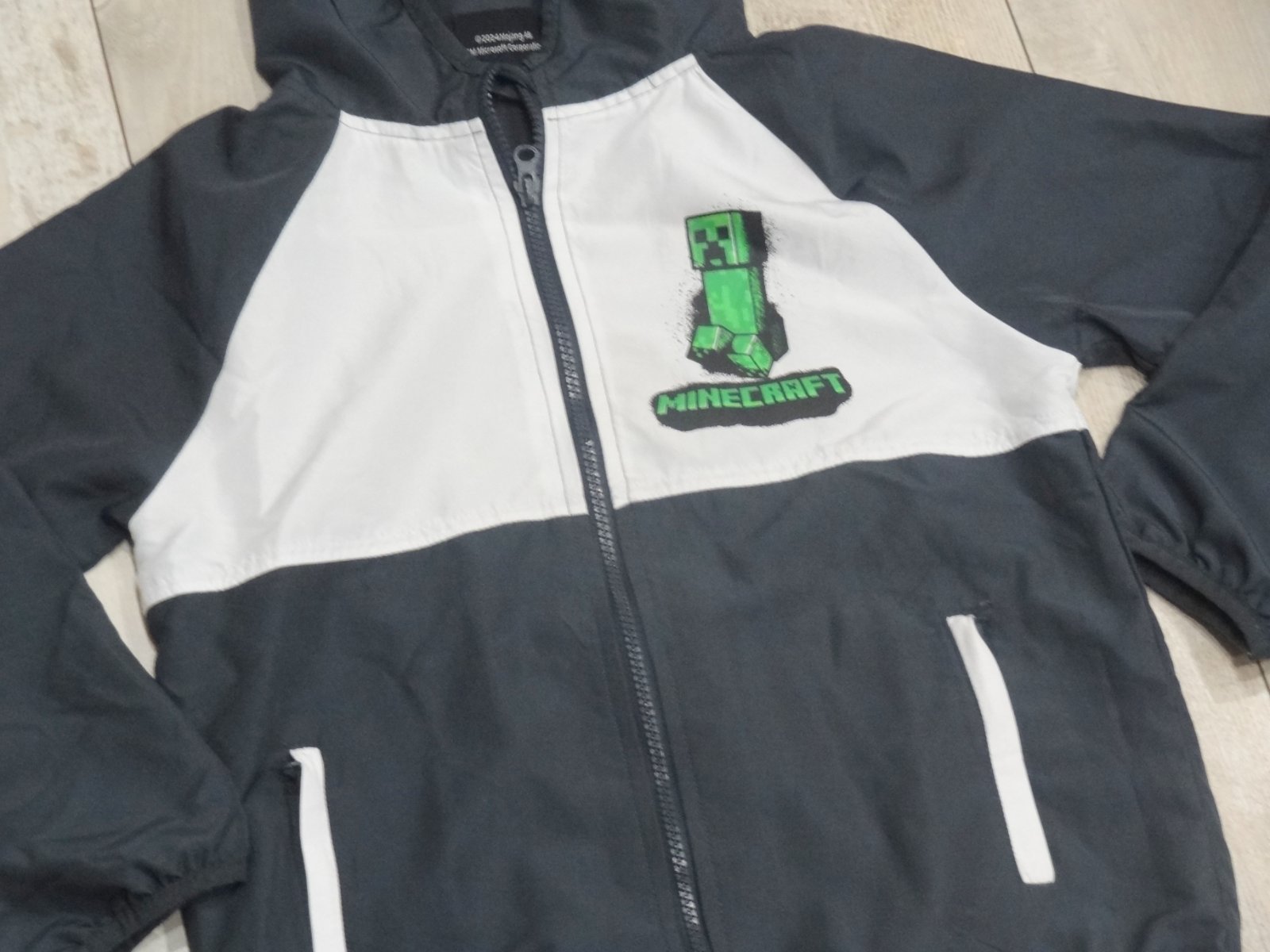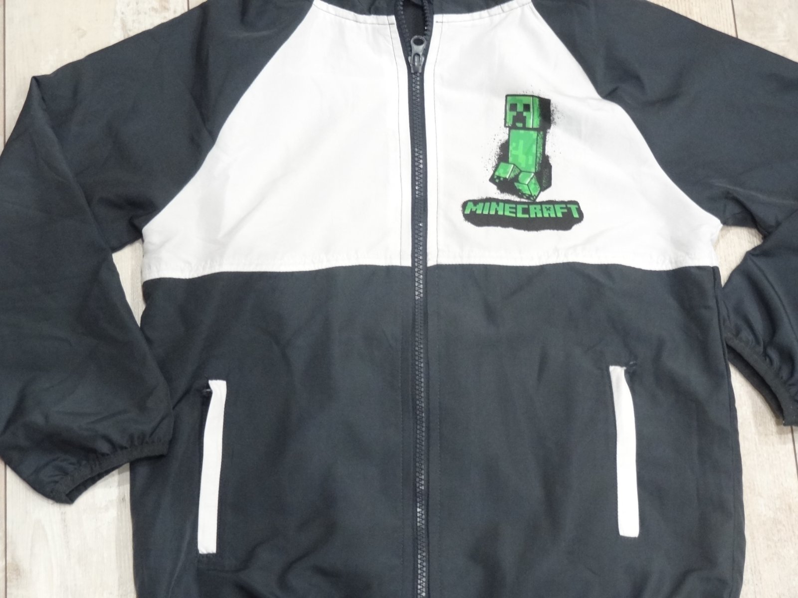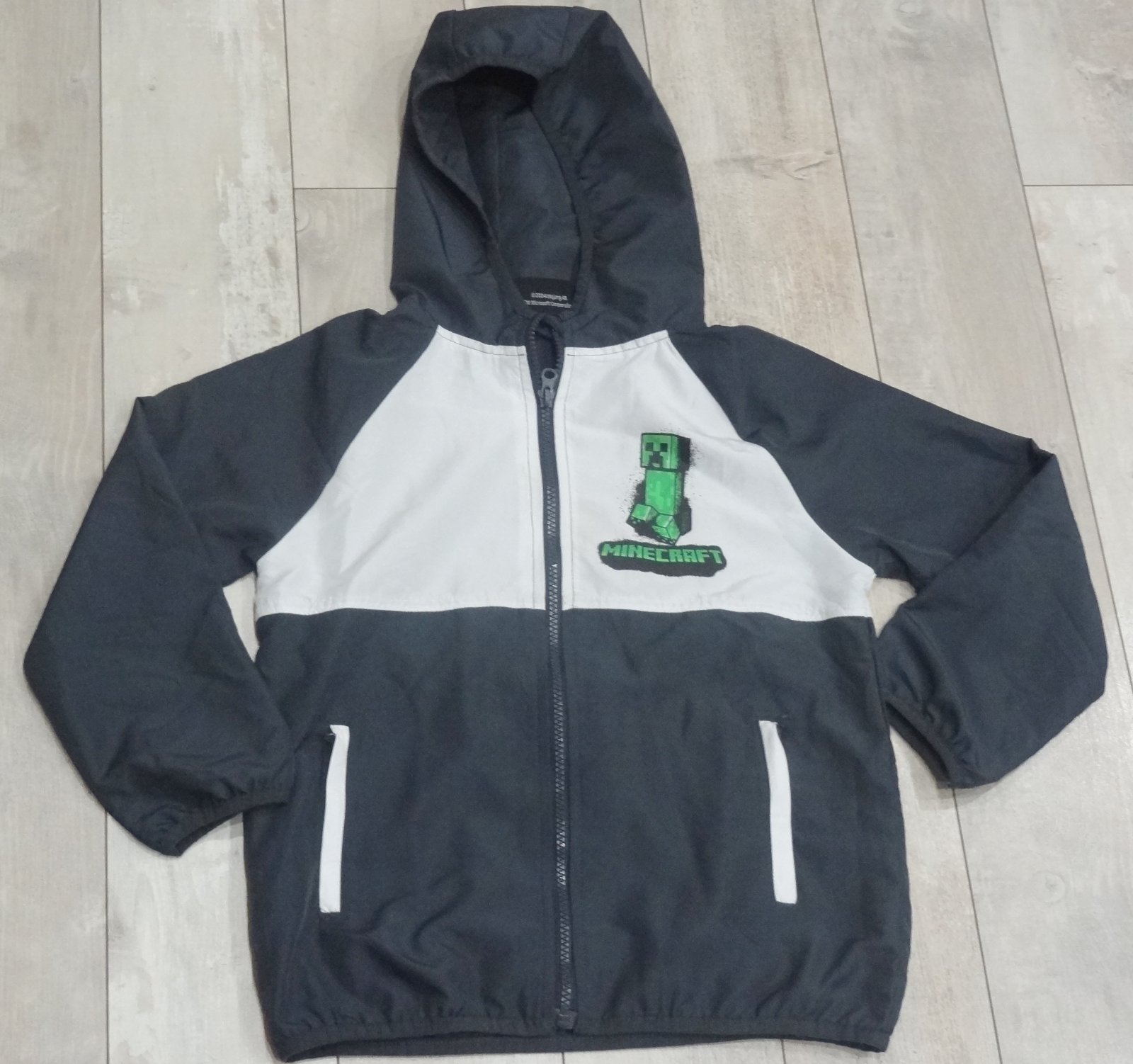 Chlapčenská bunda/vetrovka MINECRAFT ... výborný stav ... na zips, s vreckami a kapucou.. veľ. 122/128 - dlžka 51 cm, šírka pod pazuchami 41 cm, šírka pás 40 cm