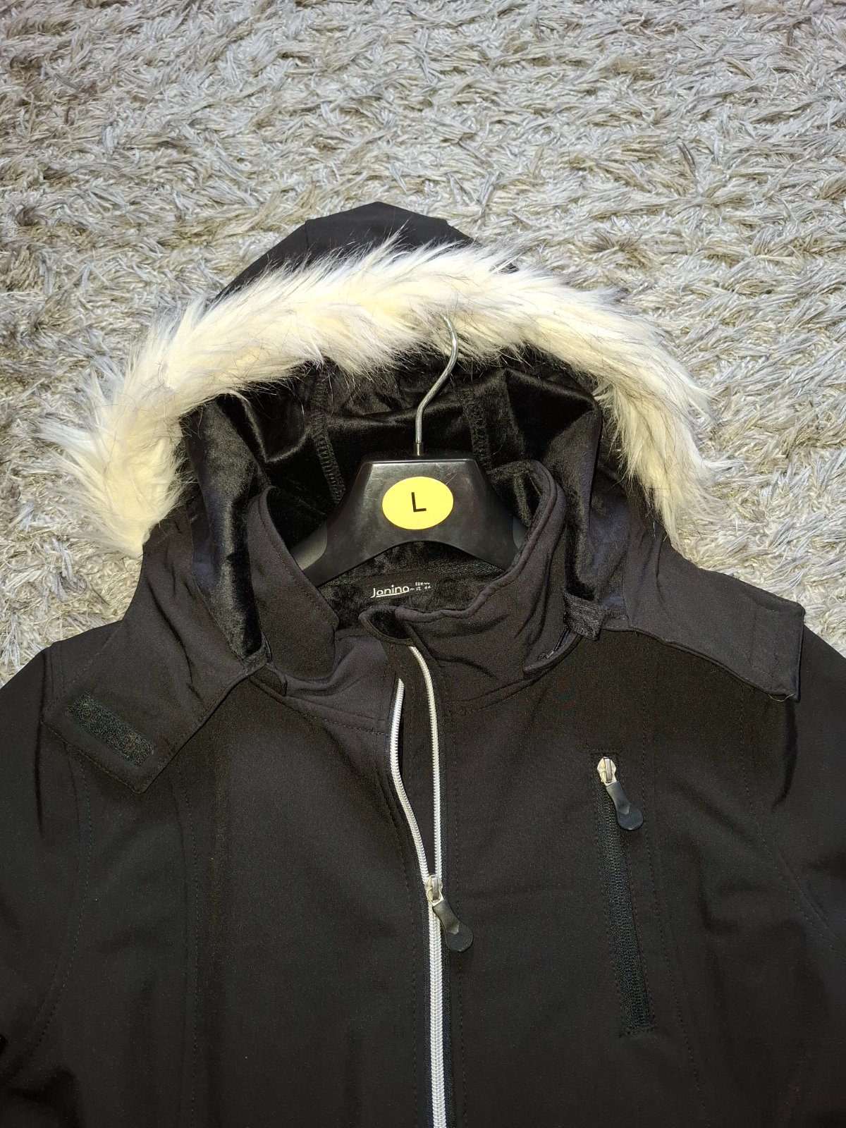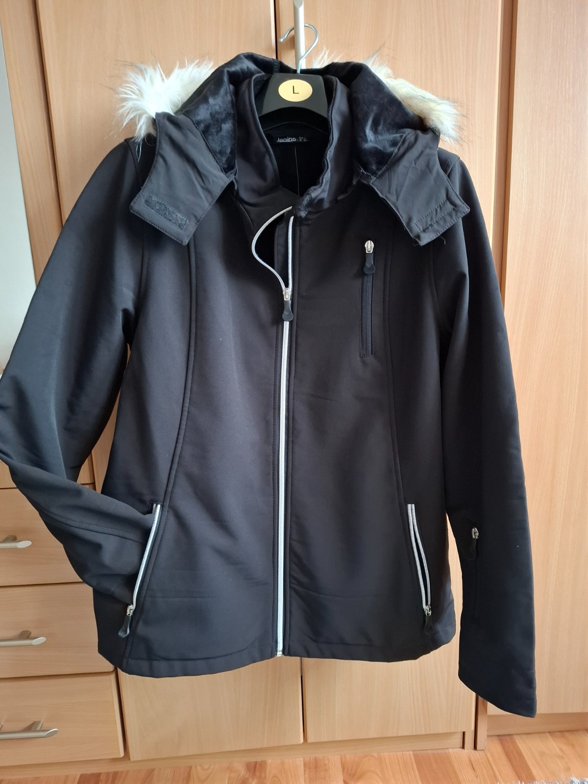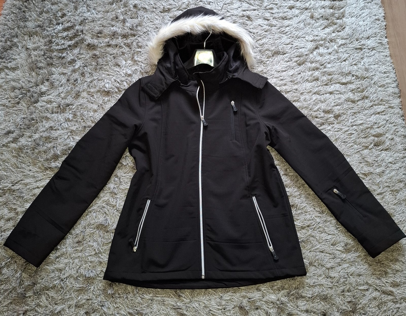 Krásna, čierna softshellova bunda, s bielou kožušinkou na kapucni.