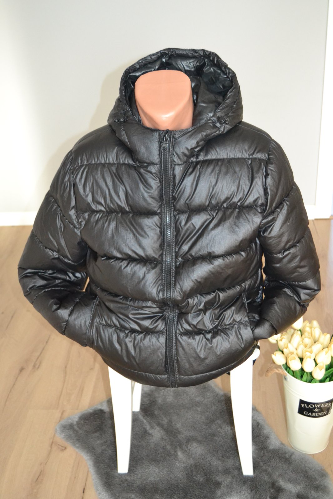 Zimná bunda čiernej farby, veľkosť M, vyrobená z prešívaného materiálu. Rozmery: obvod cez hrudník 2x60cm, rukávy 70 cm, dĺžka bundy 72 cm.