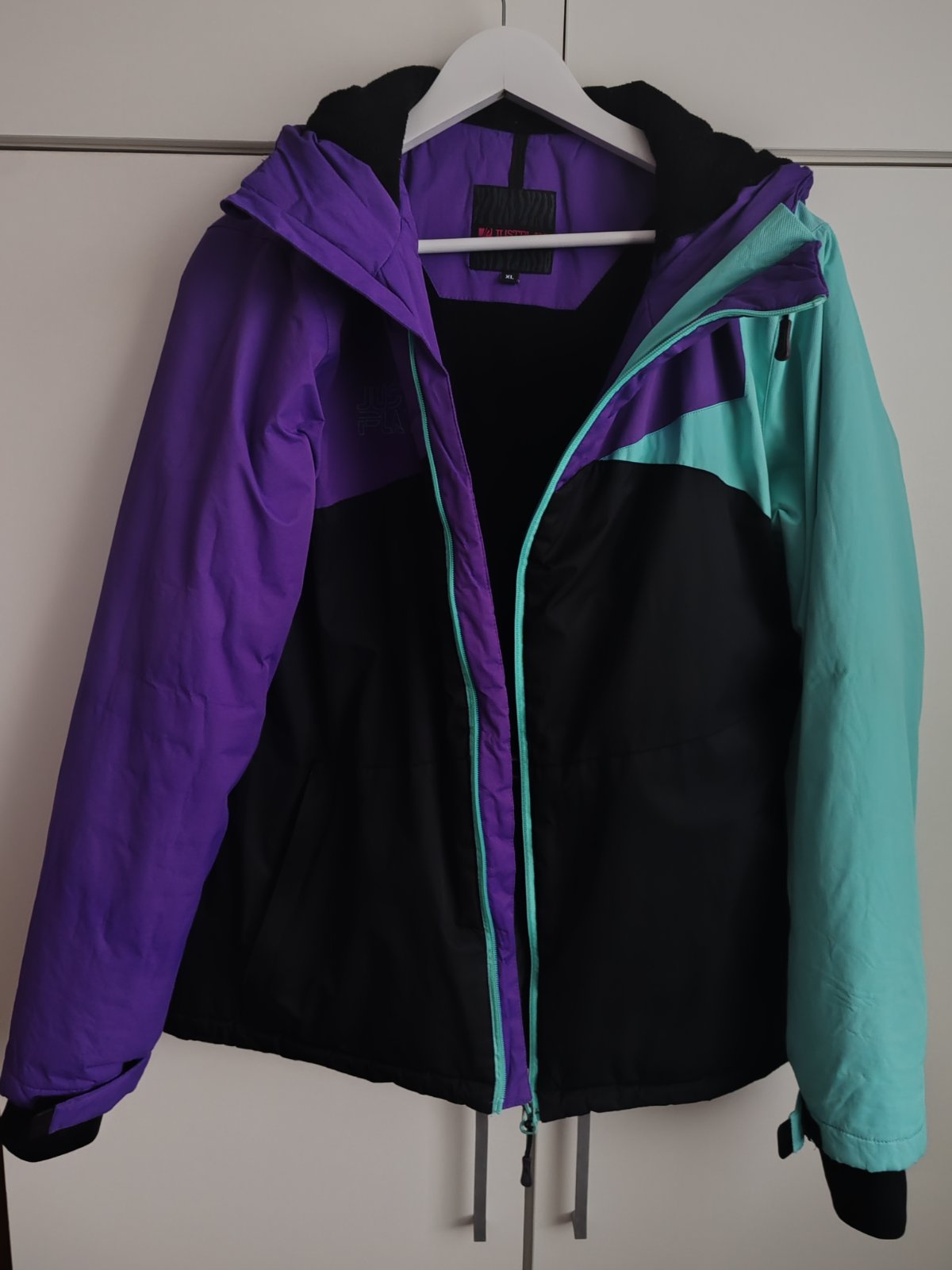 Predám dámsku lyžiarsku bundu zn. Justplay vel. XL vnútri oteplena fleesom, pekný stav. Všetky zipsy funkčné, jediné drobné poškodenie napis na chrbte vyblednutý a jedna tmava bodka blízko kapucne. Krásna farebná kombinácia fialovo-mentol-cierna