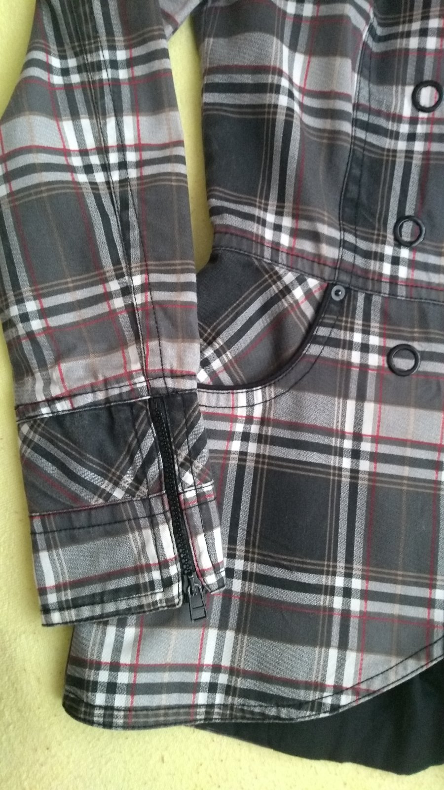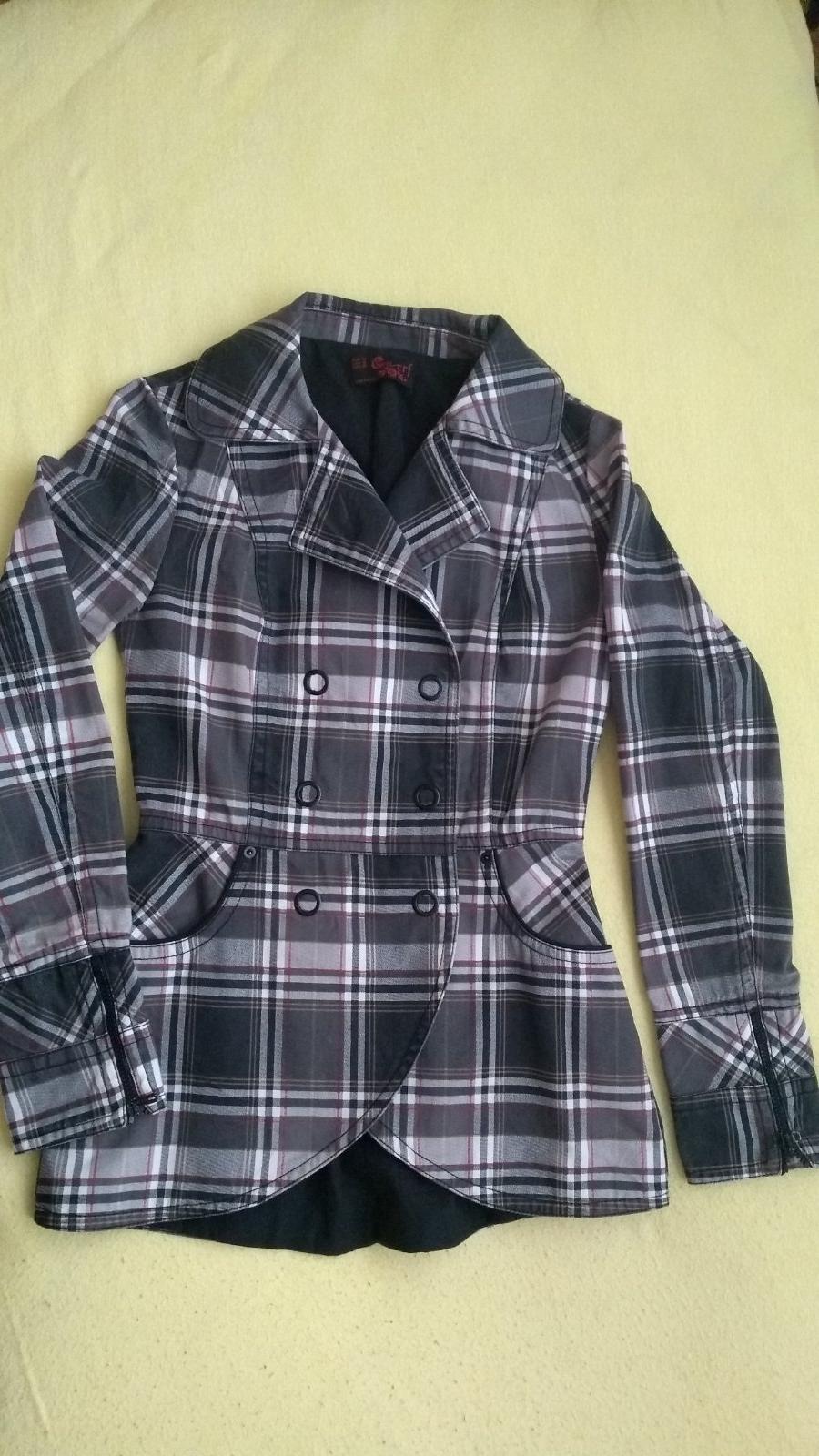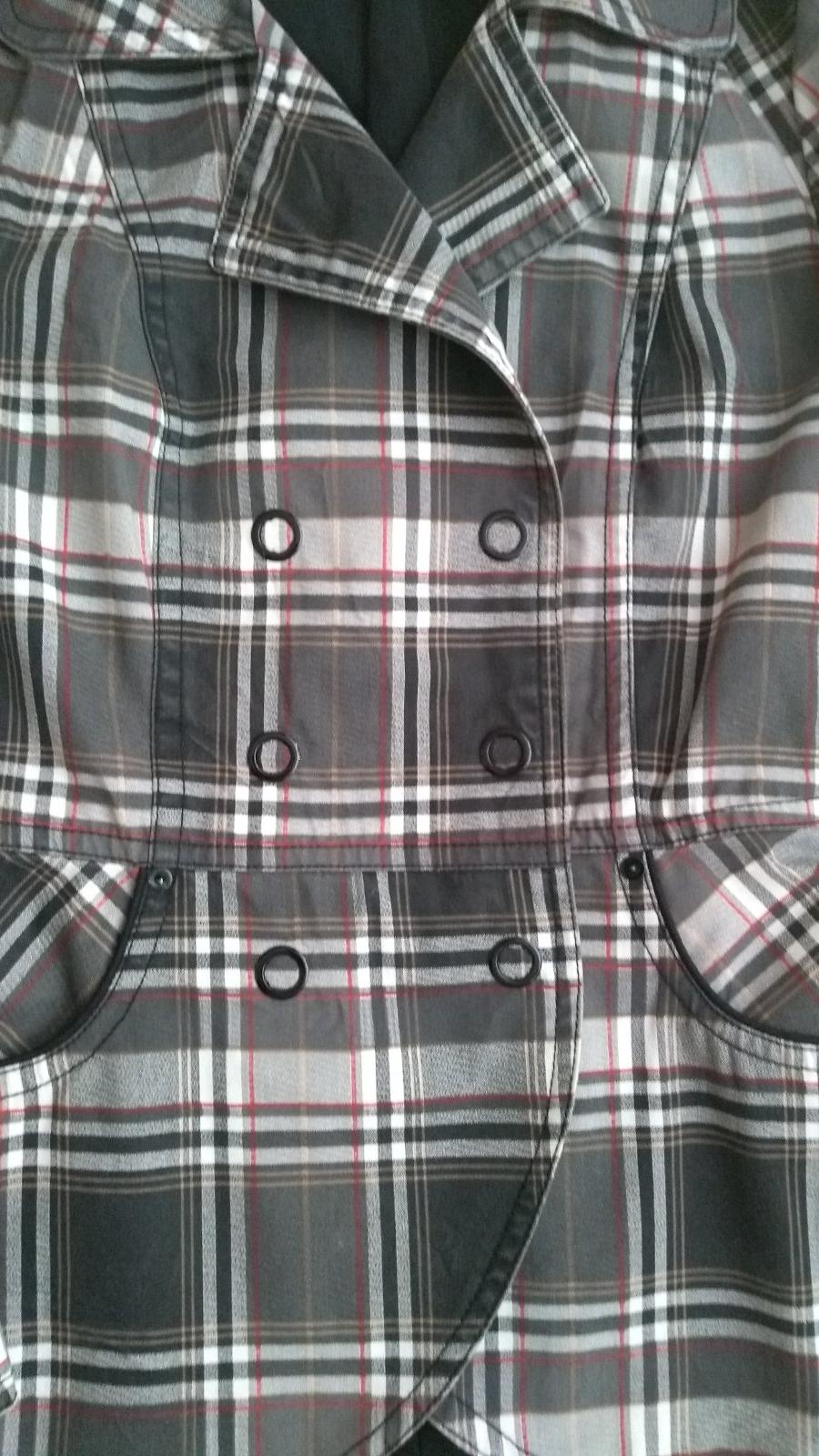 Prechodný kabát, podšitý, dvojradové zapínanie, vrecká. Na rukávoch všitý zips.