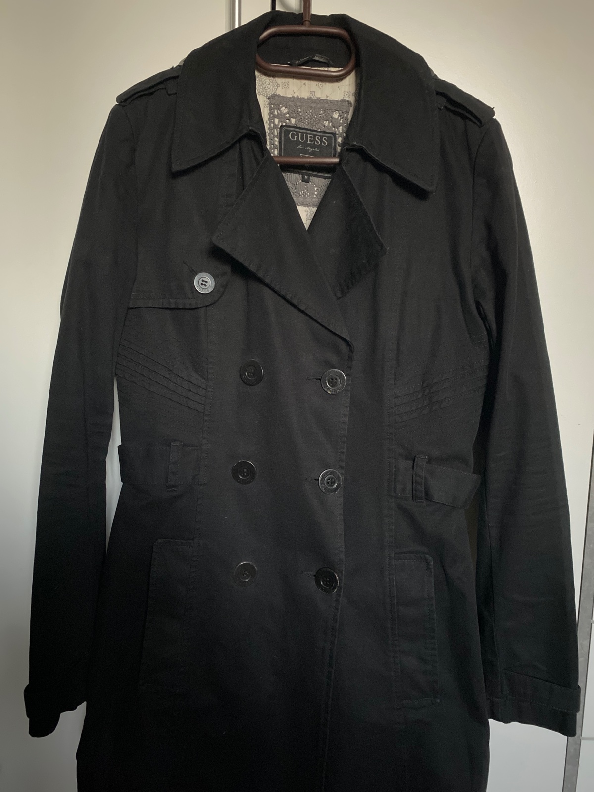Elegantný prechodný kabát trenčkot Guess, tvarovaný veľmi veľa detailov ozdobná podšívka, vrecká kvalitný materiál hrubší. Stav veľmi dobrý čistený raz v čistiarní.