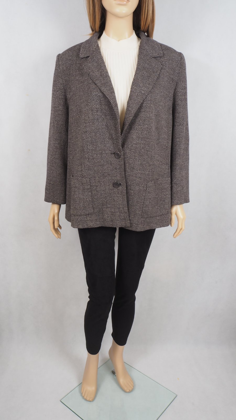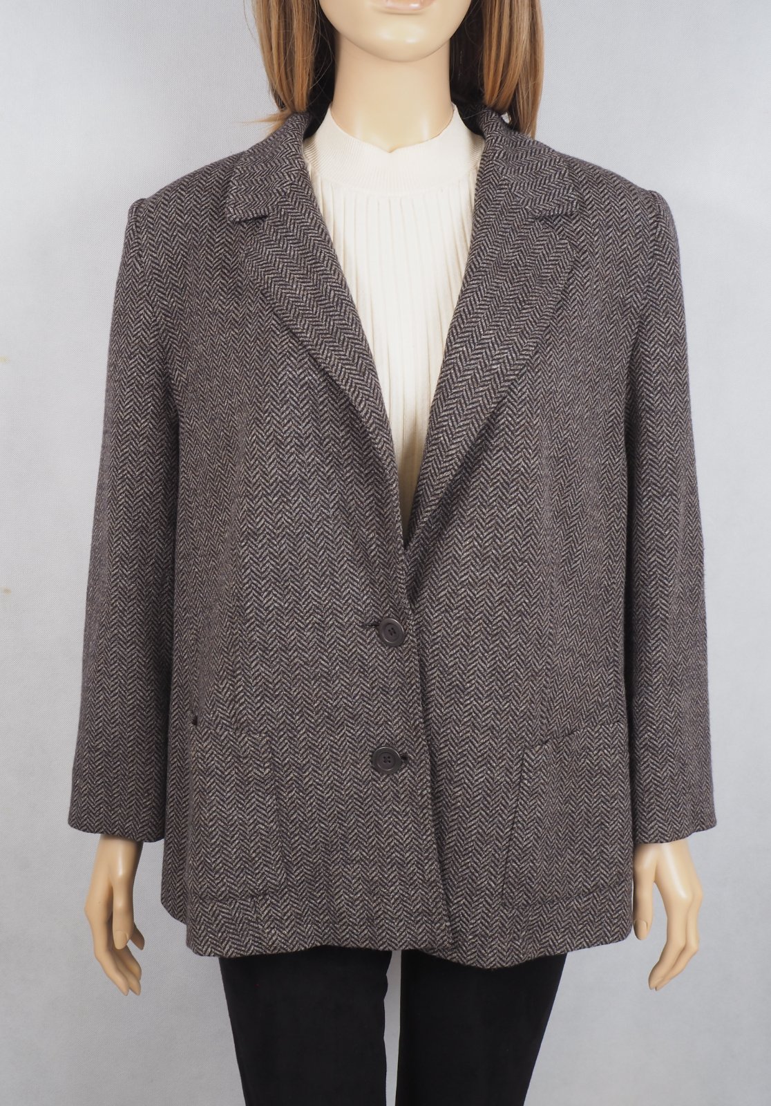 Luxusné dámske sako hnedej farby, zapínanie na gombíky, bez podšívky, materiál 44% vlna, 38% viskóza, 18% akryl, super stav.
