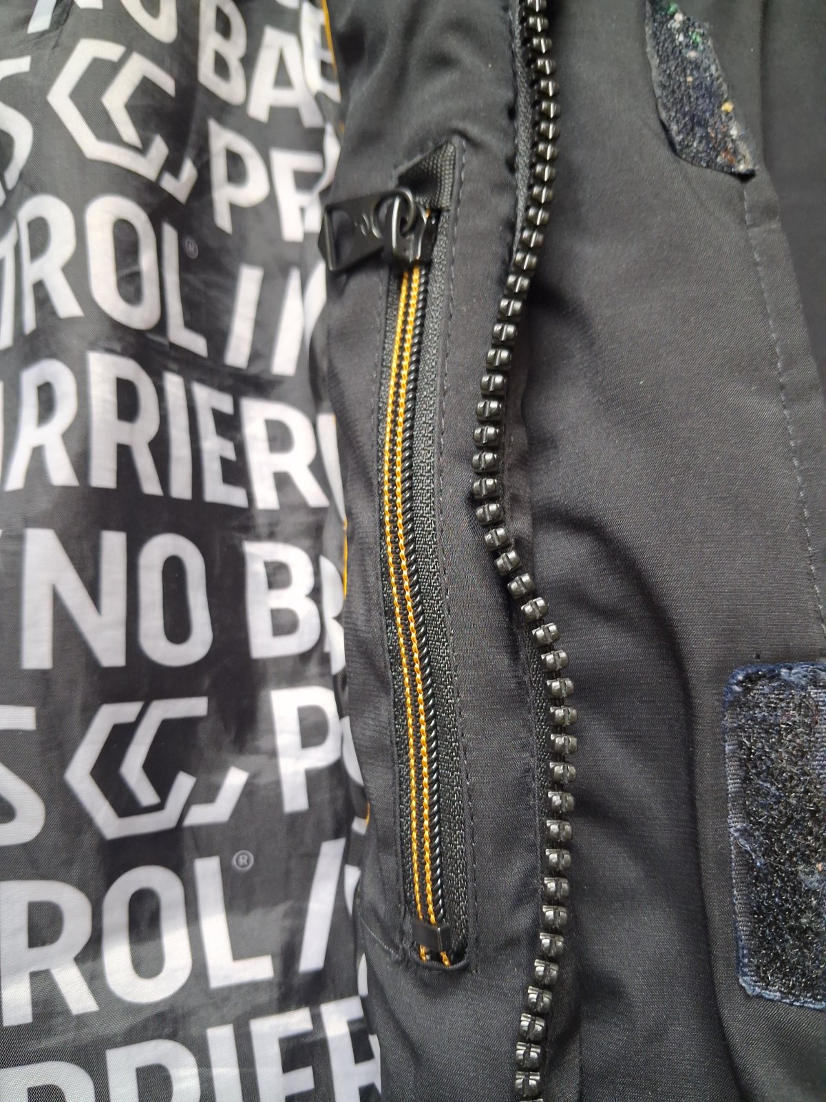 Super tepla bunda. Dobry noseny stav. Nenasla som chybu. Dvojite zapinanie (zips a nity), dvojite patenty na krku aj rukavoch... Kapucnu nemam... Dlzka 65cm, obcod 2×55cm, rukav od krku 70cm...