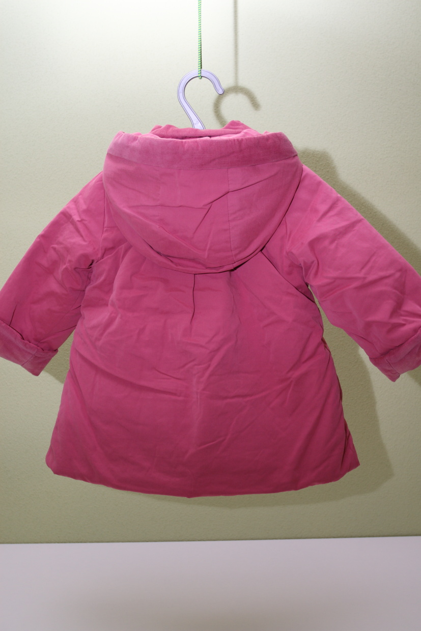 Tmavoružová vetrovka (kabát) s kapucňou má výborný strih, je veľmi teplá vhodná už na neskoršiu jeseň. Kapucňu je možné odopnúť.