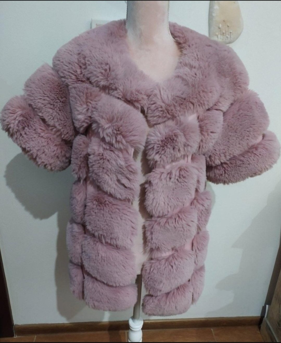 Príjemná kožušinová vesta, nenosená, púdrovoružovej farby. Veľkosť S-M. Dĺžka 83 cm