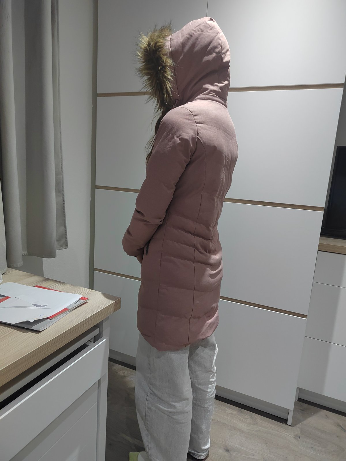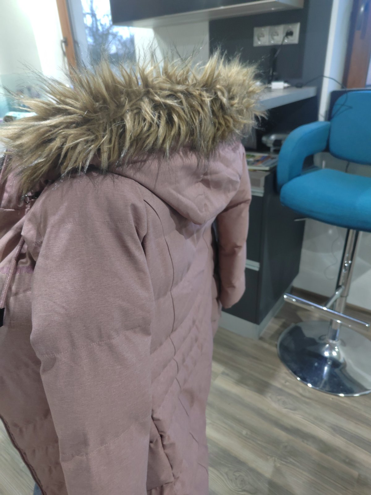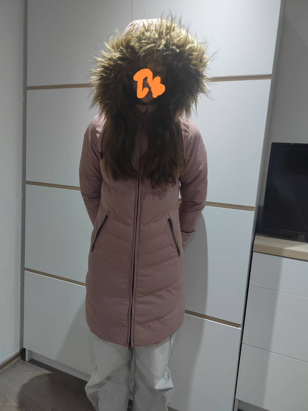 Krásna predĺžená bunda, farba je sivo ružová, zachovalá. Kapucňa sa dá odzipsovať, kožušina sa dá odopnúť. CD je 86cm, d. rukáva je 63cm, š. chrbát a je 48cm, v páse je zúžená a š. je 44cm.