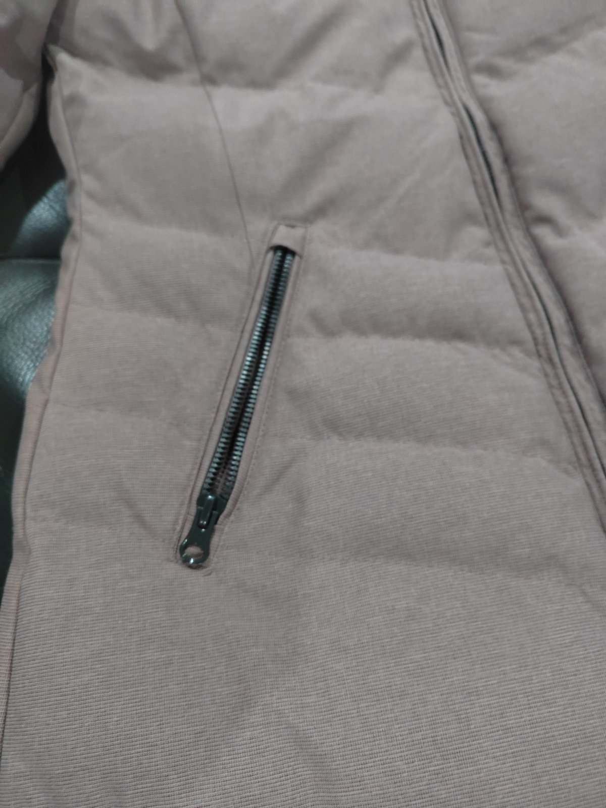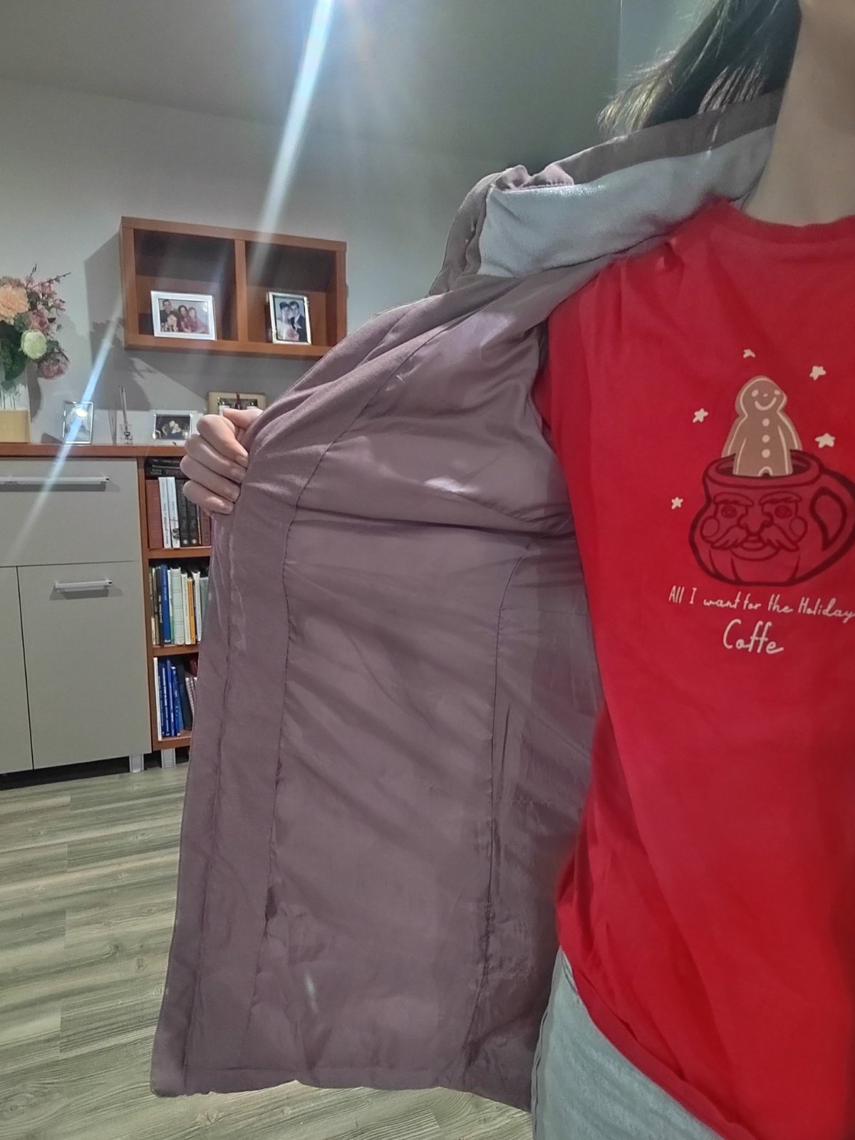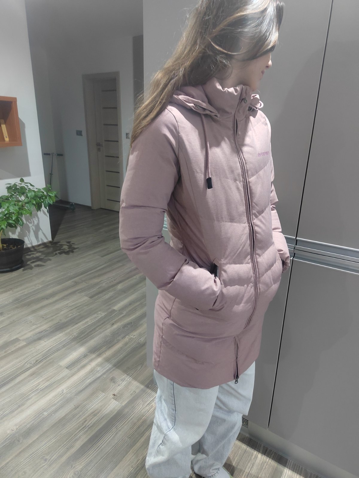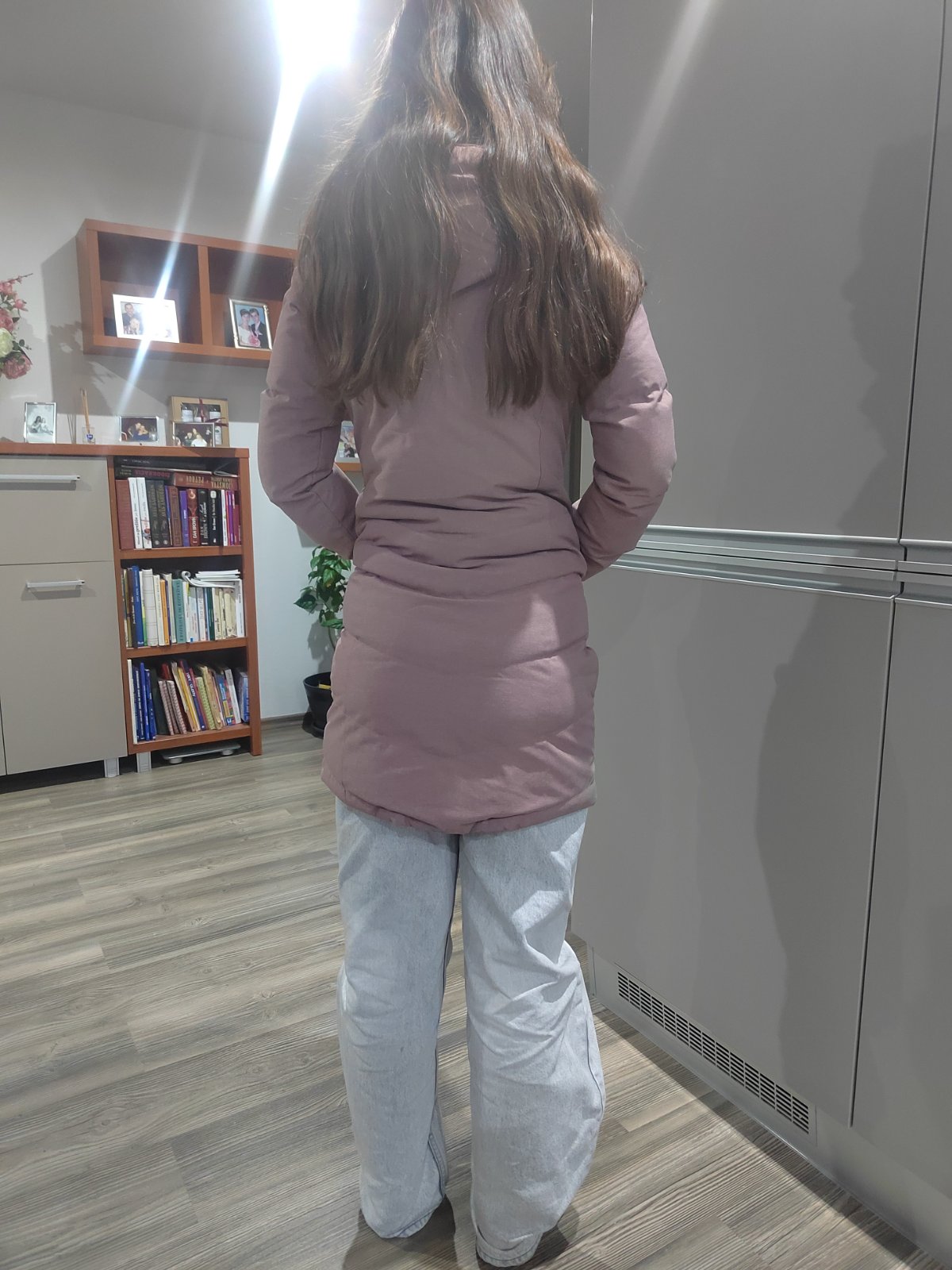 Krásna predĺžená bunda, farba je sivo ružová, zachovalá. Kapucňa sa dá odzipsovať, kožušina sa dá odopnúť. CD je 86cm, d. rukáva je 63cm, š. chrbát a je 48cm, v páse je zúžená a š. je 44cm.