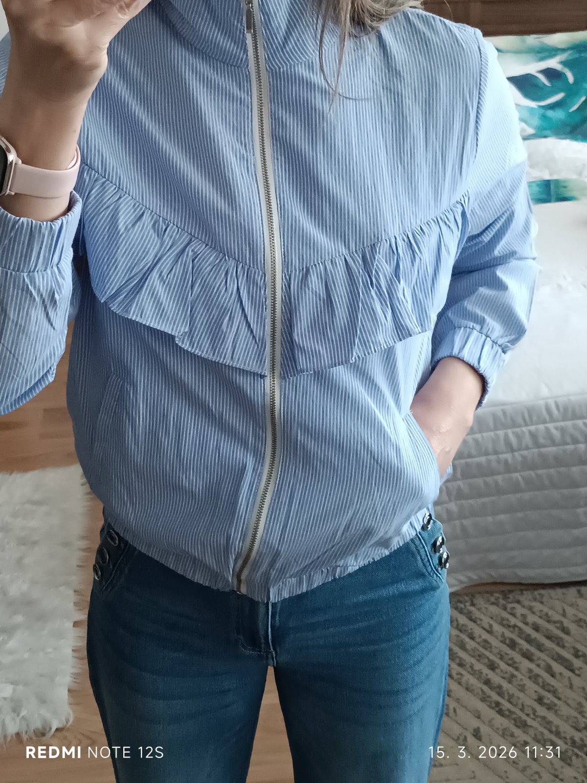 Bundička je tenká, vhodná na letné večery, má jemný biely pásik, oblečie S- Šírka pod pazuchami 52 CM, dĺžka od krku nadol 59 CM, dĺžka rukáva 61 cm