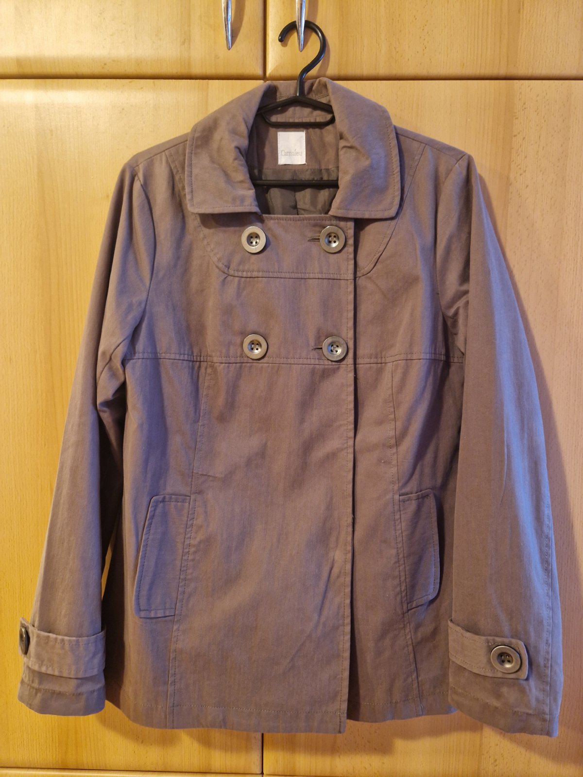 Dámsky - možno 2 krát oblečený- kabátik s golierikom značky Camaieu. Šírka pod pazuchami 49cm, dĺžka 62cm, rukáv od krku 75cm.