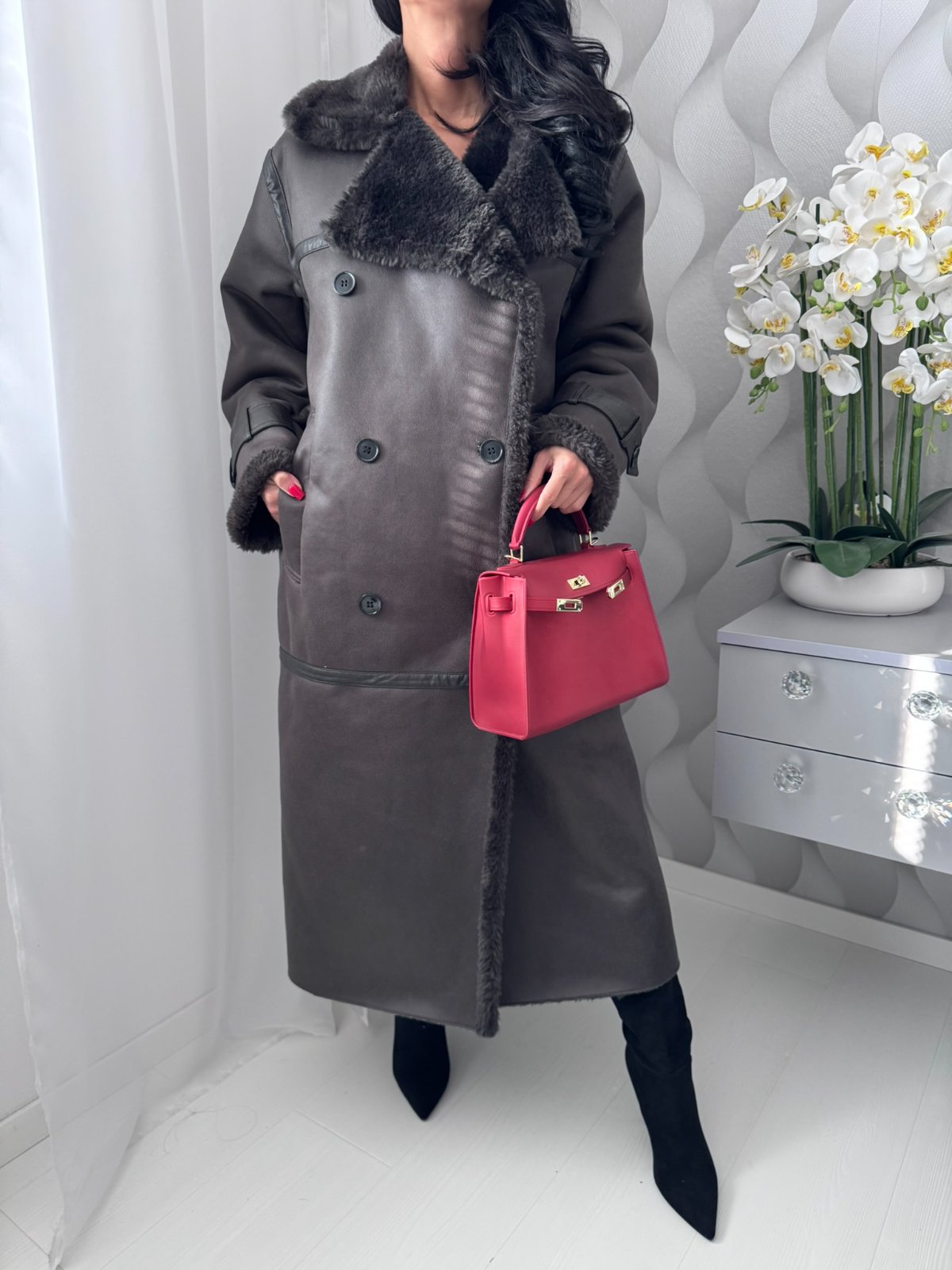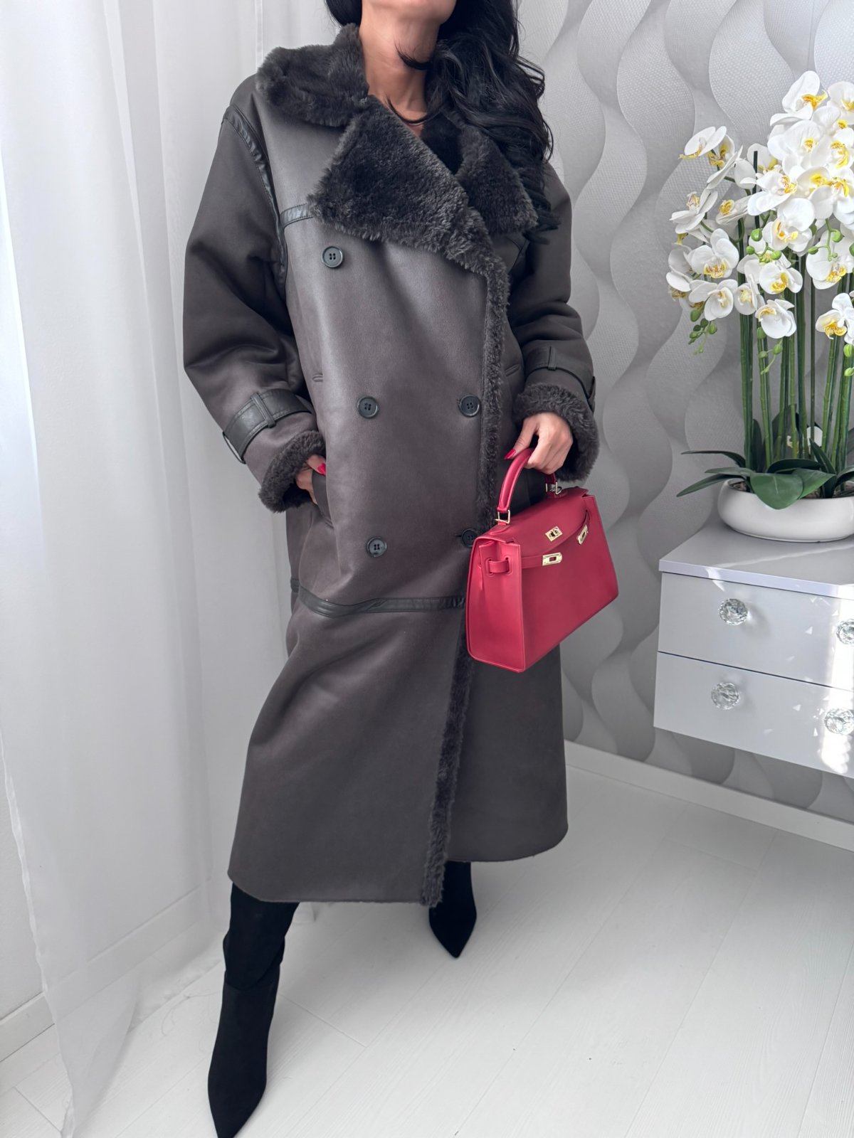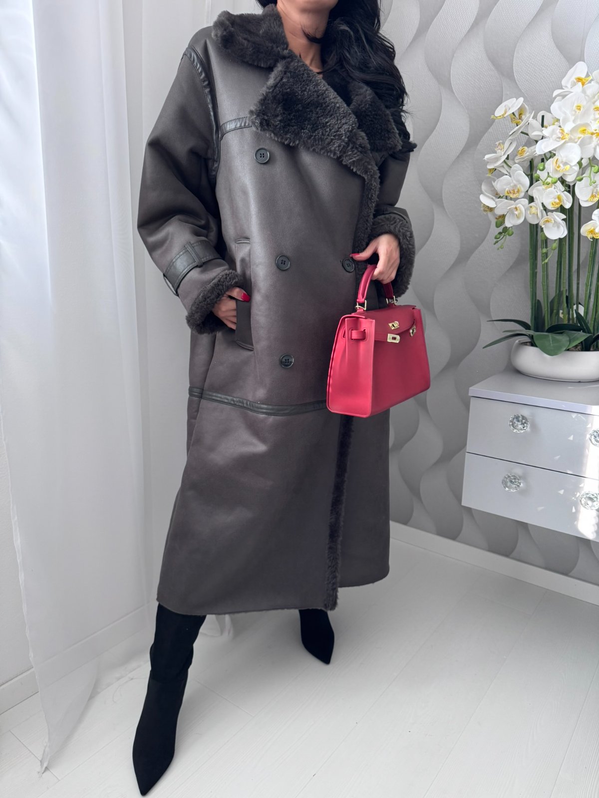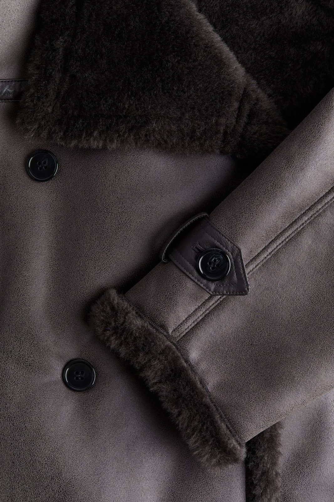 Dvojradový kabát do pol lýtok z materiálu s povrchovou úpravou.