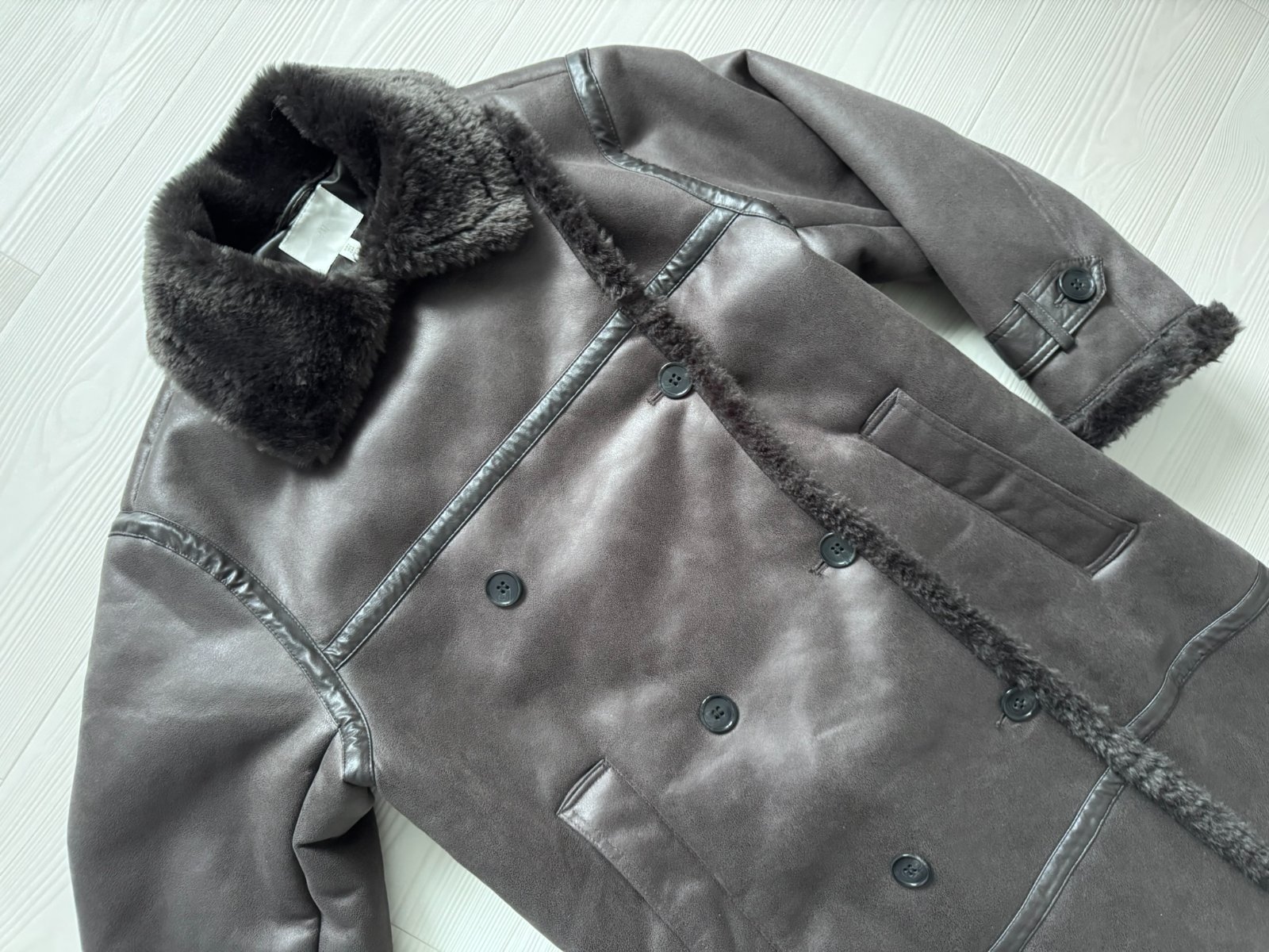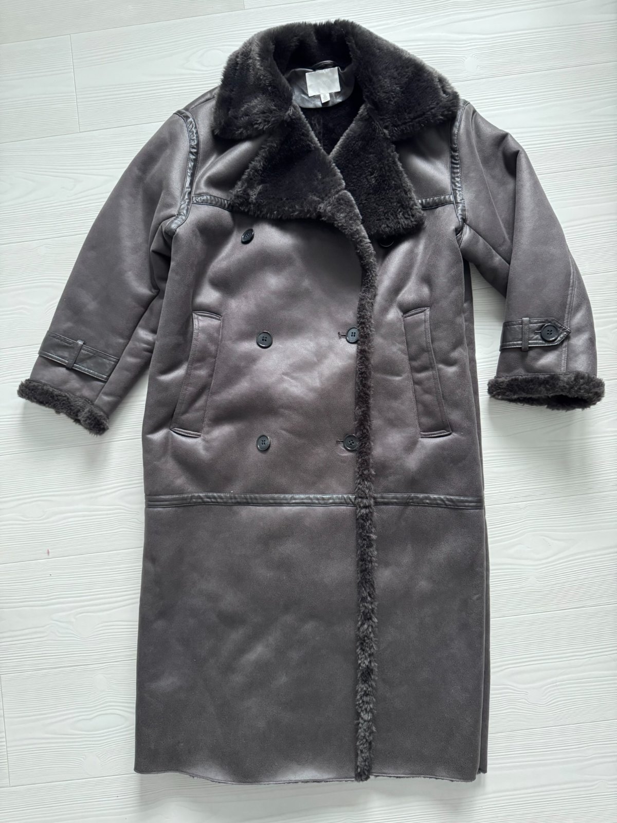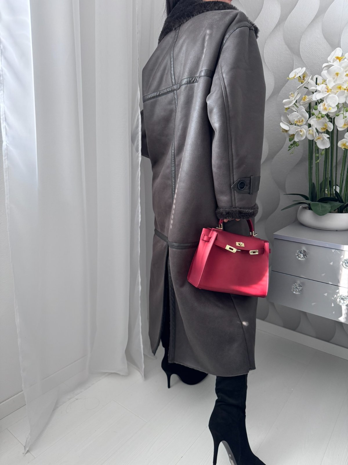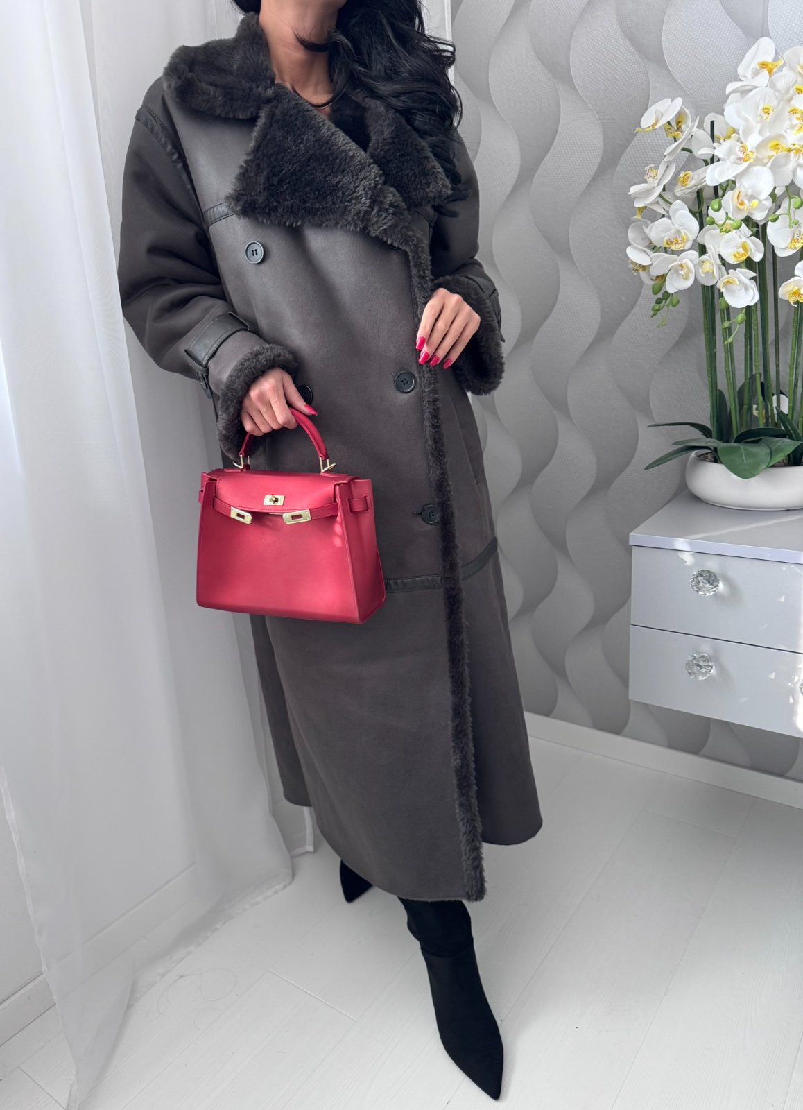 Dvojradový kabát do pol lýtok z materiálu s povrchovou úpravou.