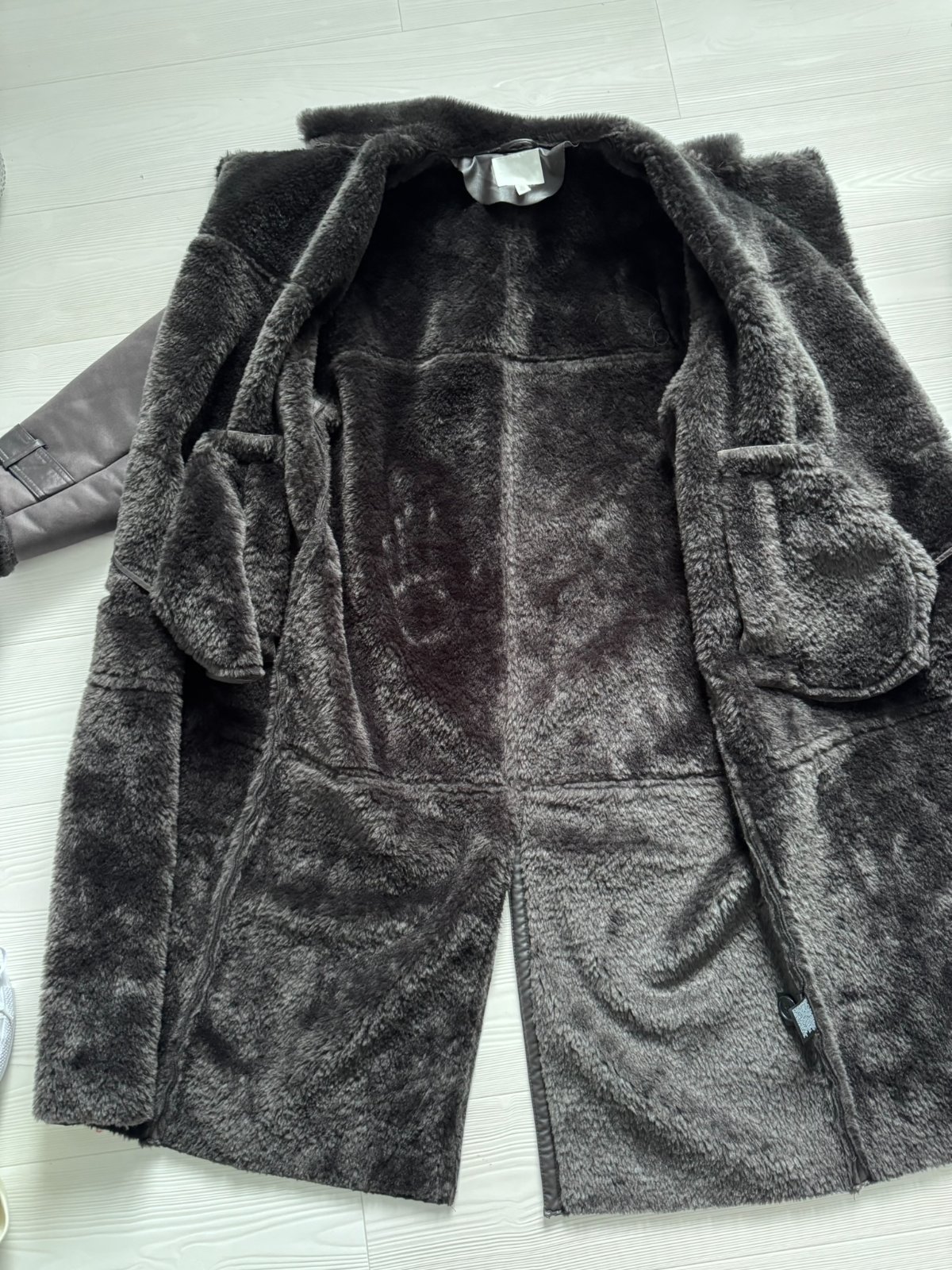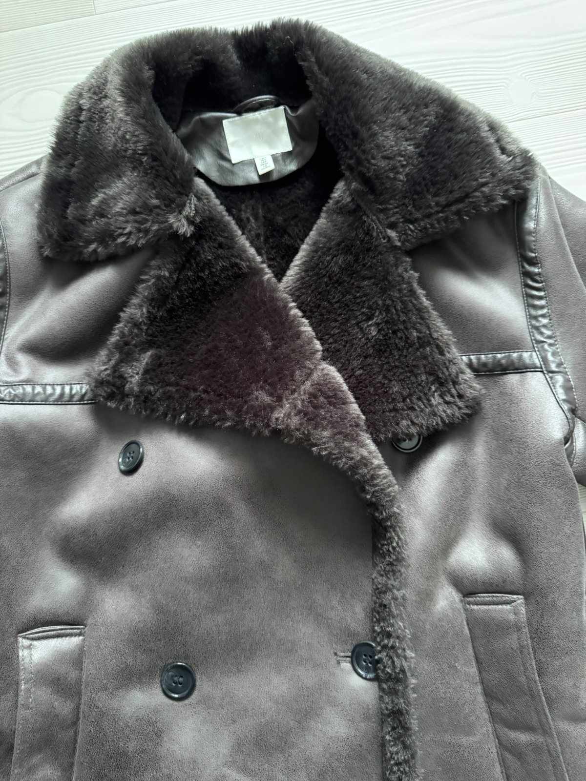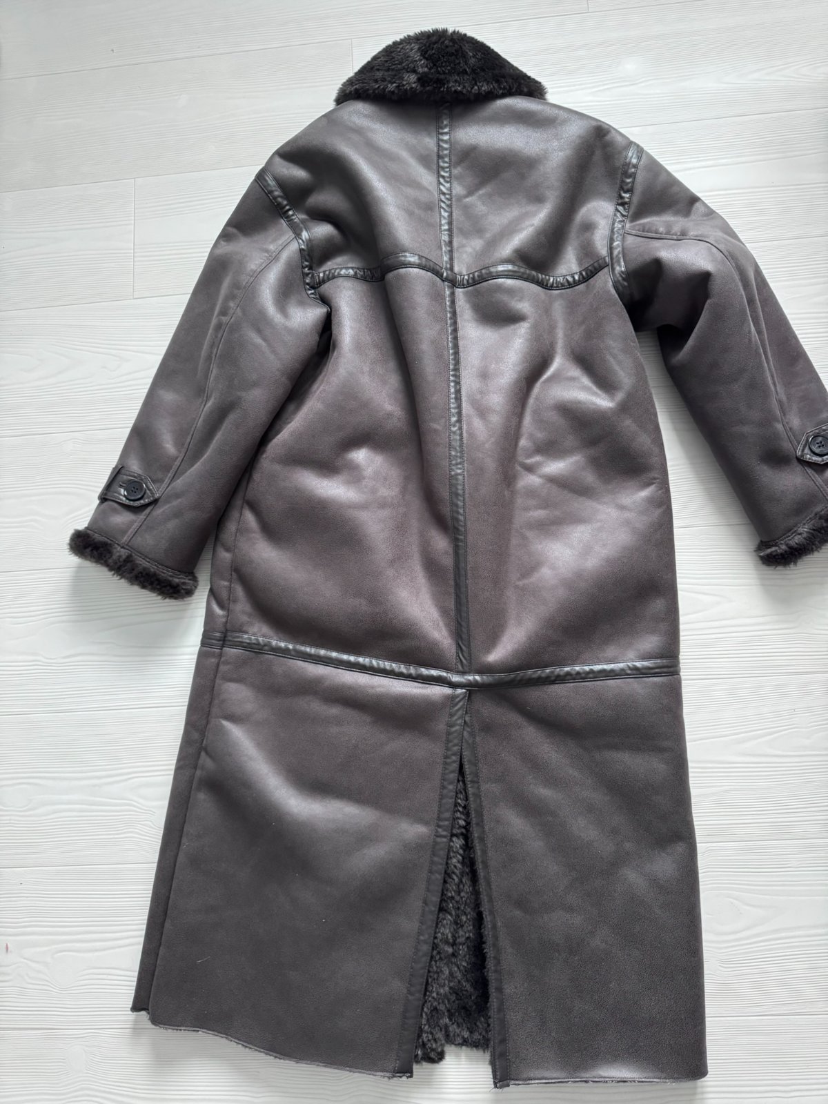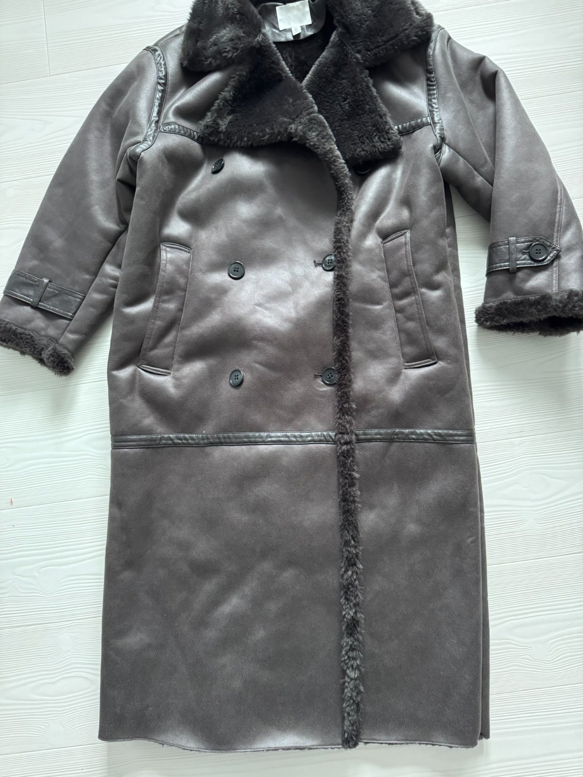 Dvojradový kabát do pol lýtok z materiálu s povrchovou úpravou.