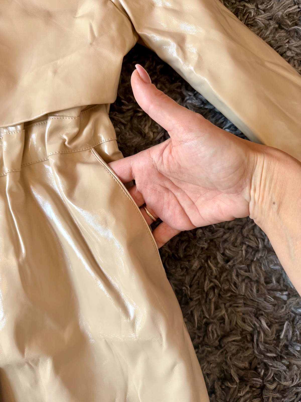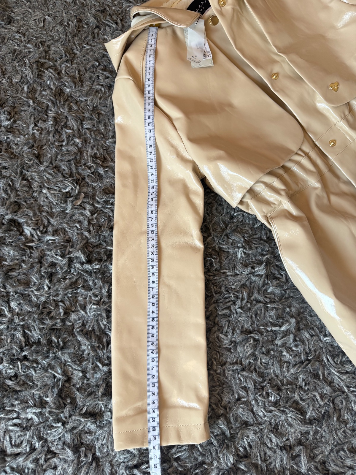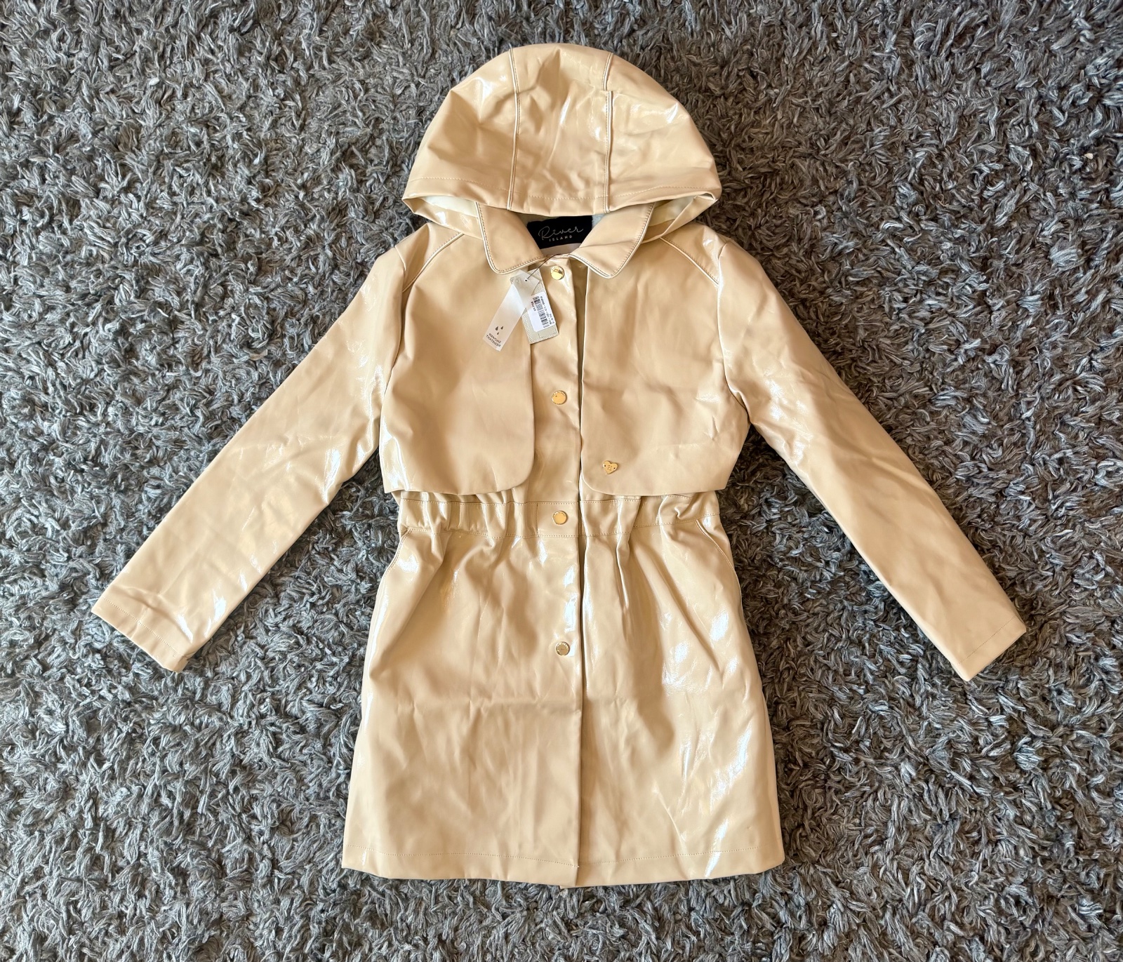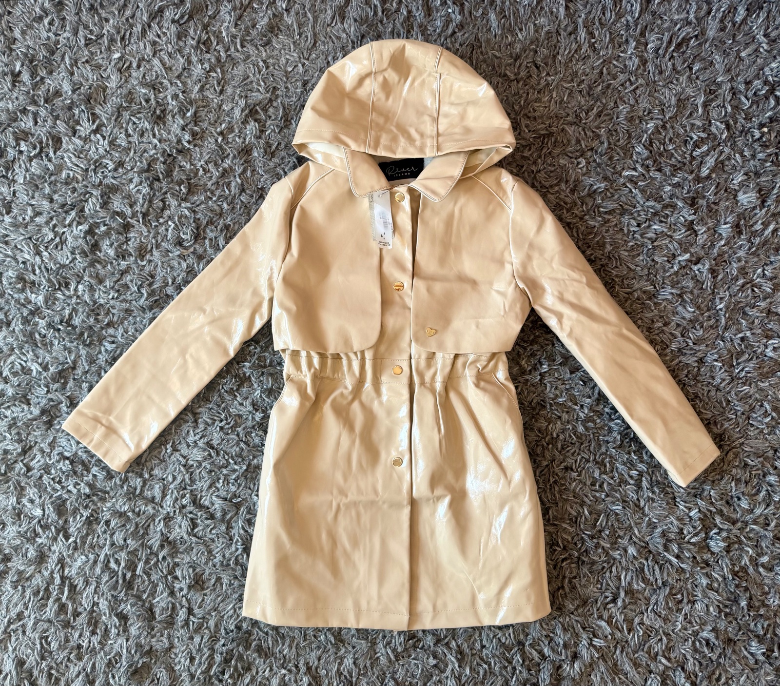 Na hrudi sú zateplené, kapucna sa nedá zložit. Zapínanie: krásne zlate zacvakavacie gombíky. Material mi pride ako synticka gumena koža, 100% nepremokavý, pevny.