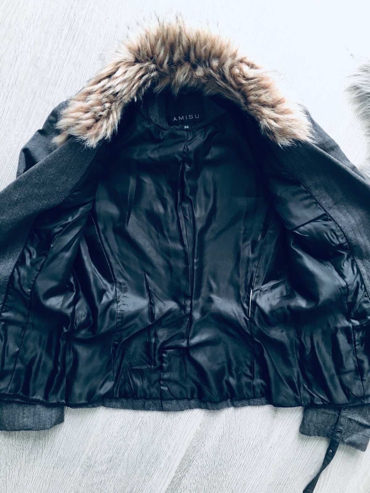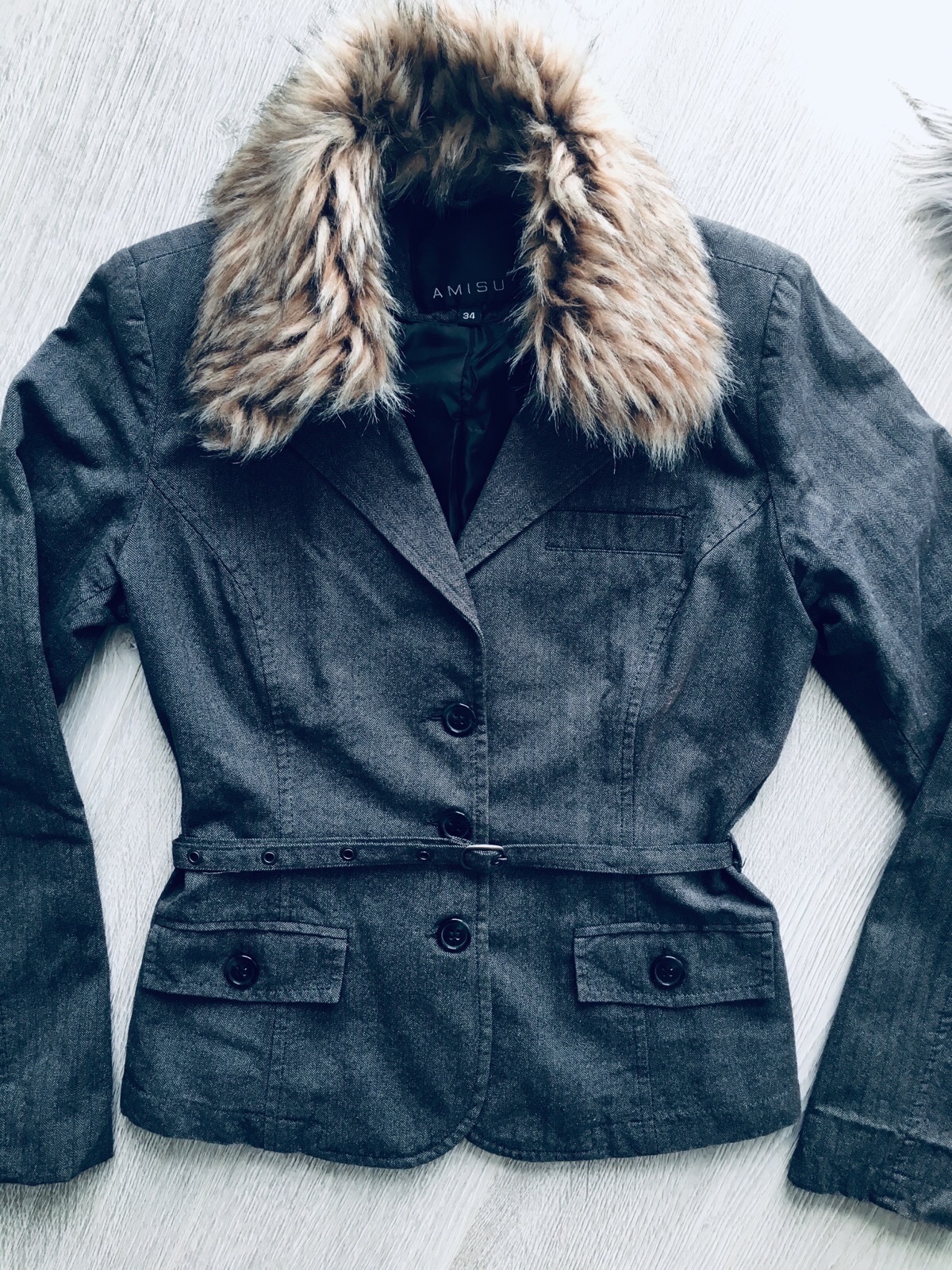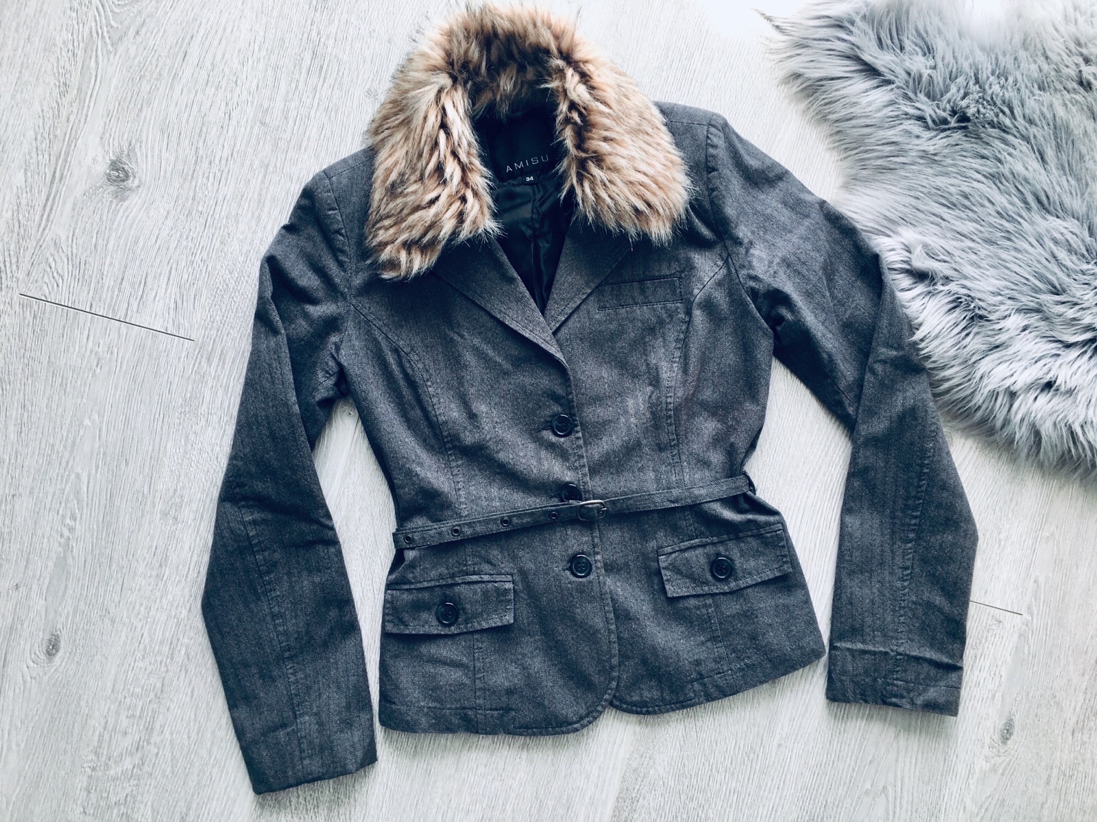 Sako Amisu s odnímateľnou kožušinou a opaskom na regulovanie pásu. Zapínanie na 3 gombíky. Spredu dve vrecká, nosené, no vo veľmi dobrom stave, veľkosť XS.